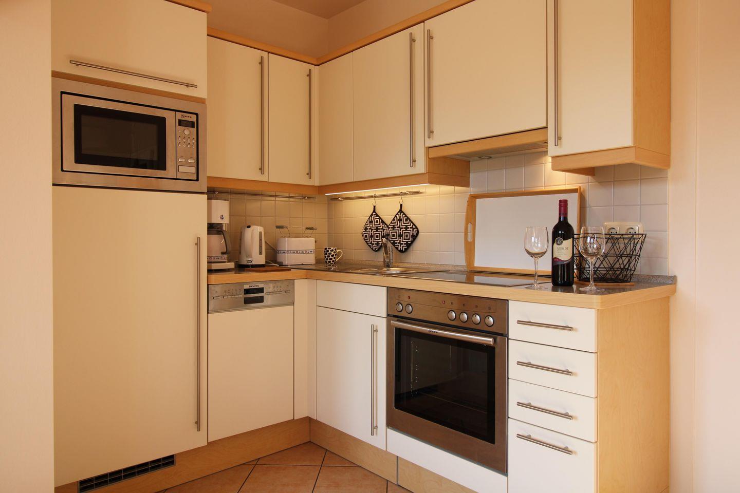 Die offene Wohnküche beinhaltet eine voll ausgestattete Einbauküchenzeile in gehobener Ausstattung mit 4-Platten-Ceran-Kochfeld, Backofen, Dunstabzug, Mikrowelle, Kühlschrank mit Gefrierfach, Geschirrspülmaschine, Kaffeemaschine, Wasserkocher und Toaster. Die Küche ist mit Geschirr, Gläsern, Besteck und Töpfen bestens und vollständig ausgestattet.