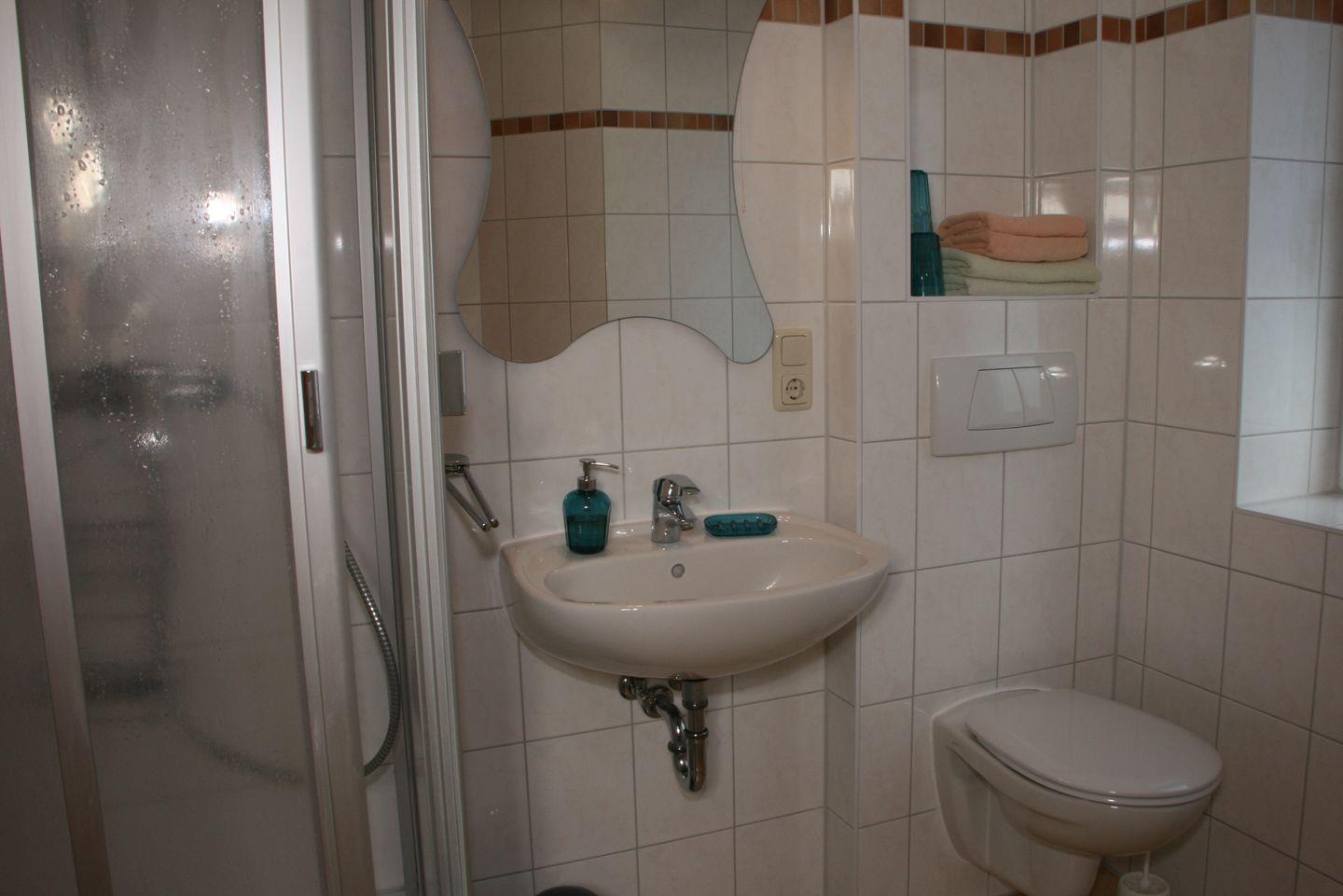 Das Hauptbadezimmer im Erdgeschoss hat eine großzügige befahrbare Dusche.