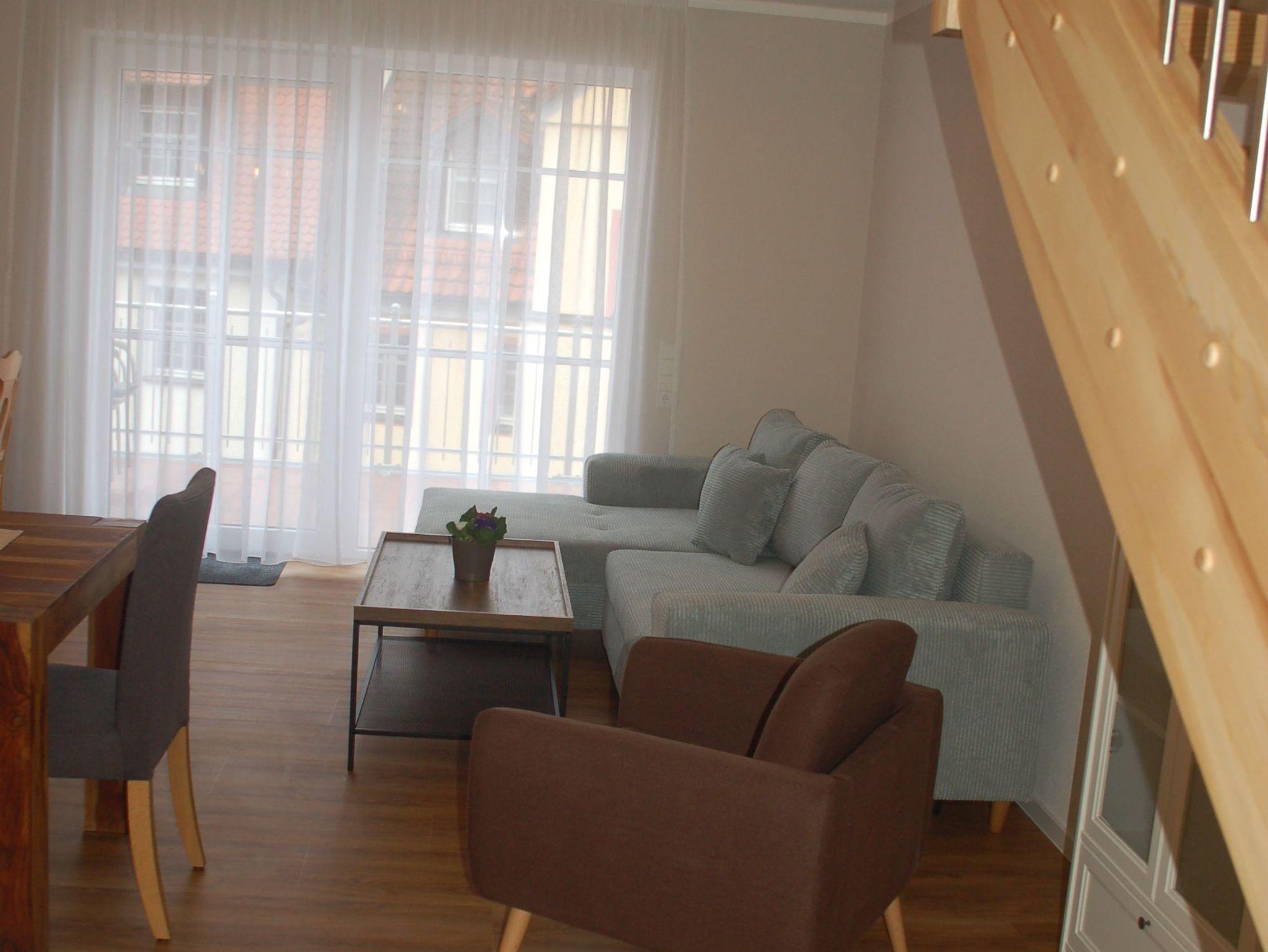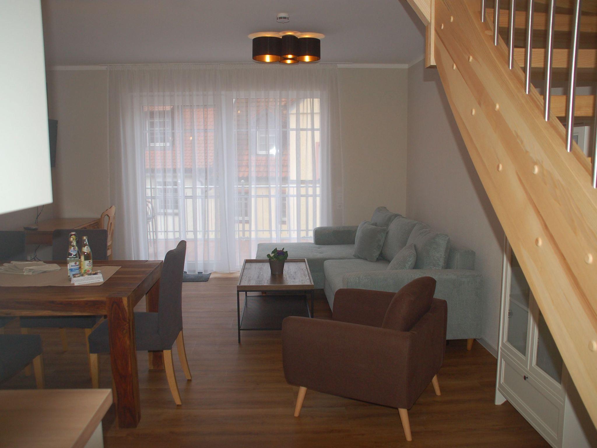 Die Maisonette Wohnungen erstrecken sich über zwei Ebenen. Im unteren Bereich befindet sich ein großzügiges Badezimmer mit schwellenloser Dusche und WC. Der große Wohn-/Essbereich ist mit einer komplett ausgestatteten Küchenzeile, einem großen Esstisch und einer gemütlichen Couch bestückt. Ein terrassenähnlicher Balkon in Süd-/West-Ausrichtung rundet die hervorragende Ausstattung ab und lädt sowohl zum Sonne genießen als auch zum Essen im Freien ein. Über eine bequem begehbare Holztreppe aus heimischem Ahorn erreichen unsere Gäste die im oberen Bereich gelegenen zwei Schlafzimmer sowie das separate WC.