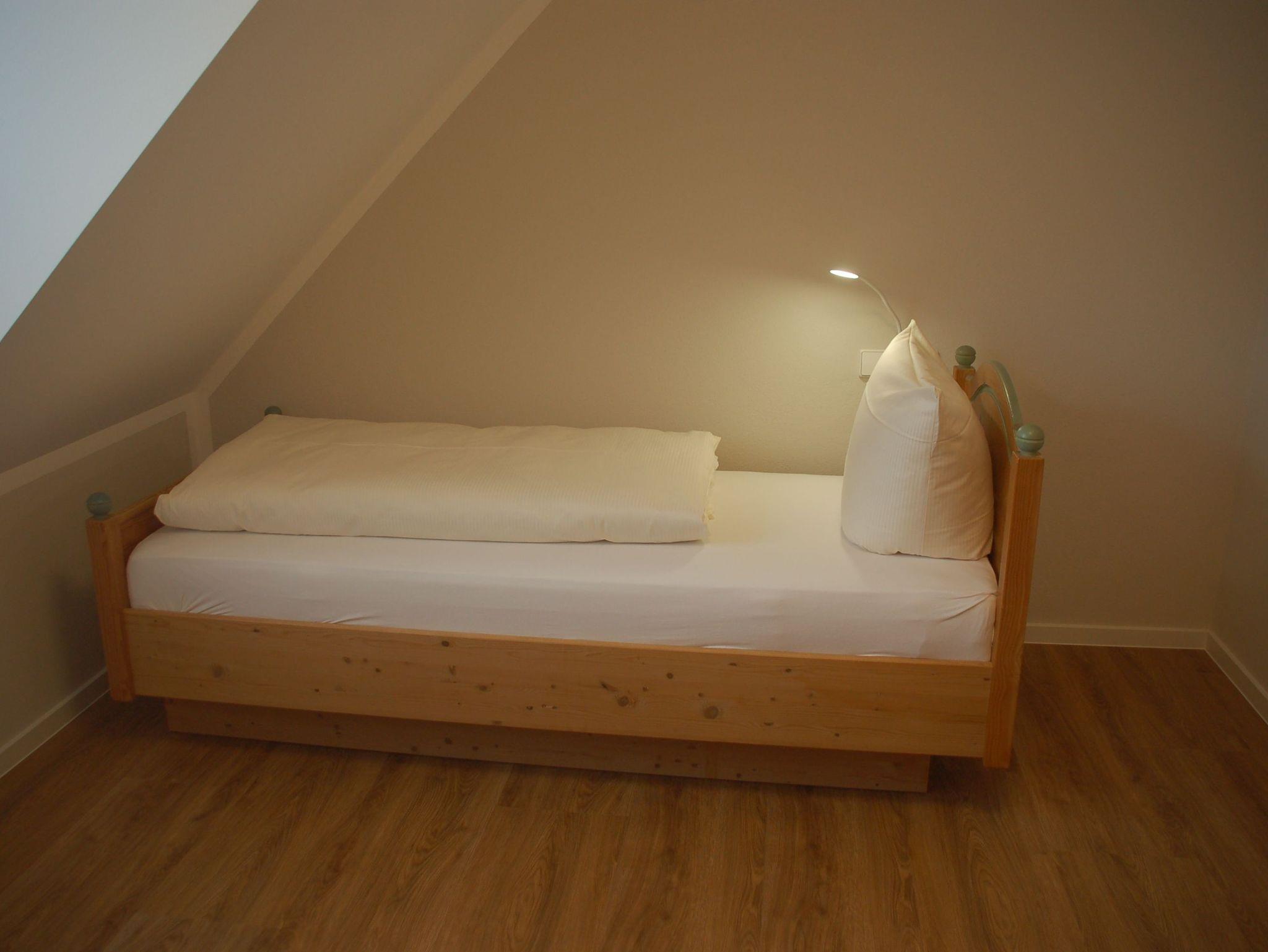 Die Mühlen-Maisonette Wohnung 4 kann über eine Verbindungstür mit der Mühlen-Maisonette Wohnung 3 verbunden werden. Im Elternschlafzimmer erwartet unsere Gäste eine 180 cm breites Boxspringbett sowie ein 140 cm langes Kinder-Gitterbett.