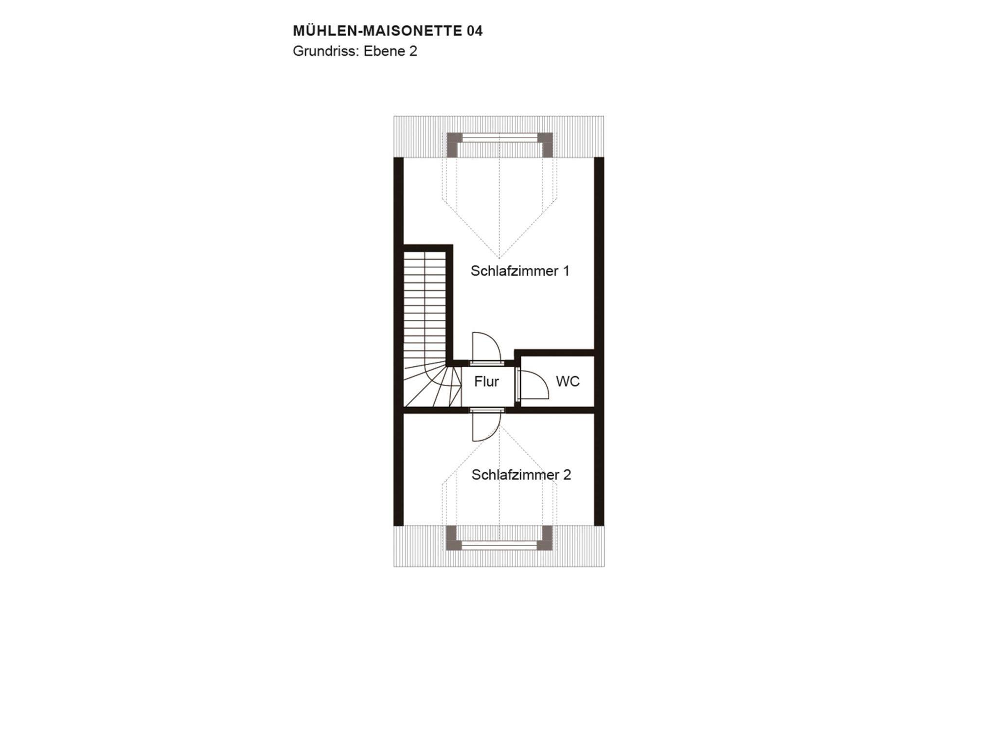Die Mühlen-Maisonette Wohnungen sind über einen überdachten Laubengang erschlossen. Jede Wohnung verfügt über einen eigenen Zugang direkt zum Laubengang und einen direkt am Laubengang positionierten Parkplatz.