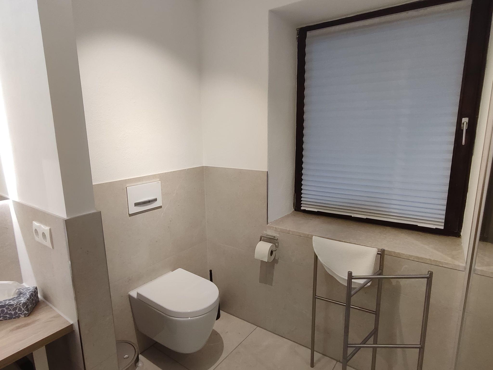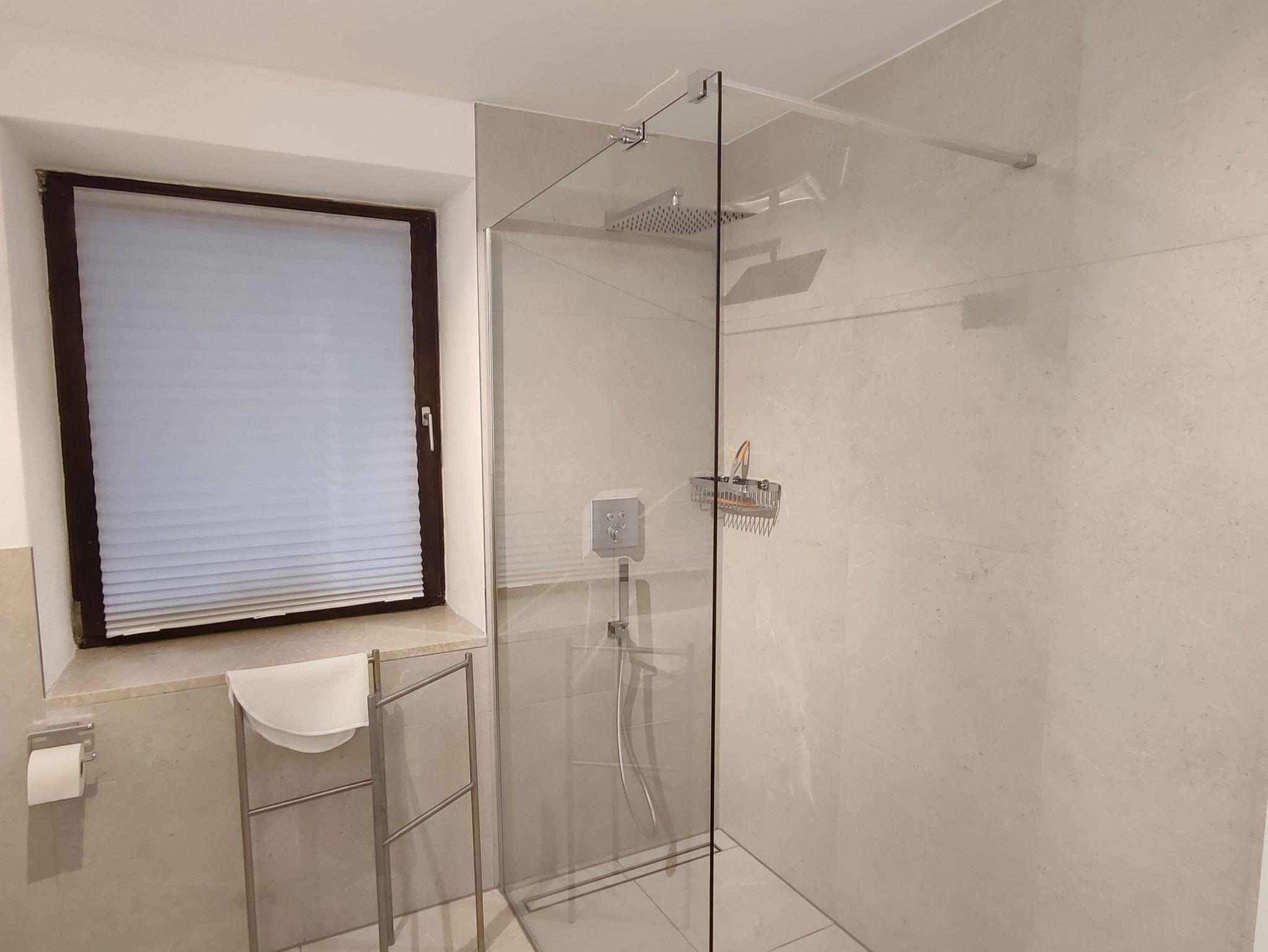 Premium Doppelzimmer im Erdgeschoss mit stilvollem modernem Badezimmer zum Wohlfühlen mit Boxspring-Hotel Betten, kostenlosem WLAN, einem TV Kleiderschrank und Sitzbereich. Das stilvollem modernem Badezimmer zum Wohlfühlen verfügt über eine geräumige begehbare Dusche, ein Waschbecken und eine Toilette.