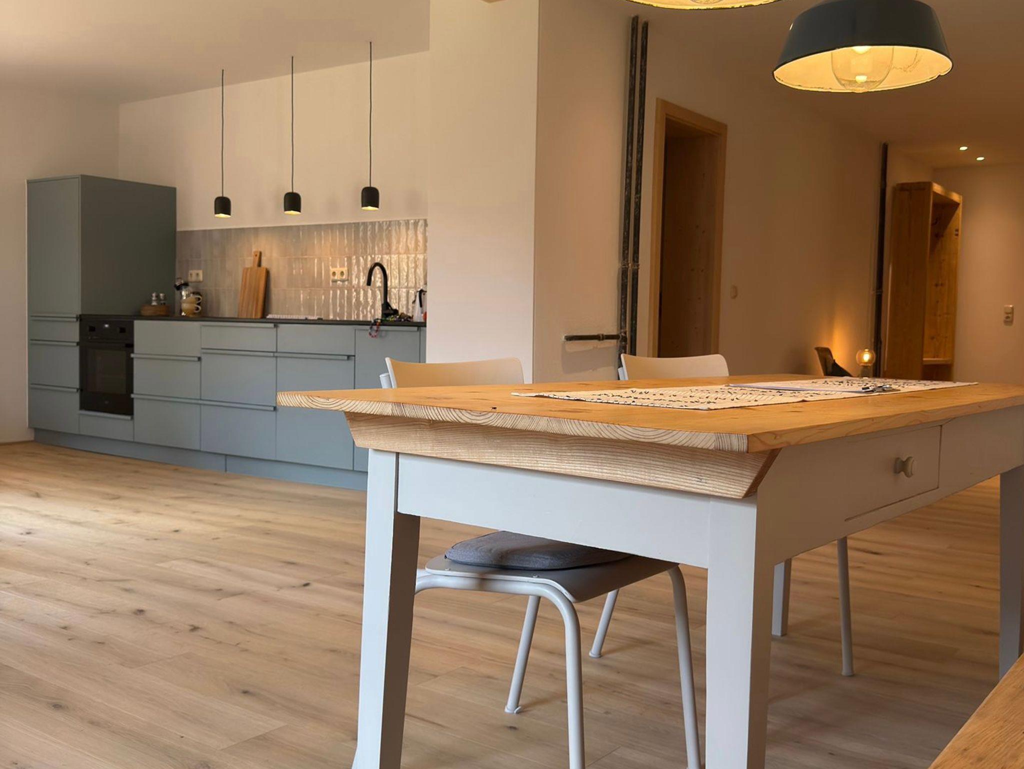 Die beiden Schlafzimmer sind mit handgefertigten Zirbenholz-Doppelbetten ausgestattet und sorgen für erholsamen Schlaf. Herzstück der Wohnung ist die offene Schreinerküche, ausgestattet mit Induktionskochfeld, Spülmaschine und hochwertigen Geräten – perfekt für gemeinsame Kochabende.