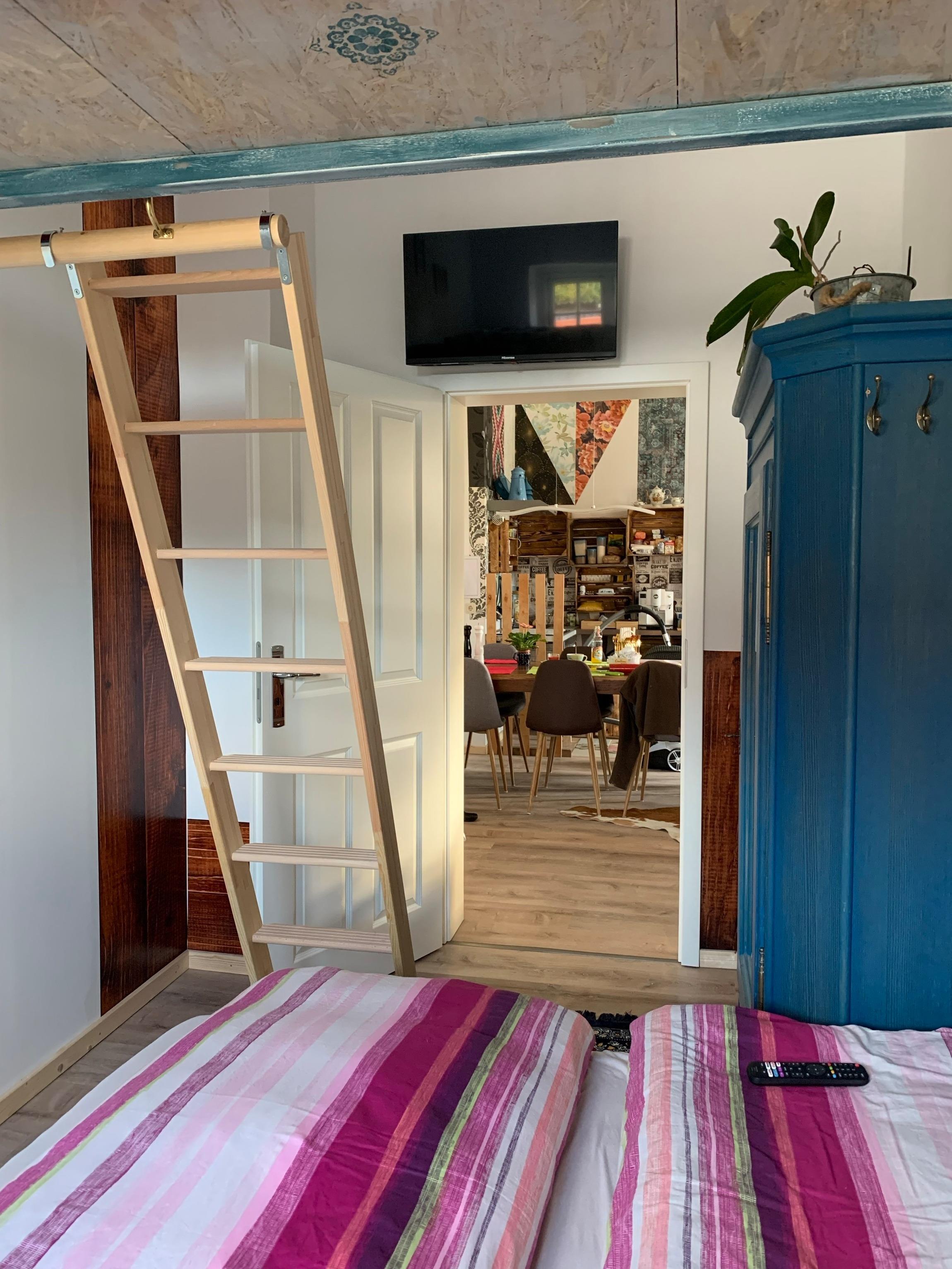 Die Wohnung besitzt ein großes Schlafsofa, mit Einlagerungskästen. Ein separates Schlafzimmer mit Hochbett und einem Doppelbett. Ein Duschbad, eine große Küche, mit Herd, Geschirrspüler, Kühlschrank mit Gefrierfach, Küchengeräte und einen Essbereich.