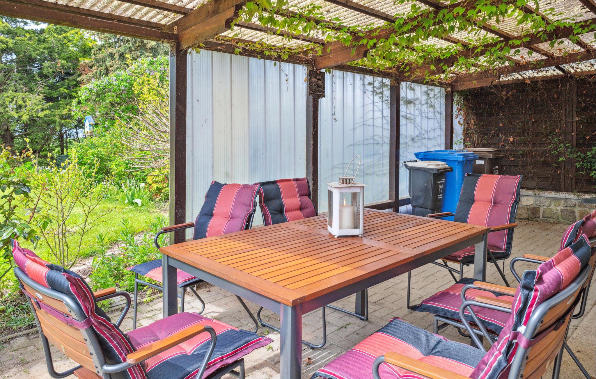 Die mit Pflanzen verzierte überdachte Terrasse ist der ideale Ort zum Verweilen und Entspannen, während Ihre Kinder auf dem Rasen Ballspiele spielen. Hier können Sie abends auch grillen und am Tisch gemeinsam speisen.
