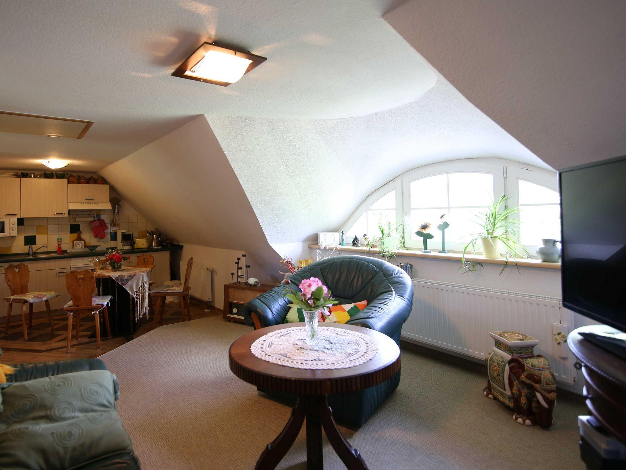 Die Ferienwohnung im Obergeschoss ist komfortabel ausgestattet und hat einen separaten Eingang. Auf ca. 90 qm befinden sich Schlaf- und Wohnraum. Eine offene Küche und Aufbettungsmöglichkeit sowie ein Badezimmer. Der Garten kann mitgenutzt werden.