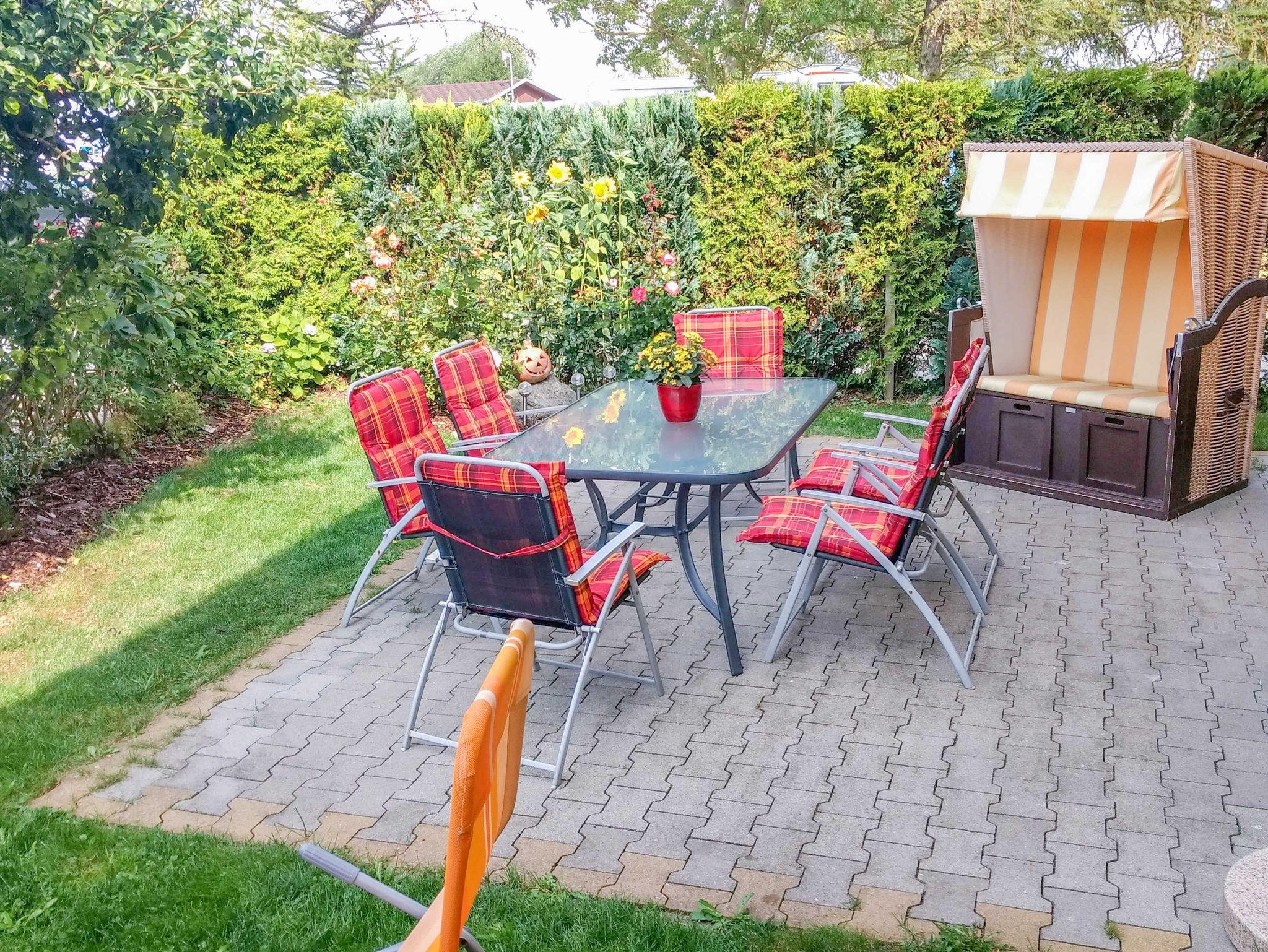 Im Außenbereich steht Ihnen eine schöne große Terrasse mit Gartenmöbeln, Sonnenliegen und einem eigenen Strandkorb zur Verfügung.