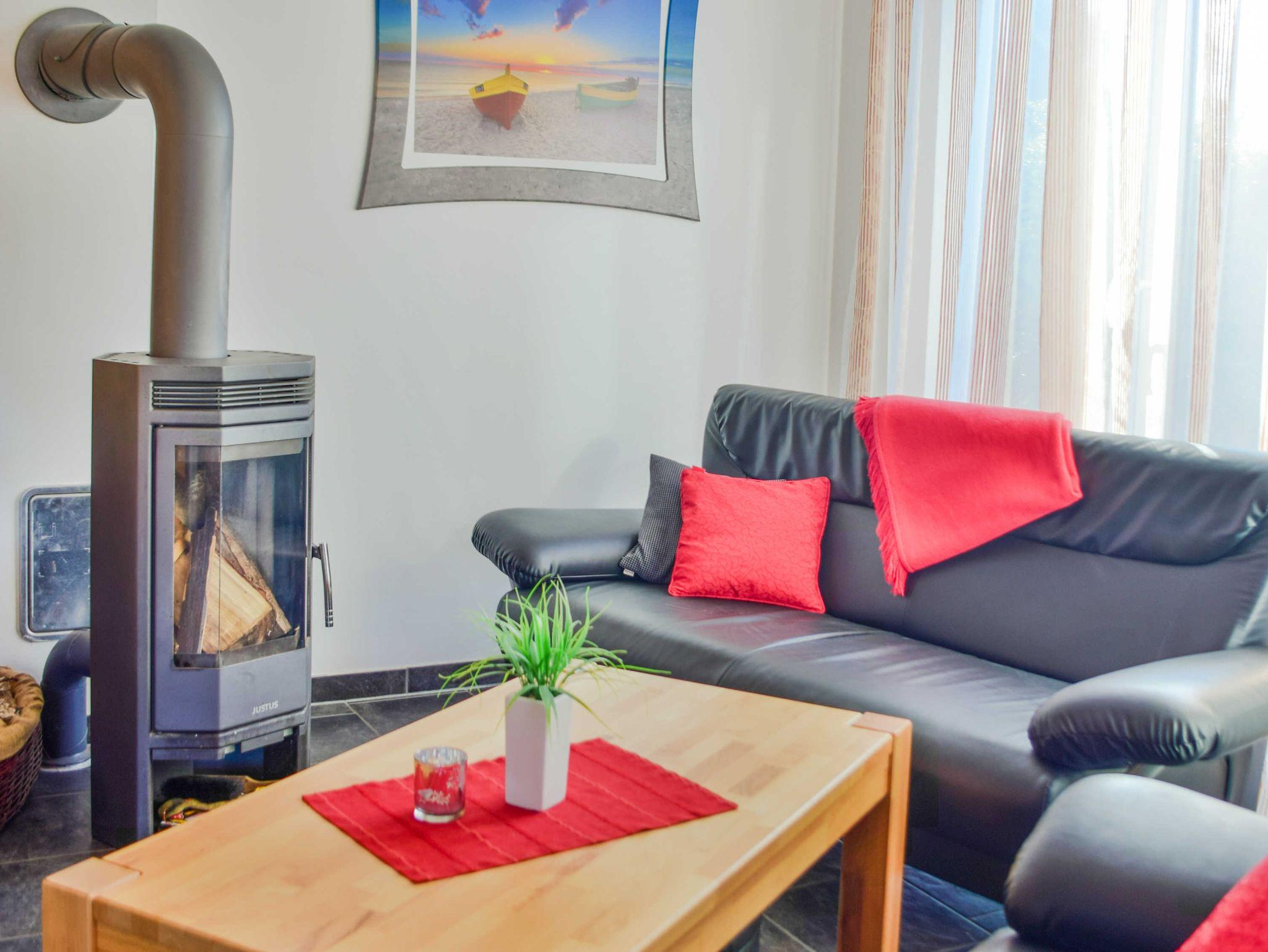 Die geschmackvoll eingerichtete Doppelhaushälfte für 6 Personen hat einen separaten Eingang und besitzt ein Wohnzimmer mit Kamin und offener Küche, sowie einen Essbereich und elektrische Rollläden im Erdgeschoss. Die Küche ist komplett ausgestattet mit Geschirr, Gläsern, Besteck, Töpfen, Pfannen, Backofen mit Backblech, Herd mit 4 Cerankochfeldern, Kühlschrank (92l) mit Tiefkühlfach (33l), Mikrowelle, Geschirrspüler, Toaster, Wasserkocher und Kaffeemaschine. Des Weiteren gehören zwei 2 Bäder zum Ferienhaus, eines mit Dusche, WC und Sauna, das andere mit Badewanne und WC, sowie 3 Schlafzimmer, zwei mit jeweils einem Doppelbett (180x200) und eines mit einem Schlafboden (140x200), welches über eine steile Raumspartreppe erreichbar ist.