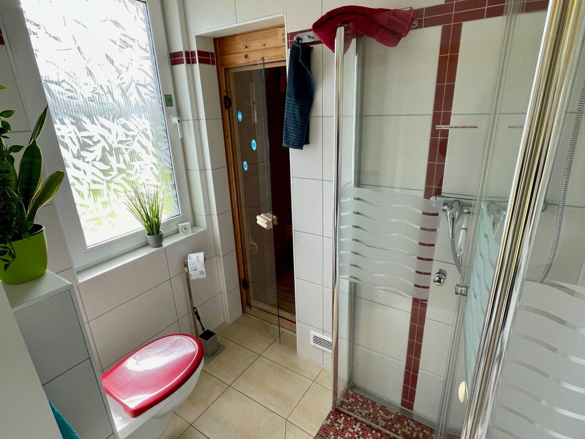 Weiterhin befindet sich dort ein Badezimmer mit Toilette und Dusche sowie einer Sauna.