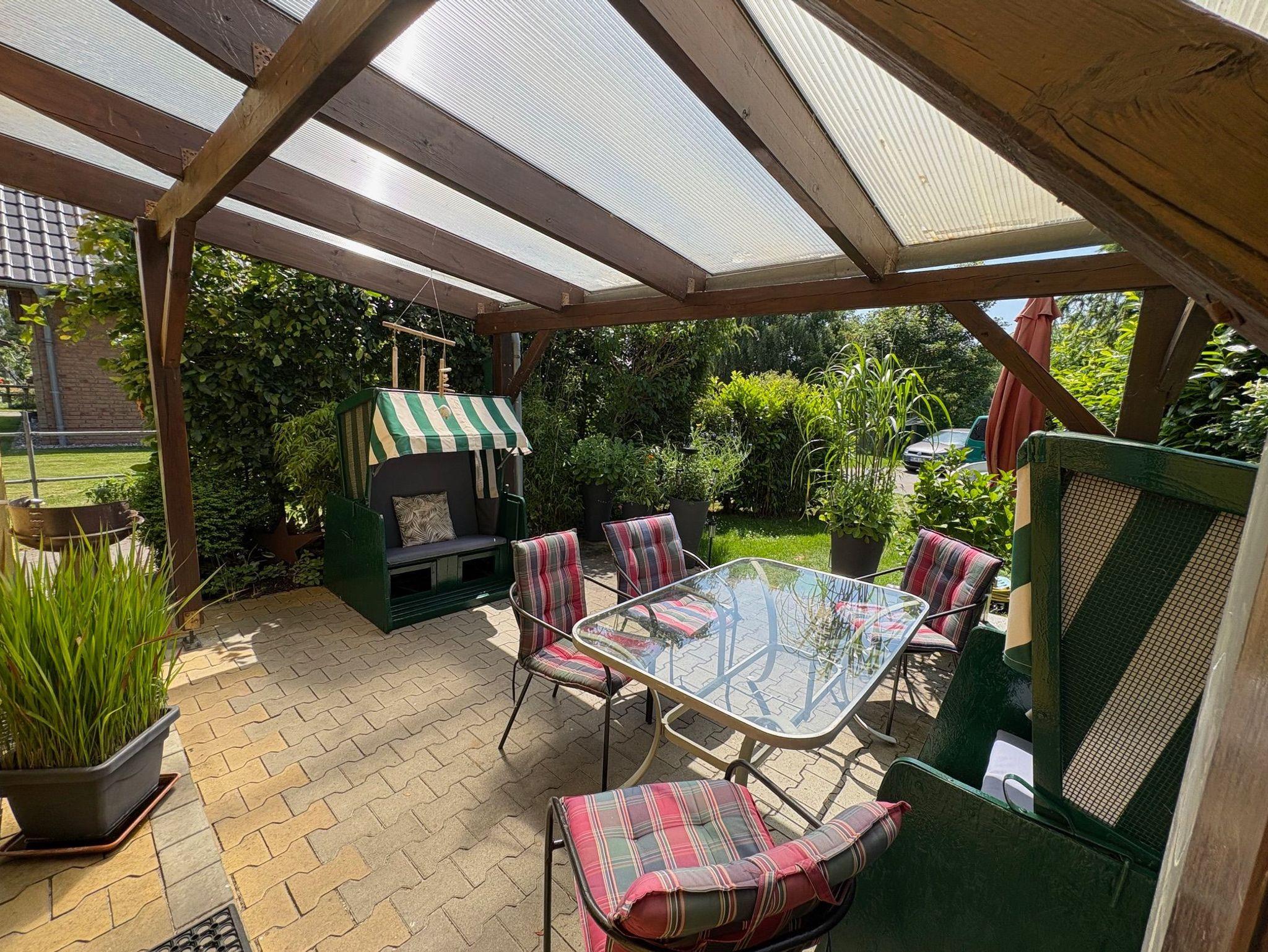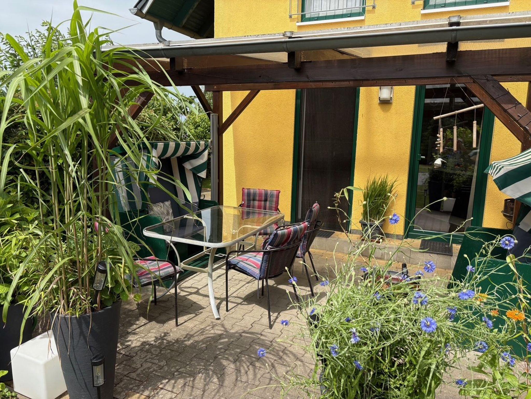 In unserer Außenanlage finden Sie eine überdachte Terrasse mit diversen Sitzmöglichkeiten, Sonnenliegen und Strandkörben.
