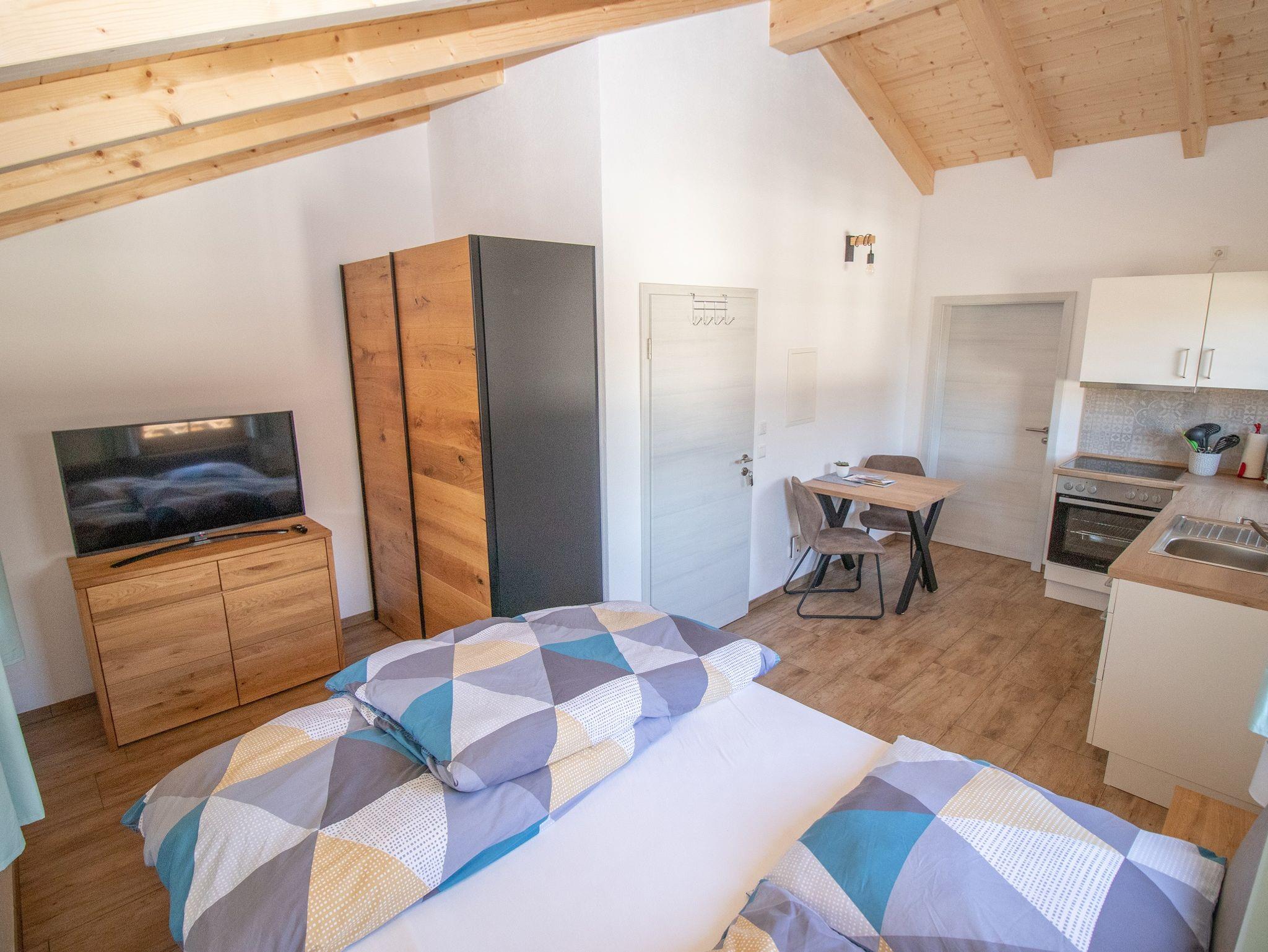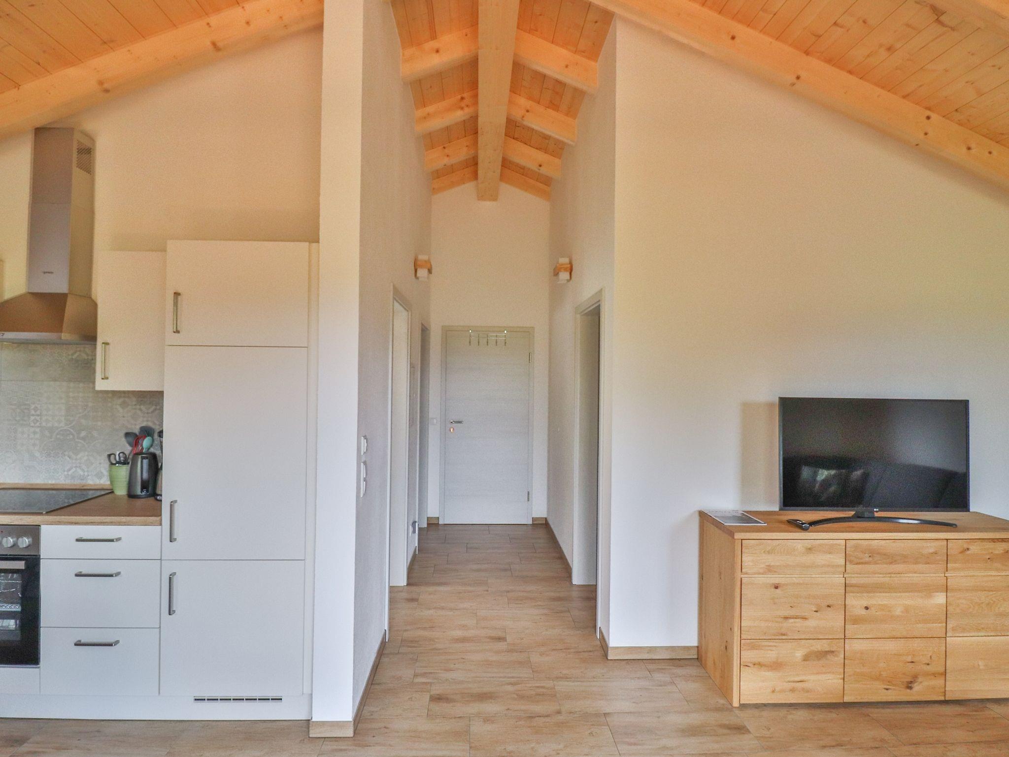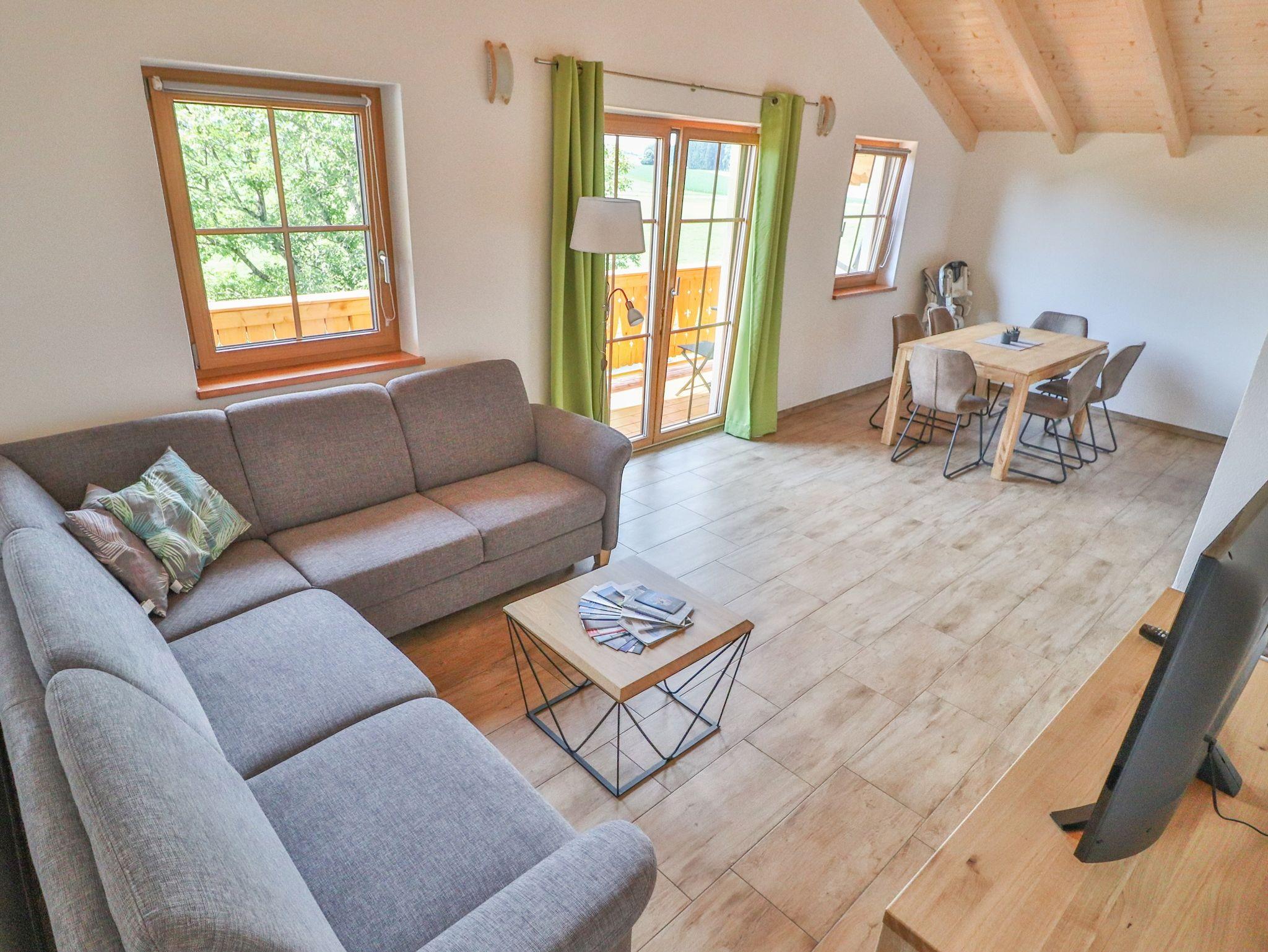Unsere Ferienwohnung bietet Platz für bis zu fünf Personen. Mit Blick auf die Berchtesgadener und Salzburger Alpen könnt ihr jeden Morgen einen schönen, erholsamen Tag am Land, in der Natur erleben. Auf 53 m² gibt es zwei getrennte Schlafzimmer, eines mit Doppelbett und eines mit Stockbett. Ein Badezimmer mit Dusche, WC und eine Wohnküche mit Ausziehsofa bieten Wohnkomfort in der Ferienwohnung. Ein wunderschönes Panorama erwartet euch vom Balkon aus. Kinderbett oder Hochstuhl stellen wir natürlich auf Anfrage für euch bereit. Zudem könnt ihr den Garten inklusive der Sitzgelegenheiten und dem Grill zu nutzen.