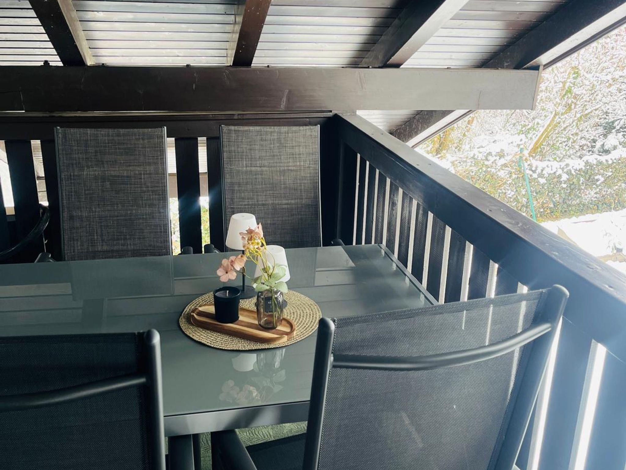 Der Balkon ist mit Tisch und Stühlen ausgetattet und bietet eine nette Sitzgelegenheit an der frischen Luft.