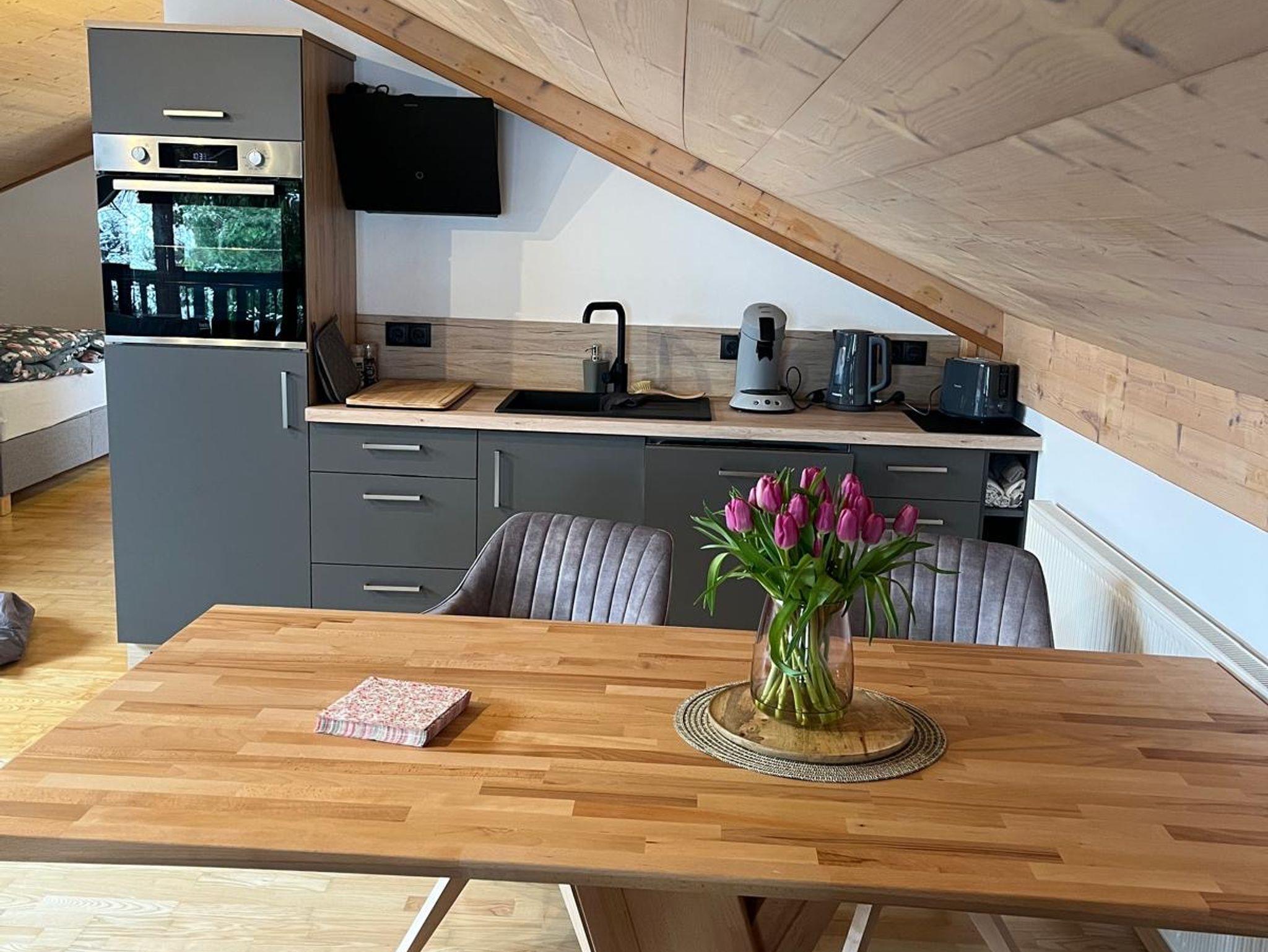 Das Apartment Watzmannblick in Sillersdorf bietet auf ca. 55m² Platz für 2 Erwachsene und 2 Kinder. Es befindet sich im ersten Stock (Dachgeschoss) einer Landhausvilla mit separatem Außenaufgang. Es verfügt über eine gut ausgestattete Küchenzeile, einen großen Esstisch, einen Wohn- und Schlafbereich mit Doppelbett und Couch. Die Couch wird bei Belegung mit max. 2 Kindern zu einer Schlafcouch umfunktioniert. Das sehr helle Badezimmer ist mit Dusche, WC, Waschbecken und Fön ausgestattet. Es gibt ein separates, großzügiges Ankleidezimmer mit 2 offenen Kleiderschränken und ausreichend Platz für Koffer, Taschen oder Kinderwagen...