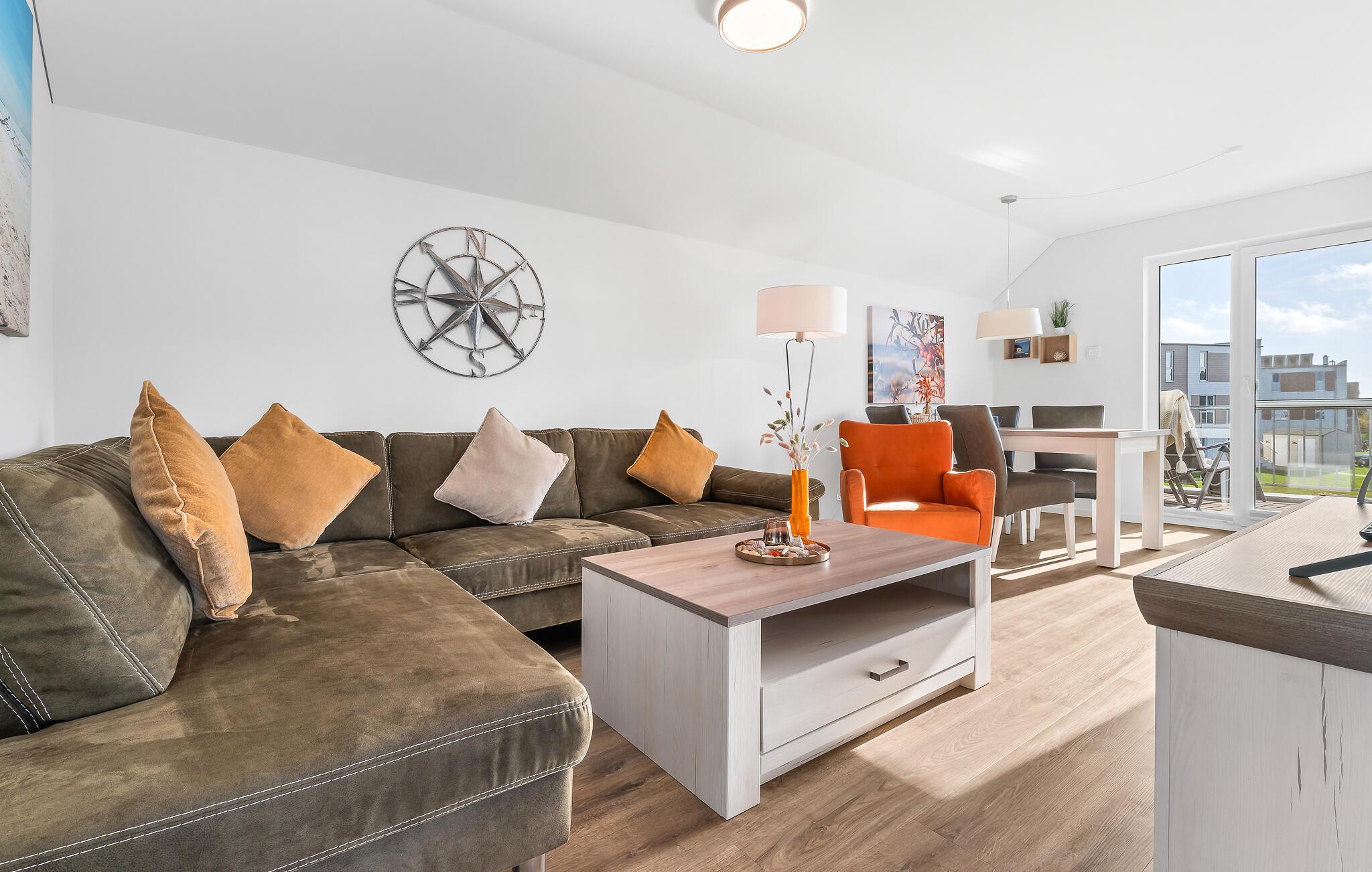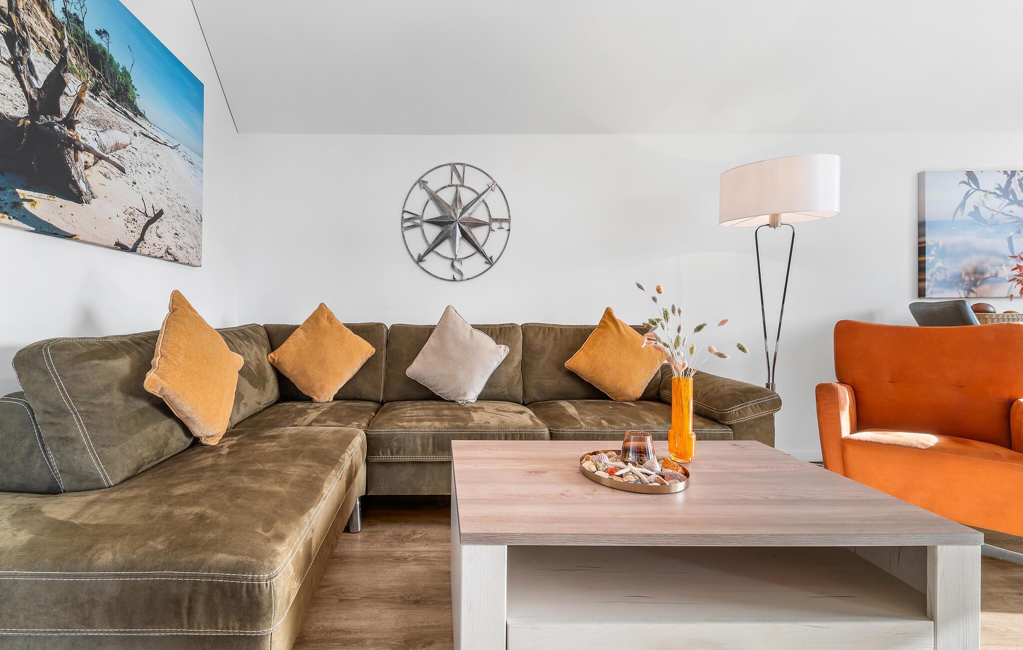 Auf der gemütlichen Wohnlandschaft lassen sich mit den Liebsten hyggelige Abende vor dem Fernseher mit Magenta Home Entertainment oder dem knisternden Kamin verbringen.