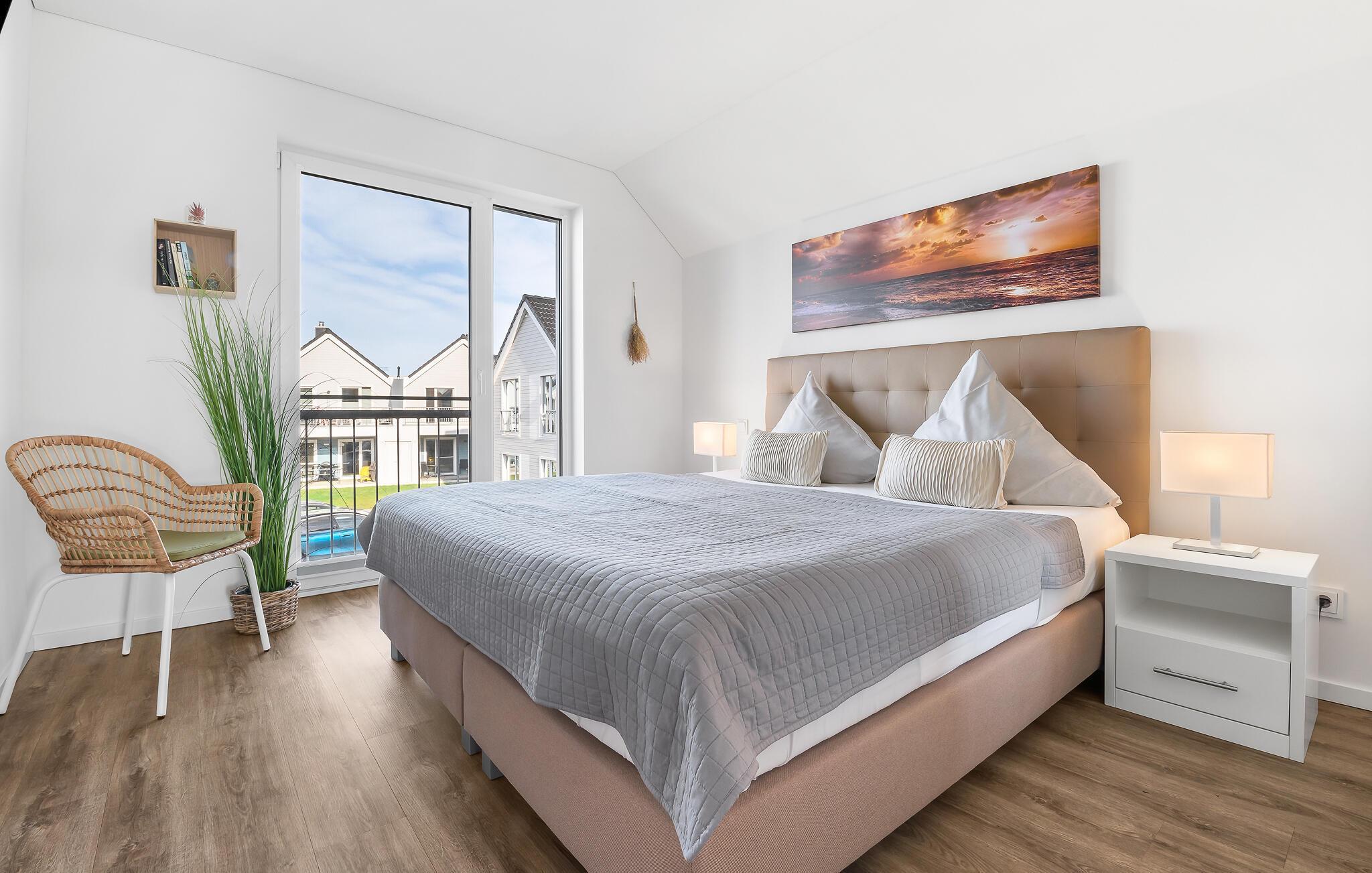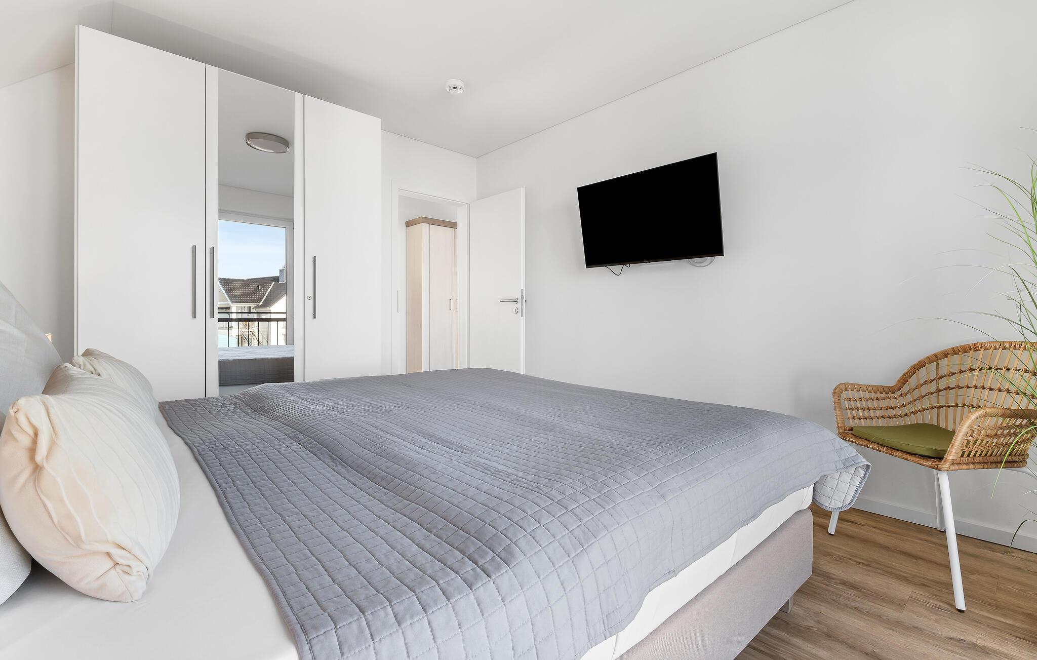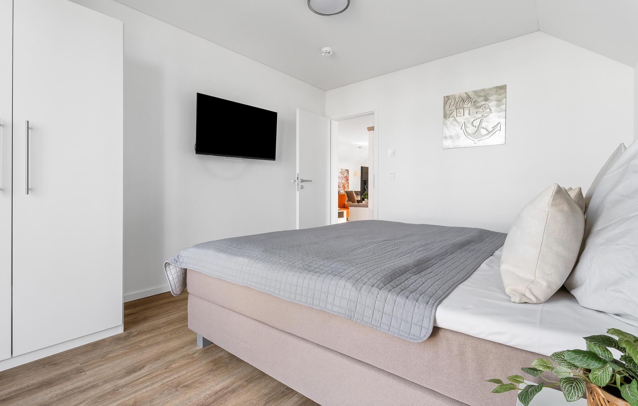 Das Hauptschlafzimmer ist mit einem hochwertigen Doppel-Boxspringbett ausgestattet, während das zweite Schlafzimmer über zwei flexibel zusammenschiebbare Einzelbetten verfügt. Beide Schlafzimmer bieten je einen Flatscreen-TV mit Home Entertainment.