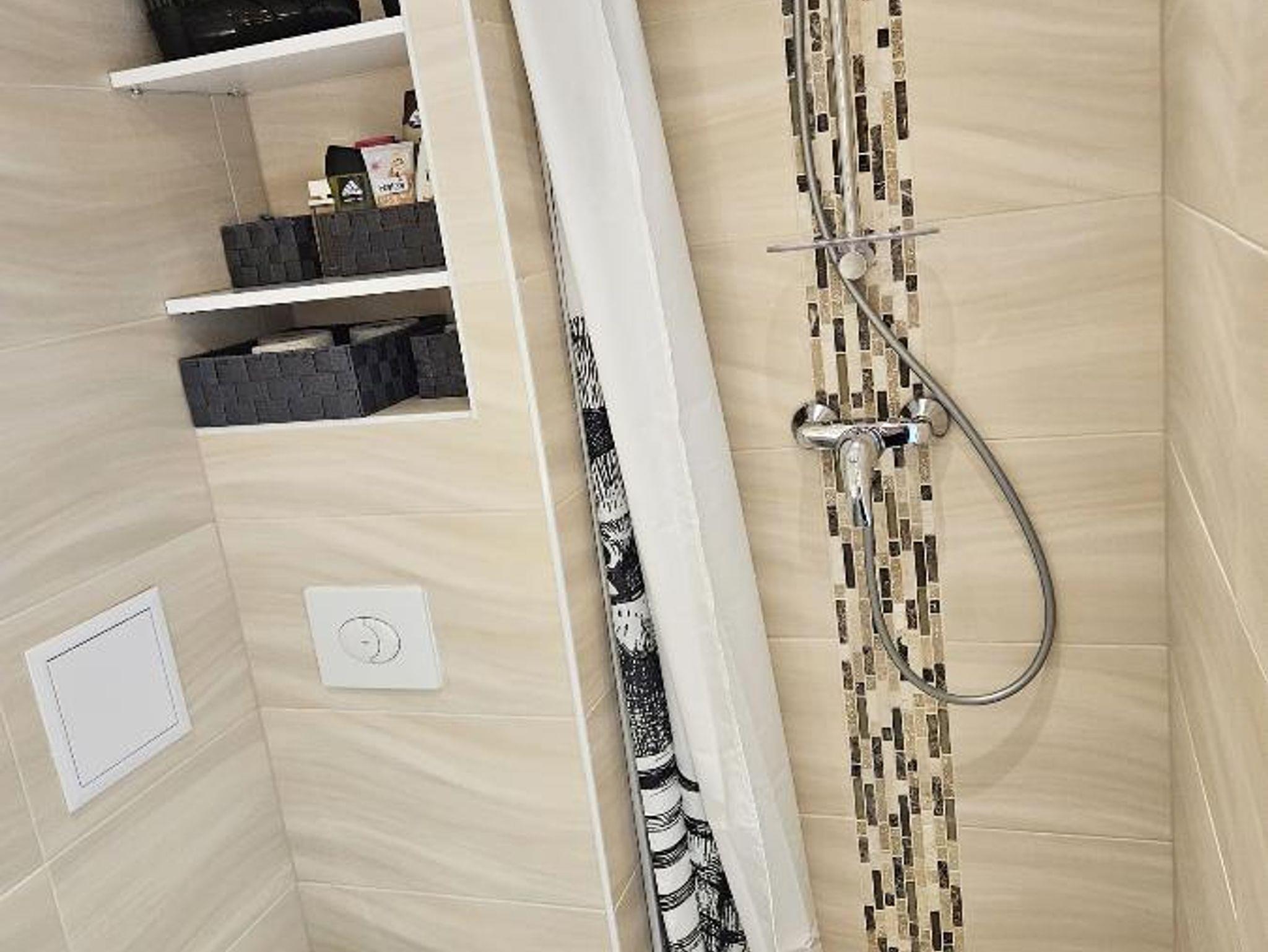 Modernes Duschbad mit Föhn, Duschgel, Shampoo und weiteren