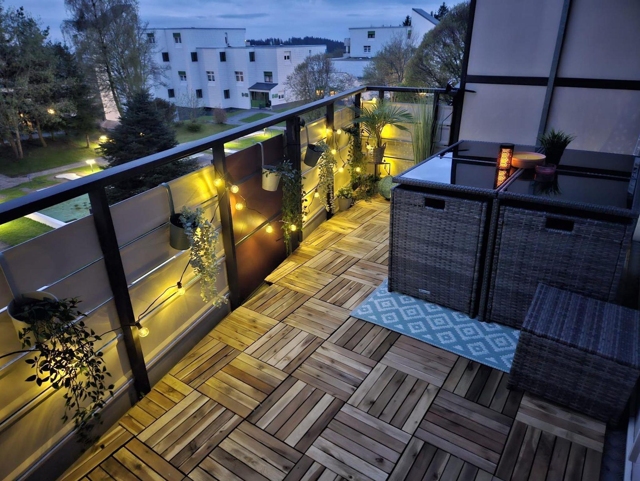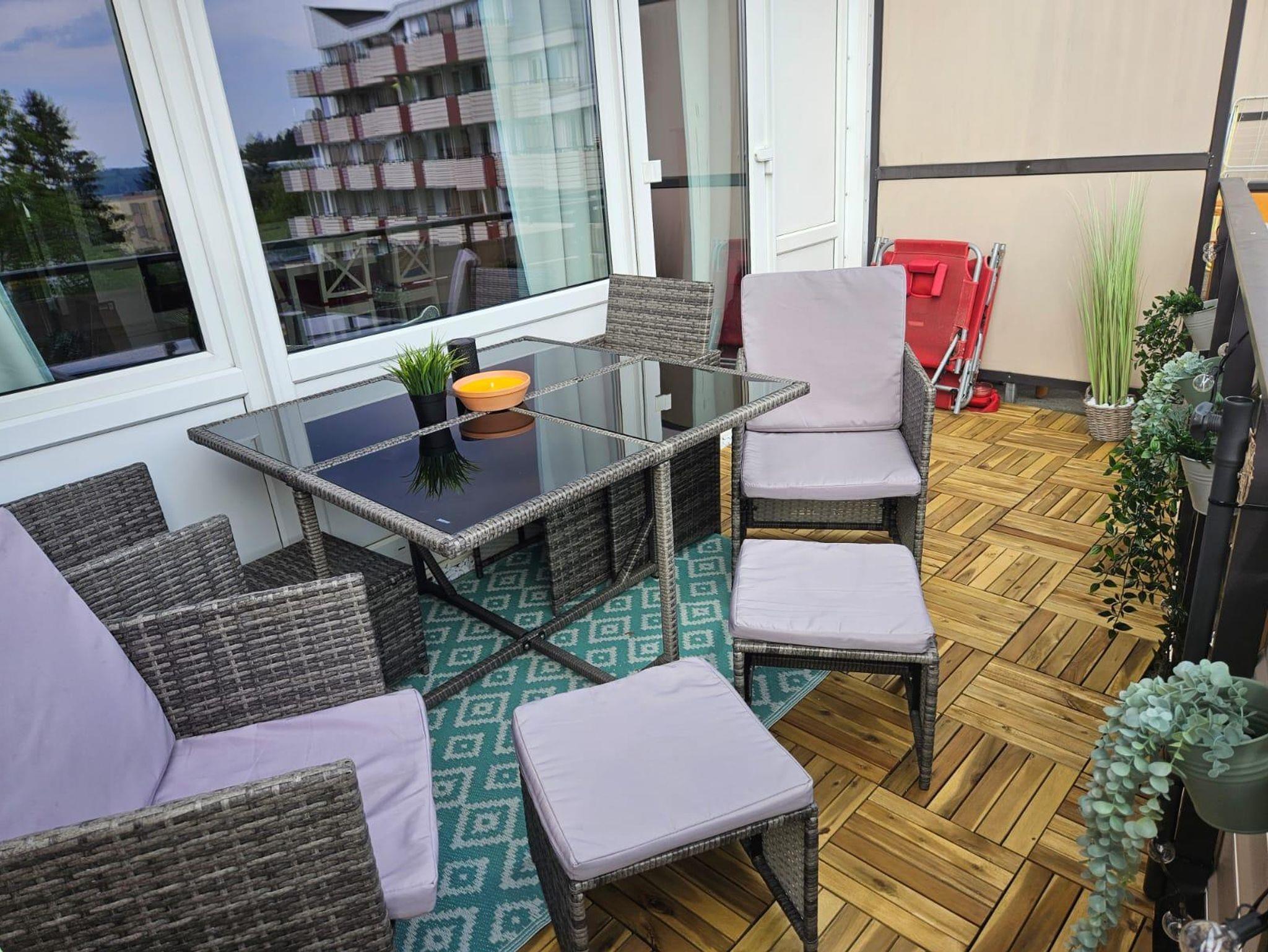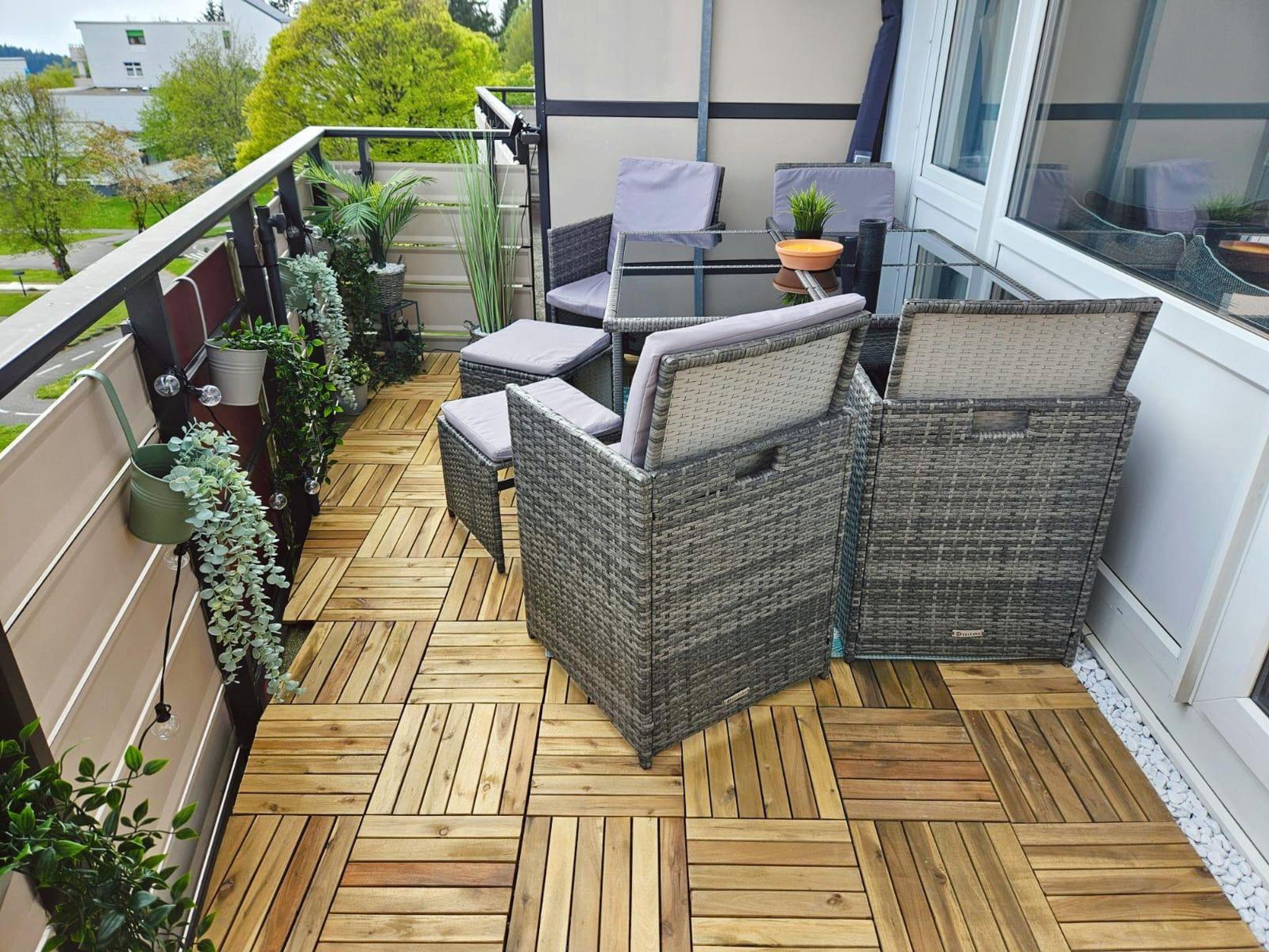 sonnige Südbalkon bietet einen ruhigen Blick auf den abends