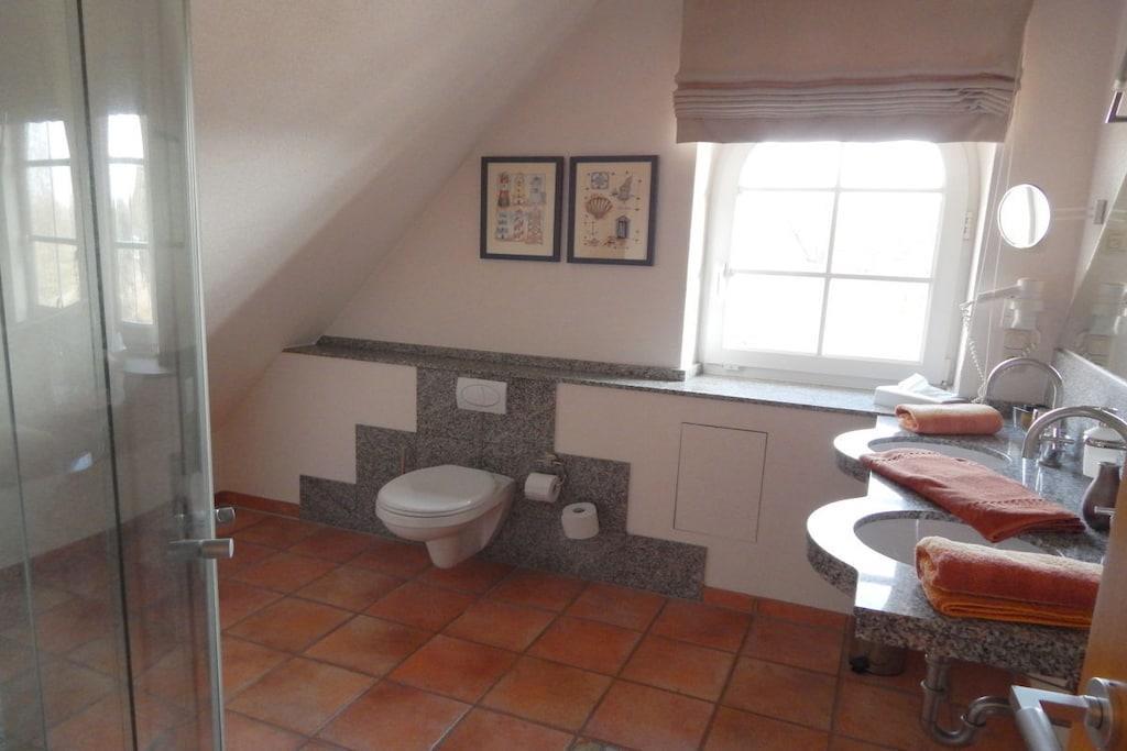 The luxurious amenities of this holiday apartment in Böhler Butendiek leave nothing to be desired. The high-quality granite bathroom features a shower, hairdryer, towel warmer, towels, and bathrobes. The spacious kitchen is equipped with a microwave, dishwasher, fridge-freezer, ceramic hob, oven, and much more. The cozy living room naturally includes a TV, DVD player, and stereo system. The downstairs bedroom is newly furnished with a 180 x 200 cm box-spring bed. Your private balcony is perfect for relaxing. We provide fresh towels, bread rolls, a daily newspaper, and visitor's tax cards daily upon request—all included in the price.
