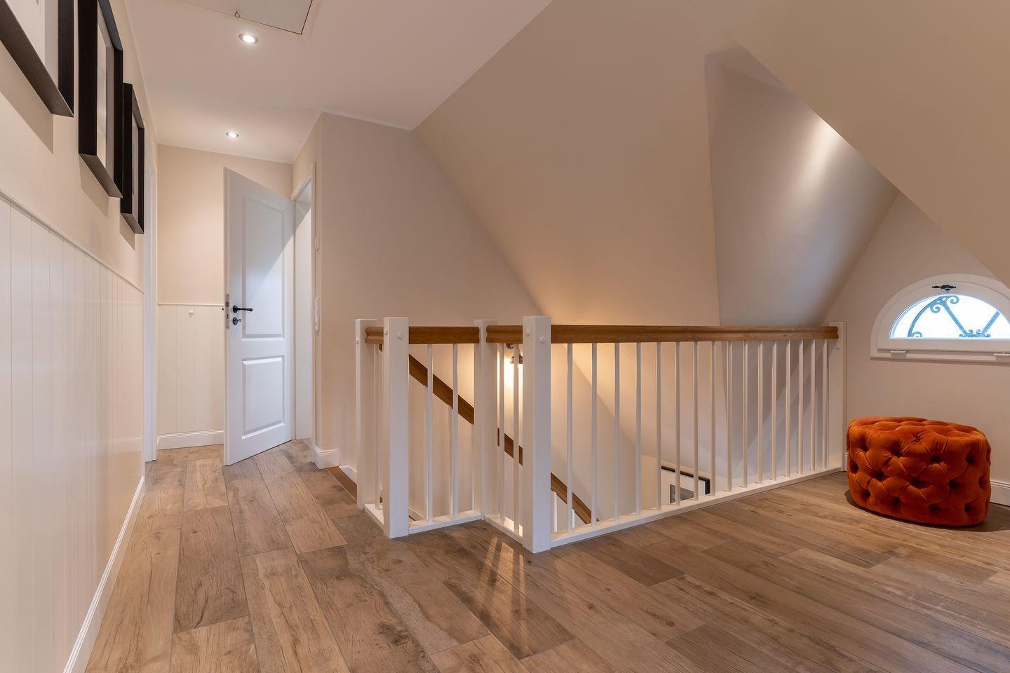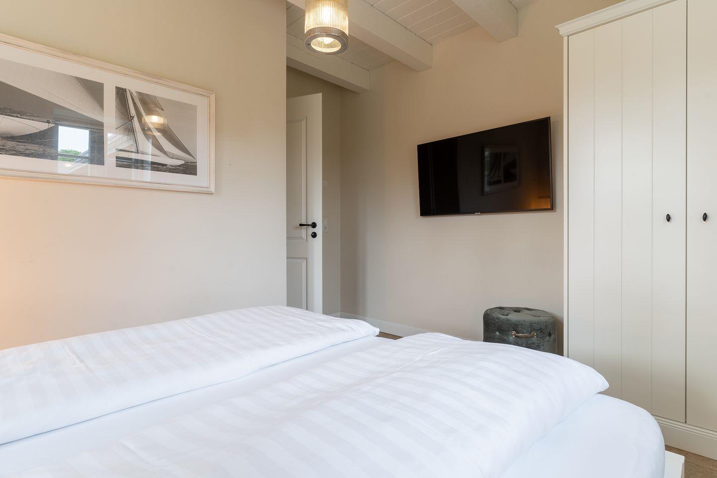 Eine Holztreppe führt Sie ins Obergeschoss, wo zwei weitere stilvoll eingerichtete Schlafzimmer mit komfortablen Doppelbetten (1x 200 x 210 cm + TV und 1x 160 x 200 cm) und ein weiteres Schlafzimmer mit einem Einzelbett (1x 100 x 200 cm) auf Sie warten. Ein geräumiges Badezimmer mit Dusche und Badewanne sorgt für zusätzlichen Komfort.