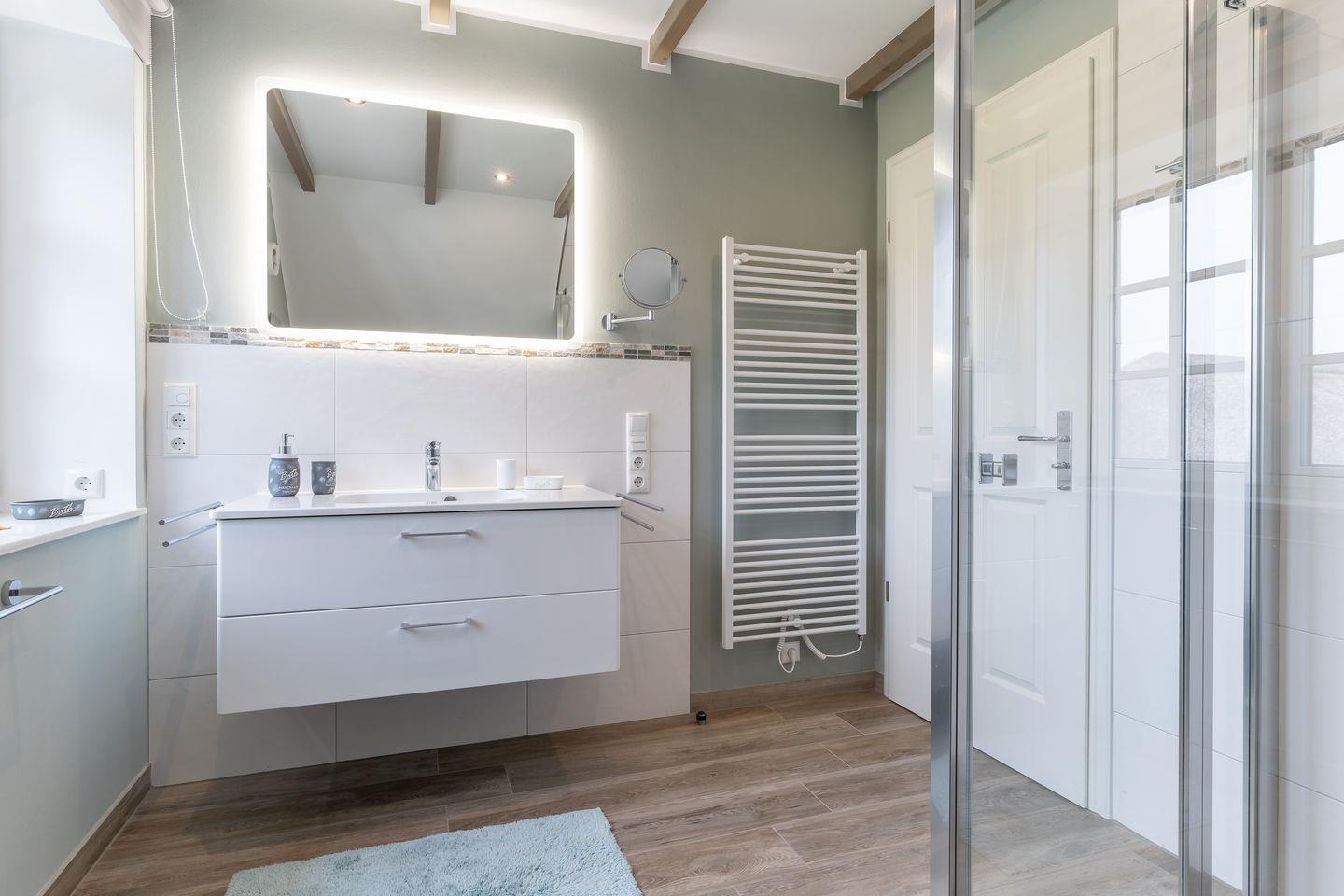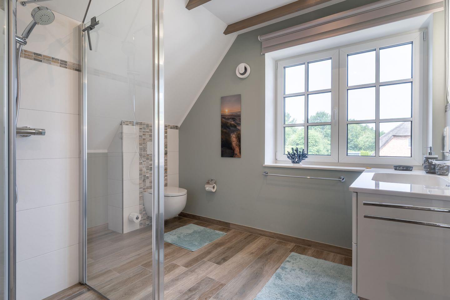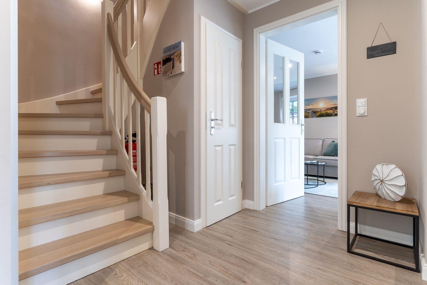 Im Eingangsbereich befinden sich Spiegel und Garderobe, zusätzlich befindet sich im Erdgeschoss noch ein Badezimmer mit Toilette und bodengleicher Dusche.