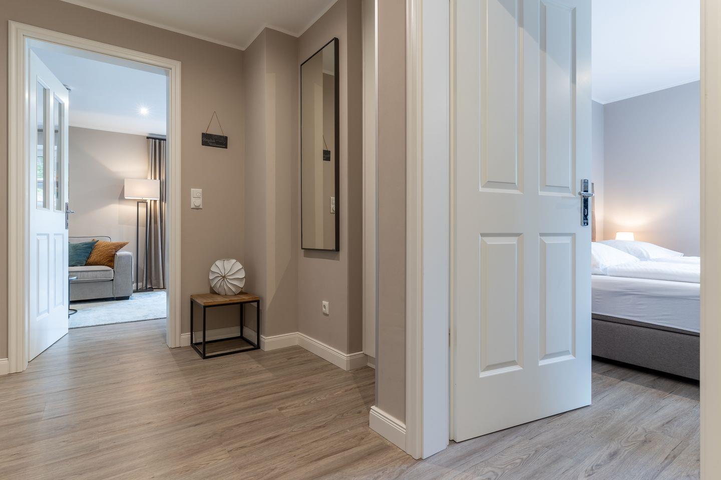 Von diesem Schlafzimmer aus gelangen Sie ins große Badezimmer, welches Ihnen neben dem Waschbecken noch Sauna, Badewanne, bodengleiche Dusche und Toilette bietet. Das zweite Schlafzimmer ist mit einem komfortablen 180x200cm Boxspringdoppelbett sowie einer Kommode ausgestattet. Von dort gelangen Sie in ein weiteres Badezimmer, das mit Waschbecken, Toilette und bodengleicher Dusche ausgestattet ist. Ebenfalls finden Sie dort den hauseigenen Waschtrockner.