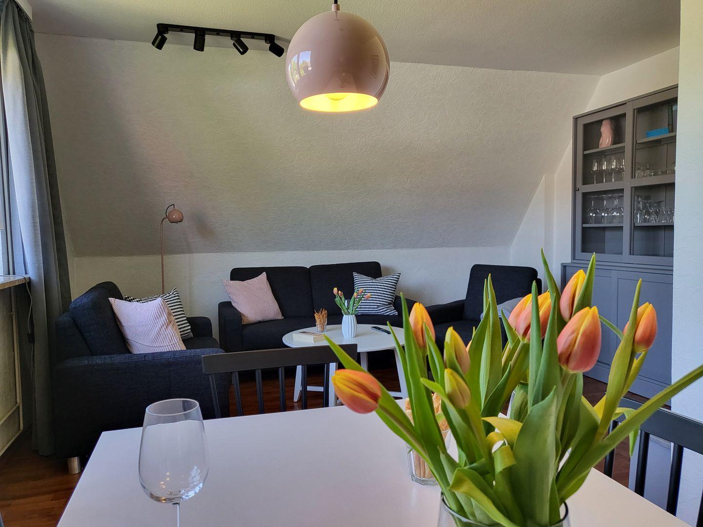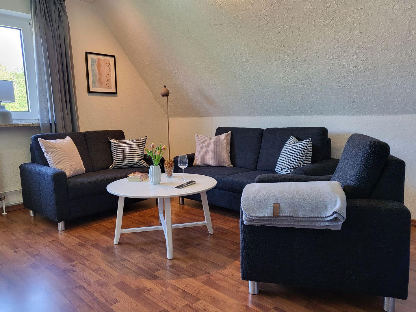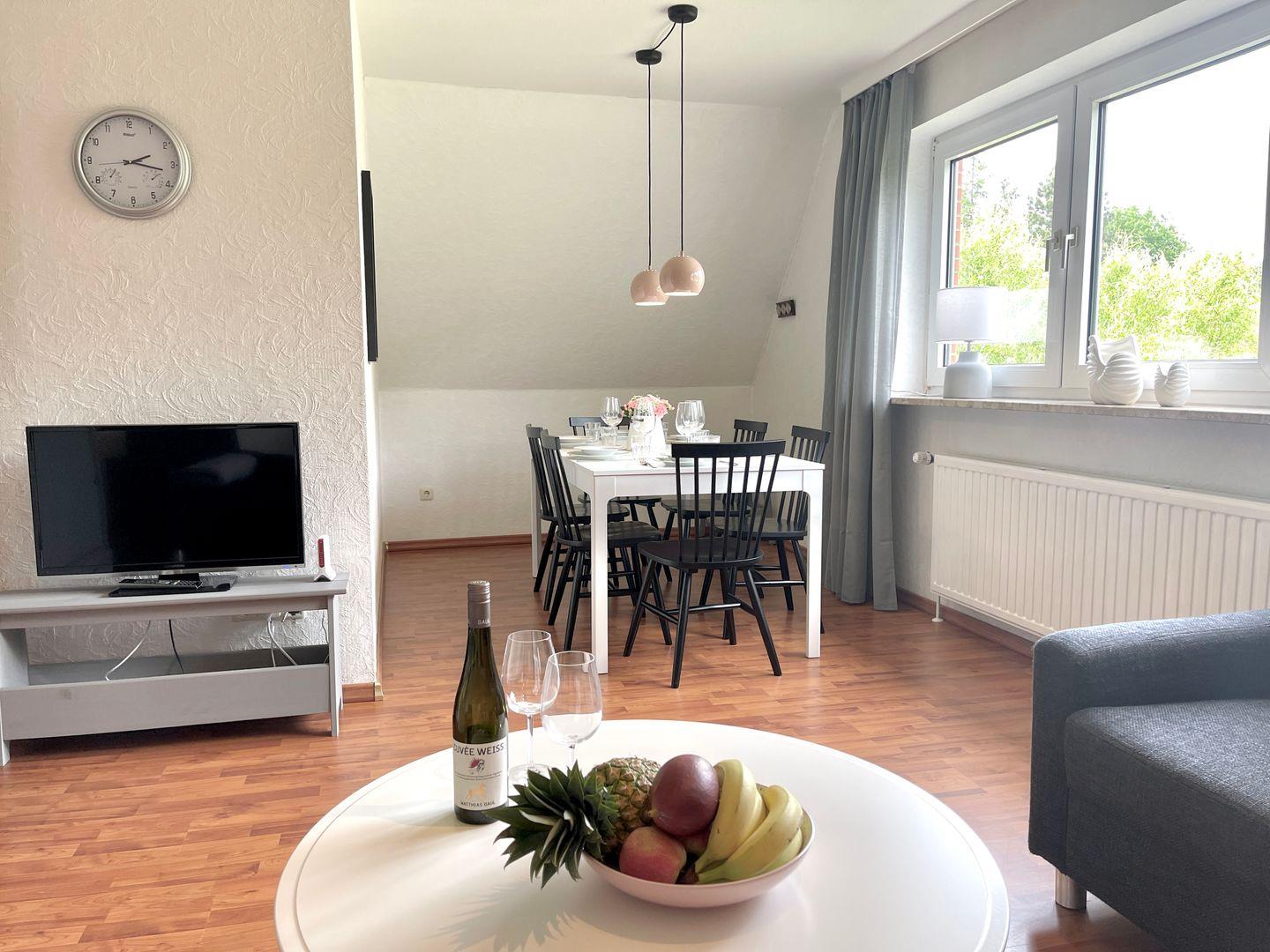 Im großzügigem Wohnraum mit Couchgarnitur ist auch ein Tisch mit Stühlen, der als Essbereich dient.