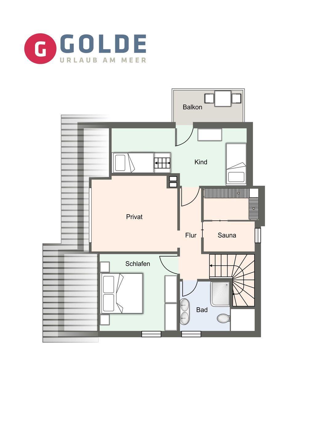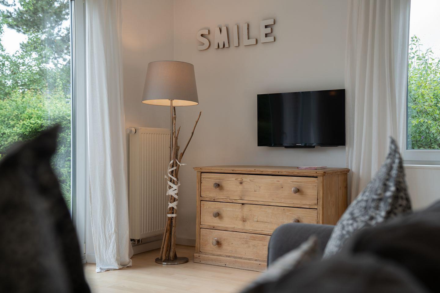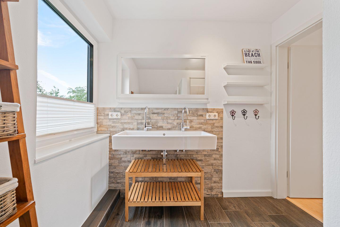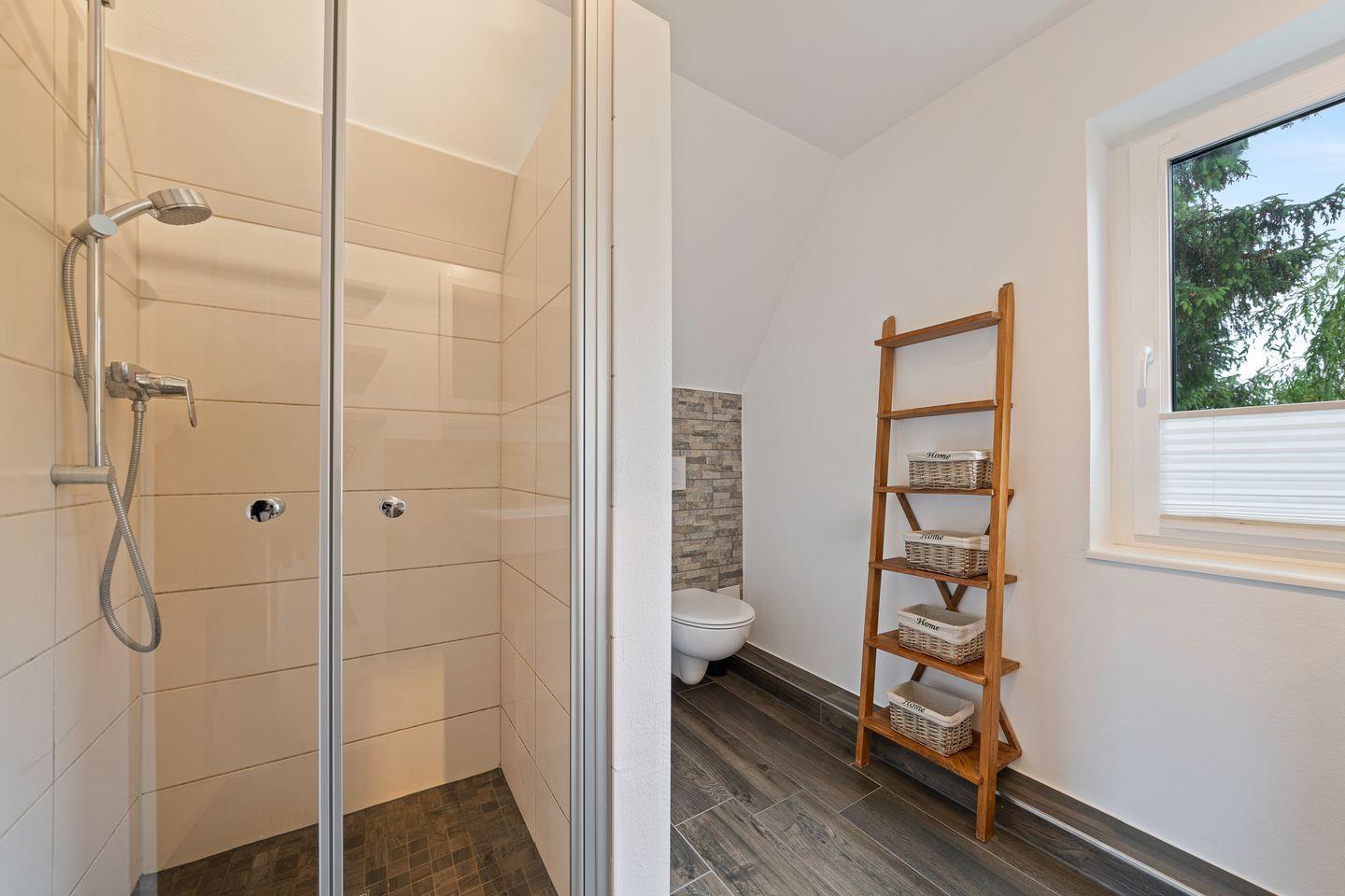 Im Erdgeschoss erwartet Sie ein hübscher, heller Wohnraum mit SAT-TV, WLAN und einer schönen Essecke. Die offenen Küche mit Küchenblock, Geschirrspüler und Backofen lädt zum Kochen ein. Ein Abstellraum und ein Gäste-WC komplettiert die Etage.