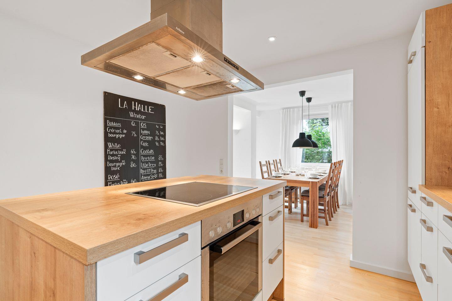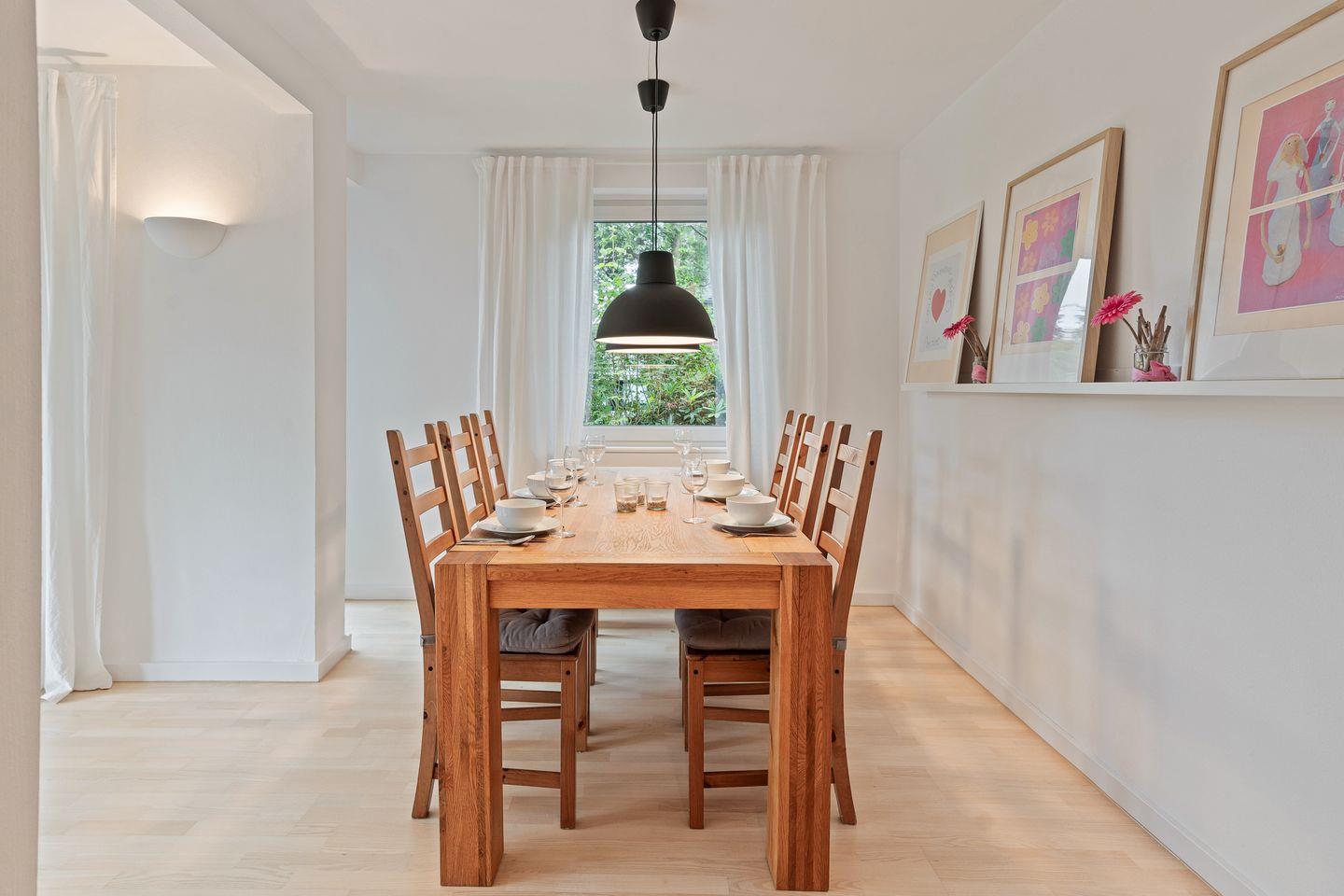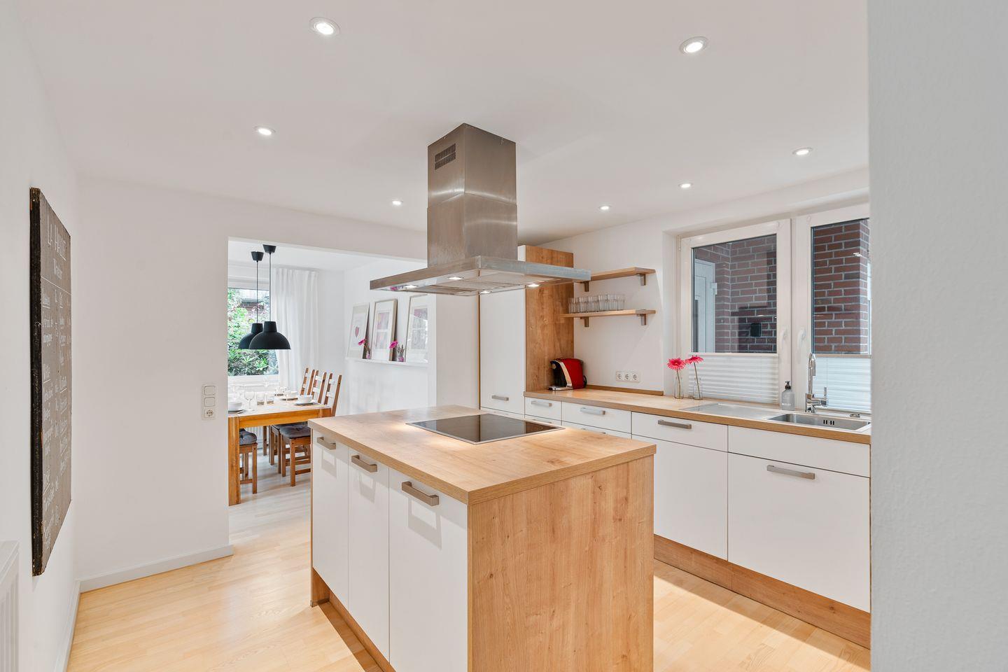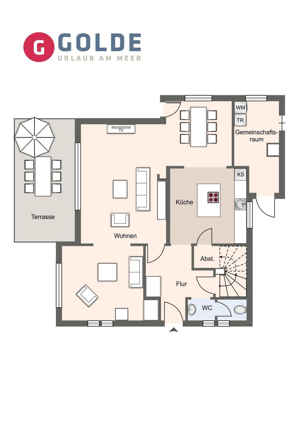 Im Erdgeschoss erwartet Sie ein hübscher, heller Wohnraum mit SAT-TV, WLAN und einer schönen Essecke. Die offenen Küche mit Küchenblock, Geschirrspüler und Backofen lädt zum Kochen ein. Ein Abstellraum und ein Gäste-WC komplettiert die Etage.