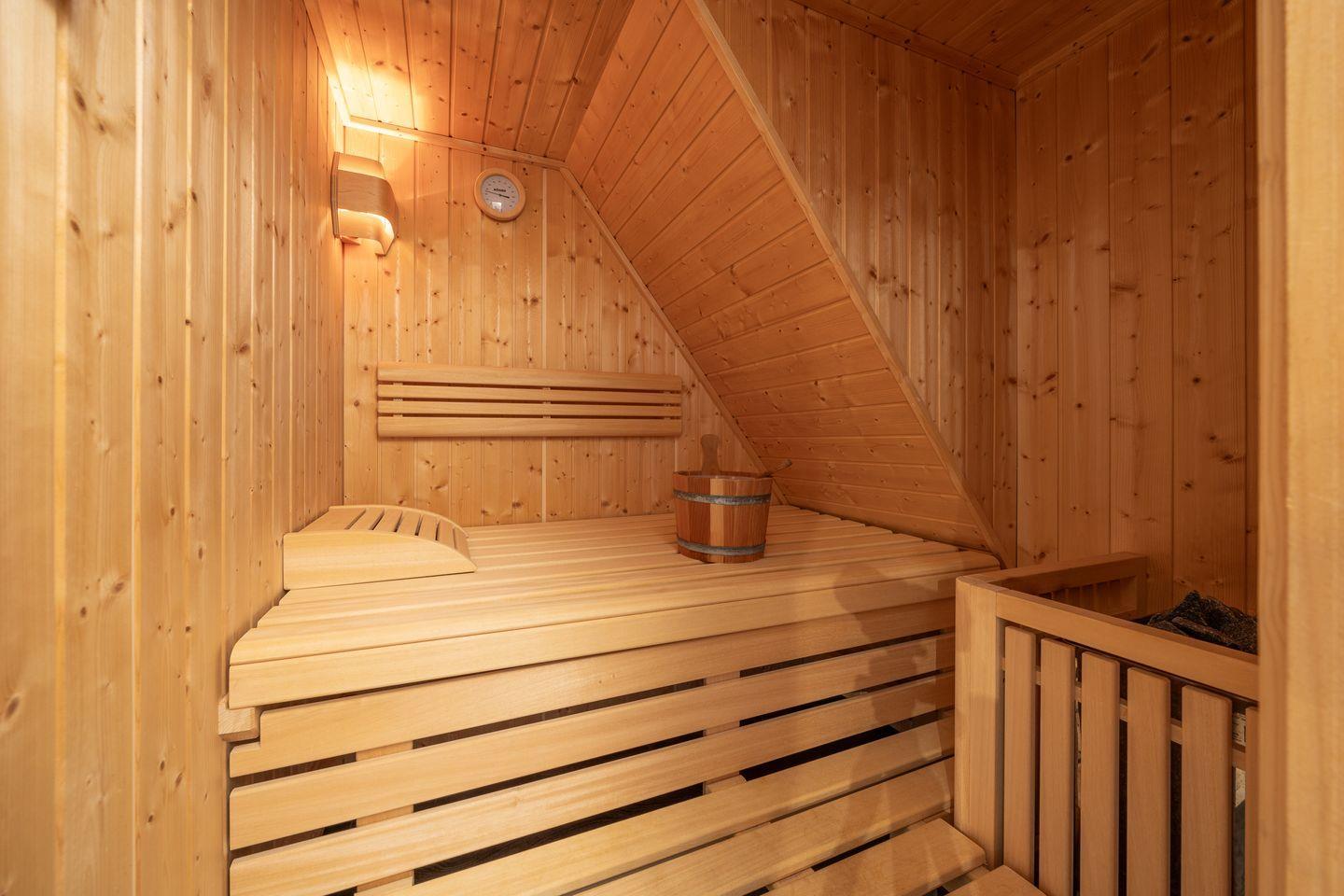 Im Obergeschoss befinden sich 2 Schlafzimmer: eines mit Doppelbett und eines mit einem Etagenbett und einem Einzelbett, mit Zugang zum Balkon. Ein Duschbad und eine Sauna für Ihr Wohlbefinden sind ebenfalls vorhanden.