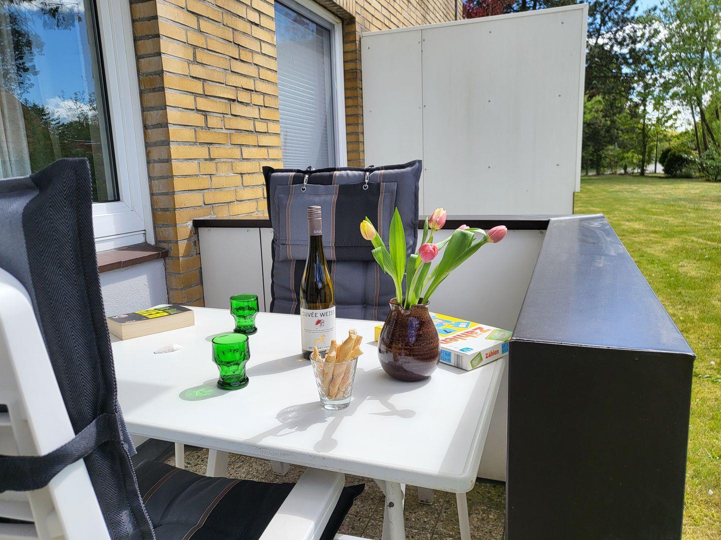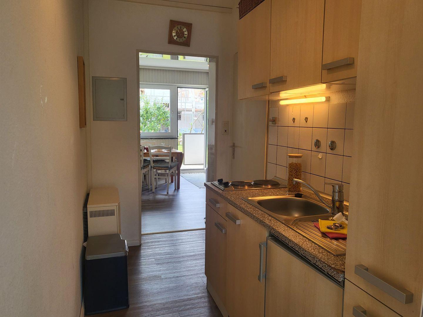 2 Zimmerwohnung im EG mit Terrasse, geeignet für bis zu 2 Erwachsene und 2 Kinder, Wohnzimmer mit Esstisch und Schlafcouch, Küchenzeile im Flurbereich, Duschbad mit WC,