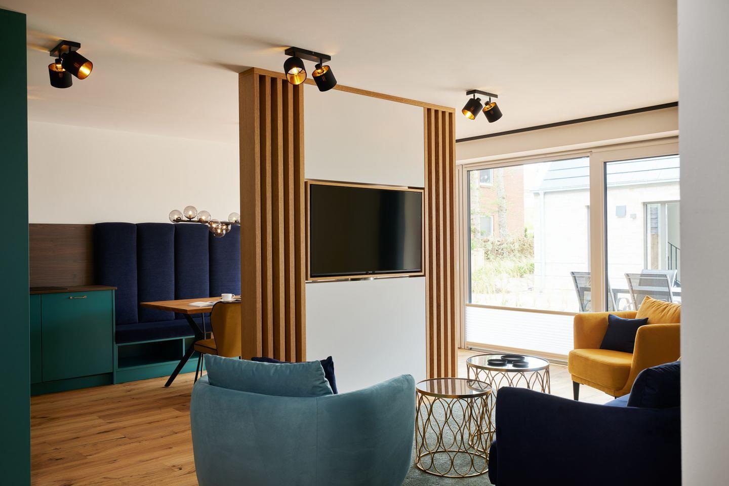 Der durchdachte Grundriss des ca. 95 m² großen Apartments schafft ein großzügiges Wohngefühl. Der Wohn- und Essbereich mit integrierter Küche und Design-Polstermöbeln lädt zum entspannten Zusammensein ein und grenzt direkt an Ihre private Sonnenterrasse. Ein Highlight ist die hochwertige Küche mit türkisfarbenen Fronten und goldenen Armaturen – stilvoll und maritim. Zwei Schlafzimmer mit bequemen Boxspringbetten bieten Platz für vier Gäste. Besonders komfortabel: zwei moderne Badezimmer mit begehbarer Dusche, eines davon sogar en suite.