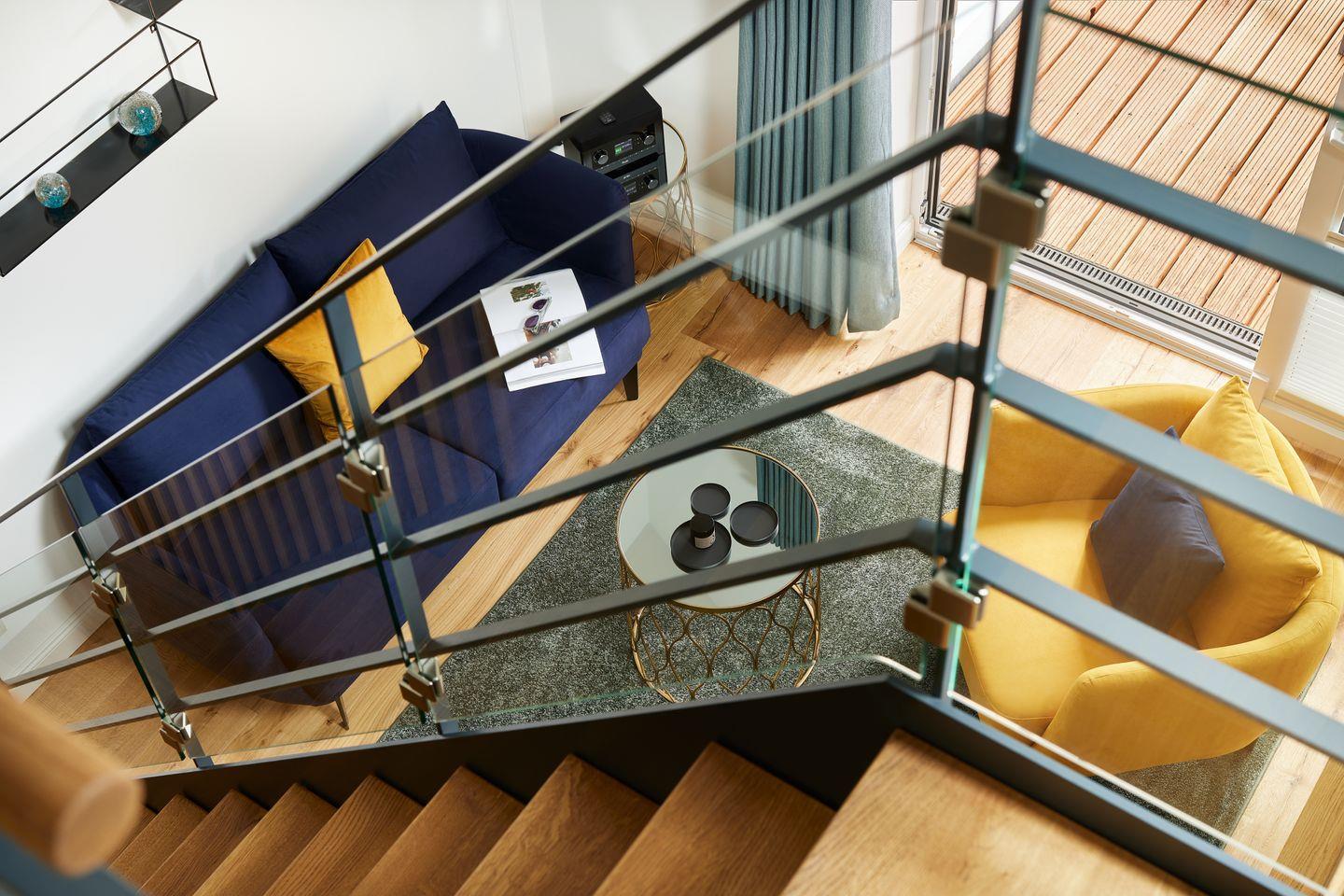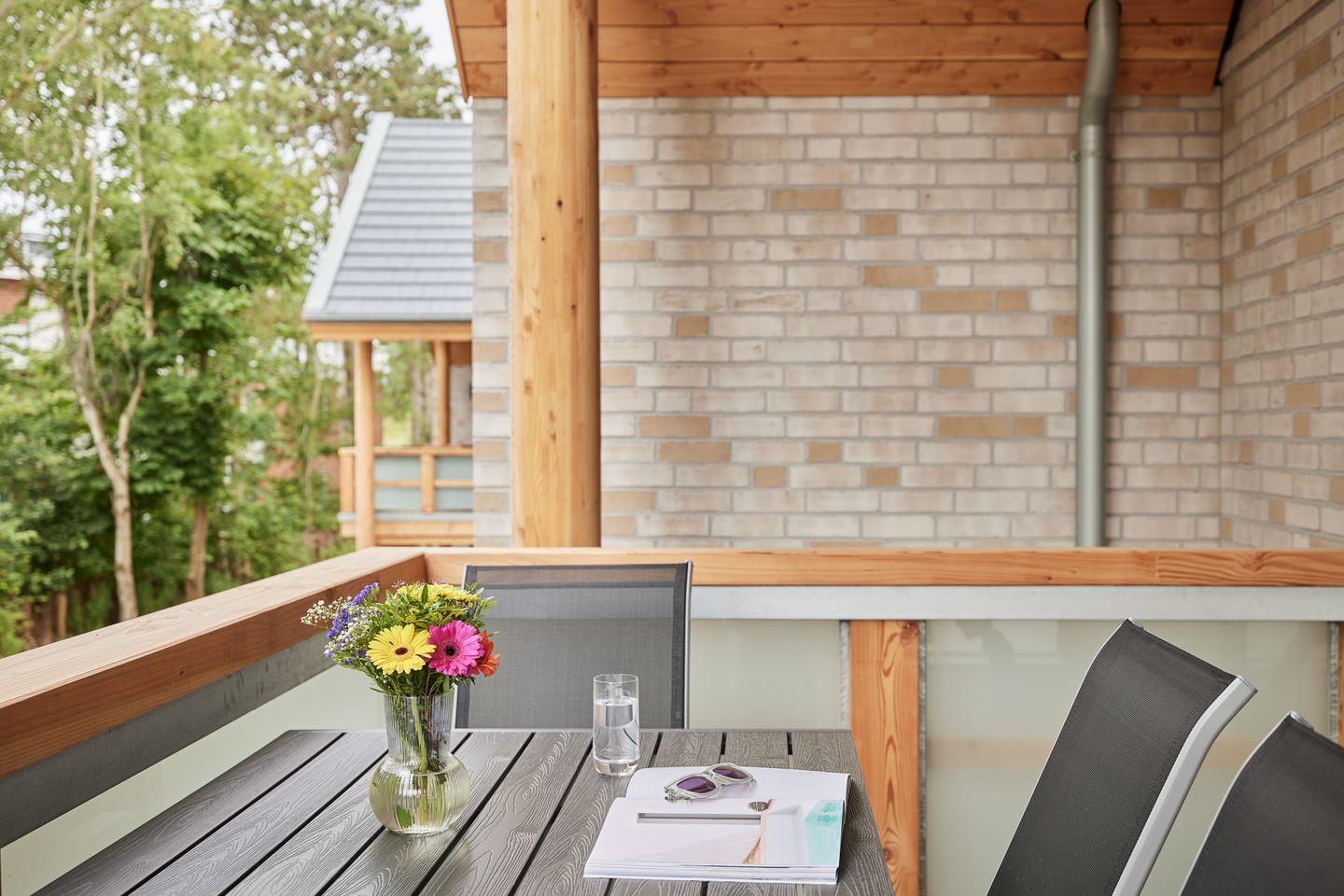Die offene Konzeption des ca. 68 m² großen 1-Zimmer-Apartments schafft ein einzigartiges Wohngefühl und bietet Platz für bis zu zwei Gäste. Der Schlafbereich ist durch eine Trennwand geschickt vom Wohnbereich separiert. Hier genießen Sie ein hochwertiges Boxspring-Doppelbett. Der Wohn- und Essbereich mit integrierter Küche und Design-Polstermöbeln lädt zum gemütlichen Zusammensein ein und grenzt direkt an Ihren privaten Sonnenbalkon. Nicht nur die hochwertige Küche mit türkisfarbenen Fronten und goldenen Armaturen ist ein Highlight: Über dem Wohnraum befindet sich eine große Galerie, die zum Entspannen einlädt. Auch ein modernes Badezimmer mit ebenerdiger Dusche gehört zur elegant-maritimen Ausstattung.