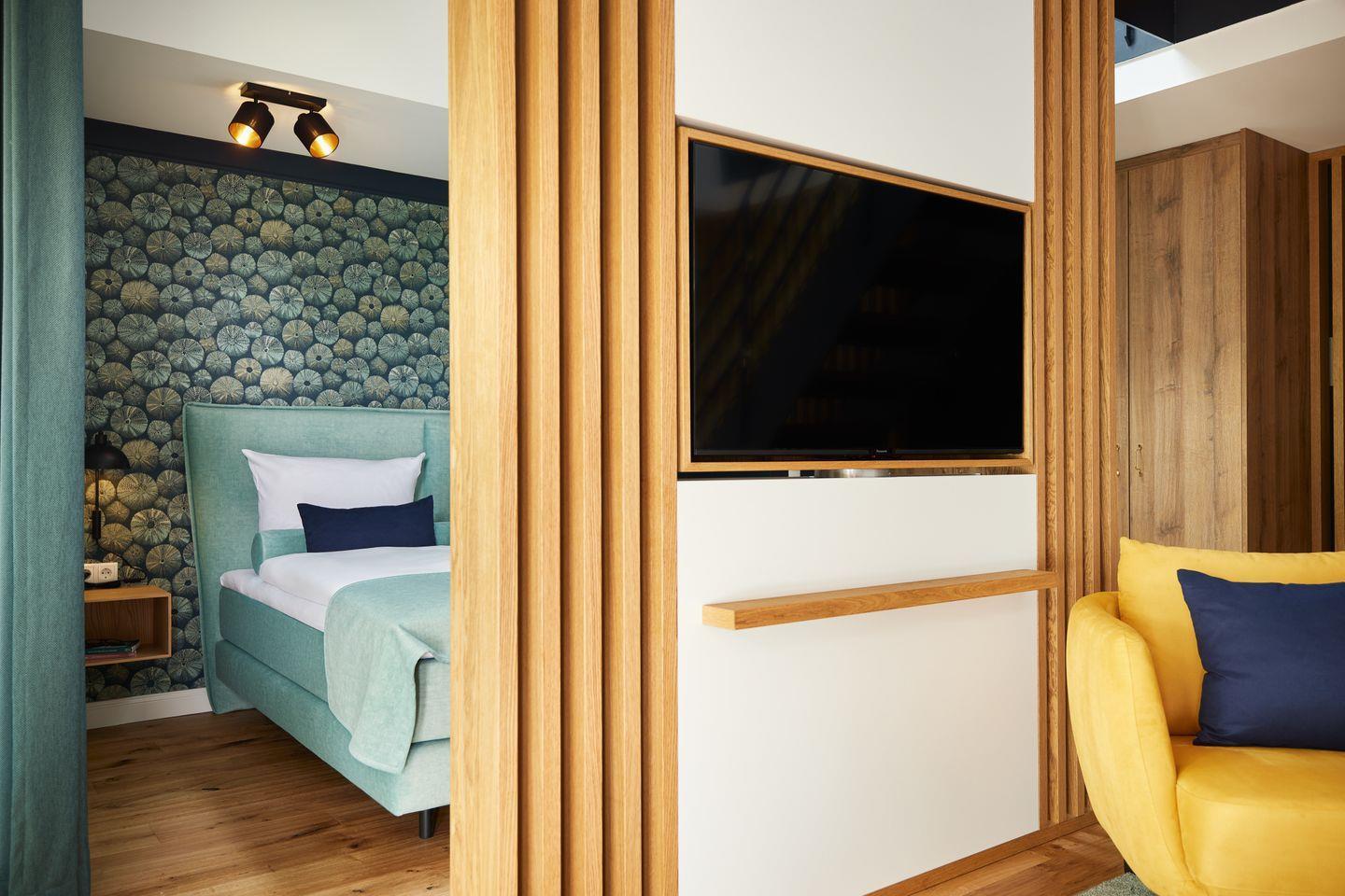 Der Schlafbereich ist durch eine Trennwand geschickt vom Wohnbereich separiert.