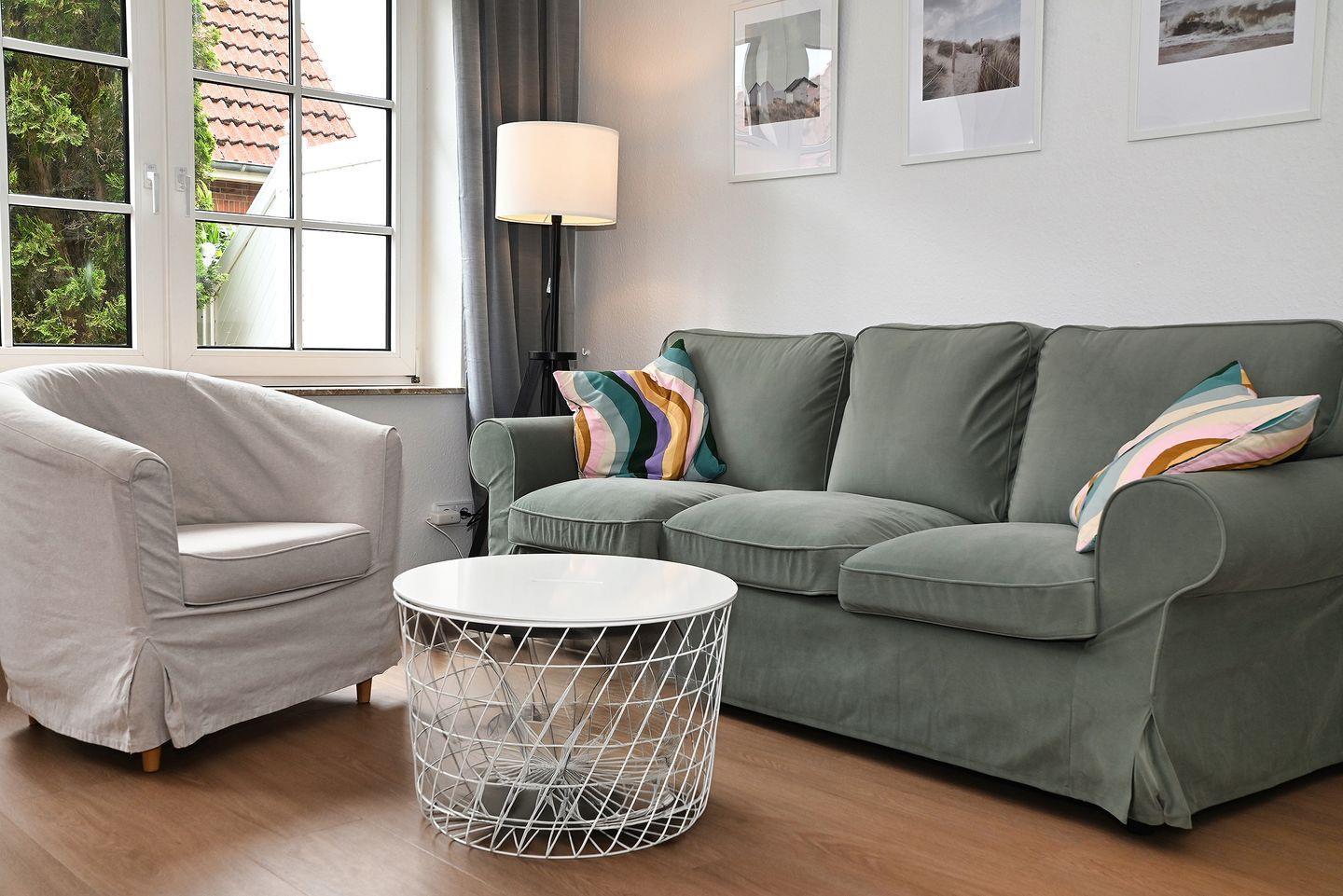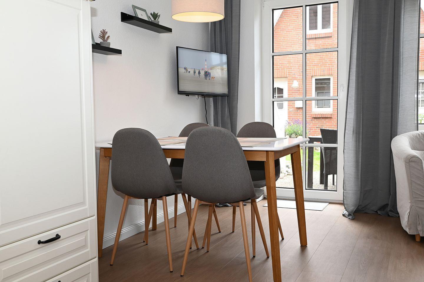 Im Wohnzimmer erwartet Sie eine bequeme Sofaecke zum Entspannen. Für Ihre Unterhaltung steht Ihnen ein Fernseher bereit. Die offene und modern gestaltete Küche ist zum Wohnbereich hin integriert und sorgt für eine gesellige Atmosphäre beim Kochen. Sie ist mit hochwertigen Haushaltsgeräten ausgestattet.
