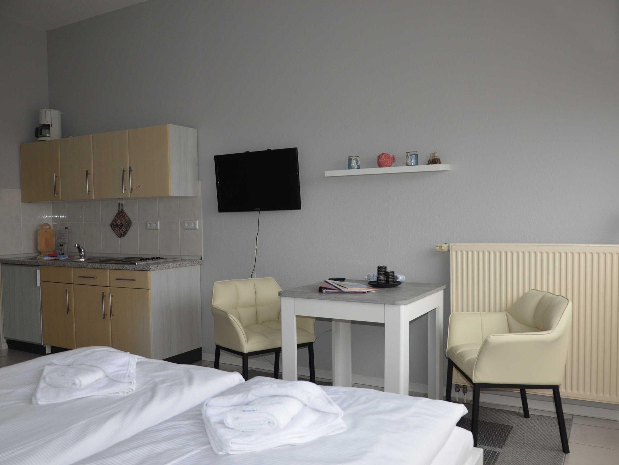 ? Wohn-/ Schlafbereich mit Tisch, 2 Stuhlsessel, Doppelbett (1,60 x 2,00 m), Flachbild-TV und Radio