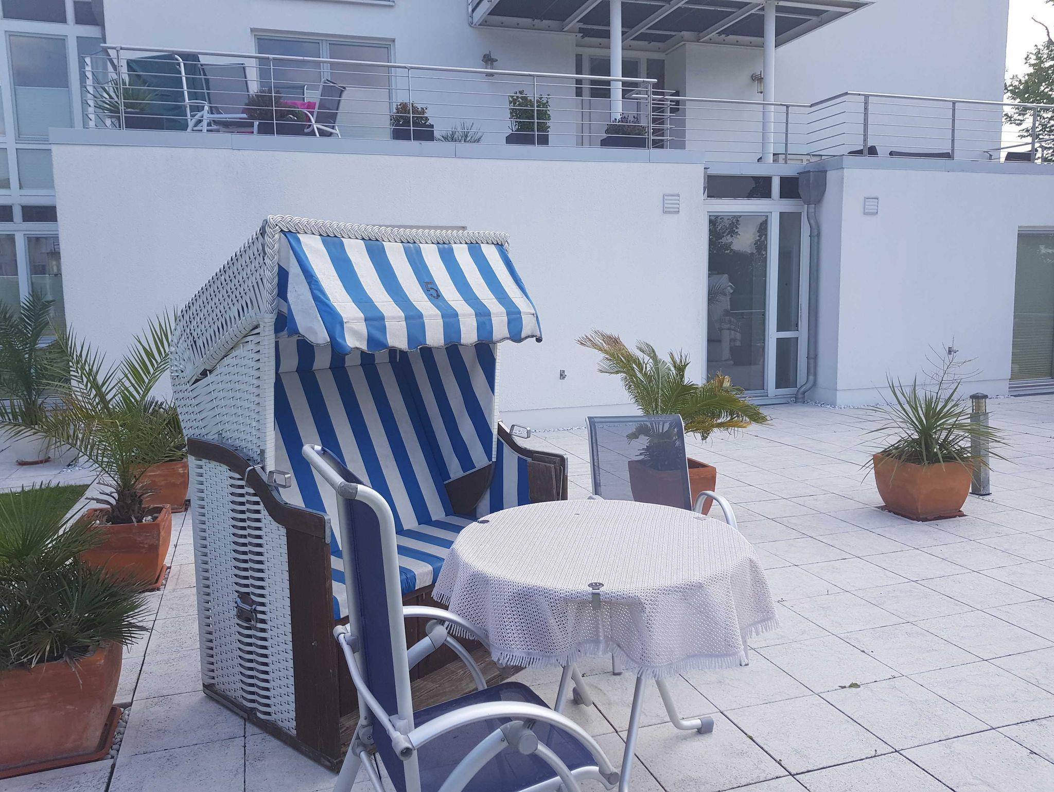 Eine großzügige 25 m² große Terrasse, die Sie über einen separaten Gemeinschaftsflur erreichen, lädt zum Verweilen ein. Hier können Sie im eigenen Strandkorb entspannen und die frische Meeresluft genießen.