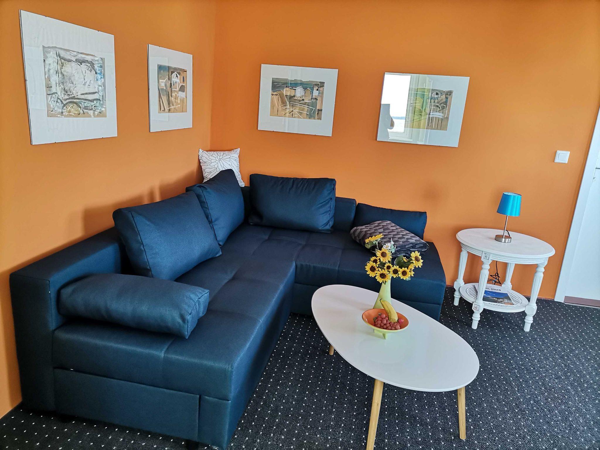 Die Wohnstube ist mit einer ausziehbaren Eckcouch, SAT-TV, Radio und kleiner Anbaureihe ausgestattet. Vom Wintergarten aus haben Sie einen wunderschönen Seeblick.