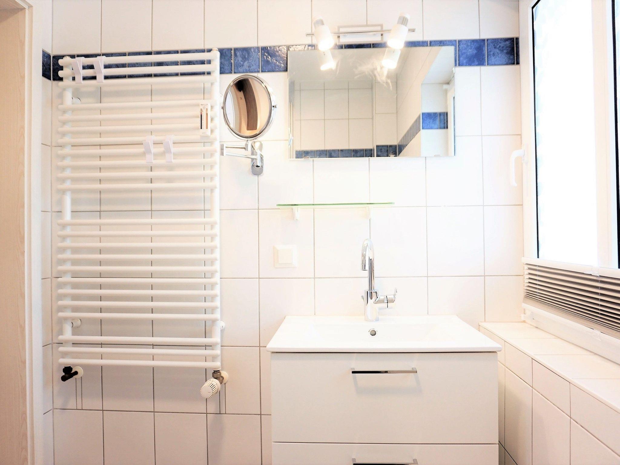 Das helle Tageslicht-Badezimmer (ebenfalls renoviert) mit Dusche und WC begrüßt sie am Morgen mit angewärmten Handtüchern. Anschließend am (ausziehbaren) Garten-Tisch auf dem Balkon gemütlich in der Sonne frühstücken > ein gelungener Start in den Tag.