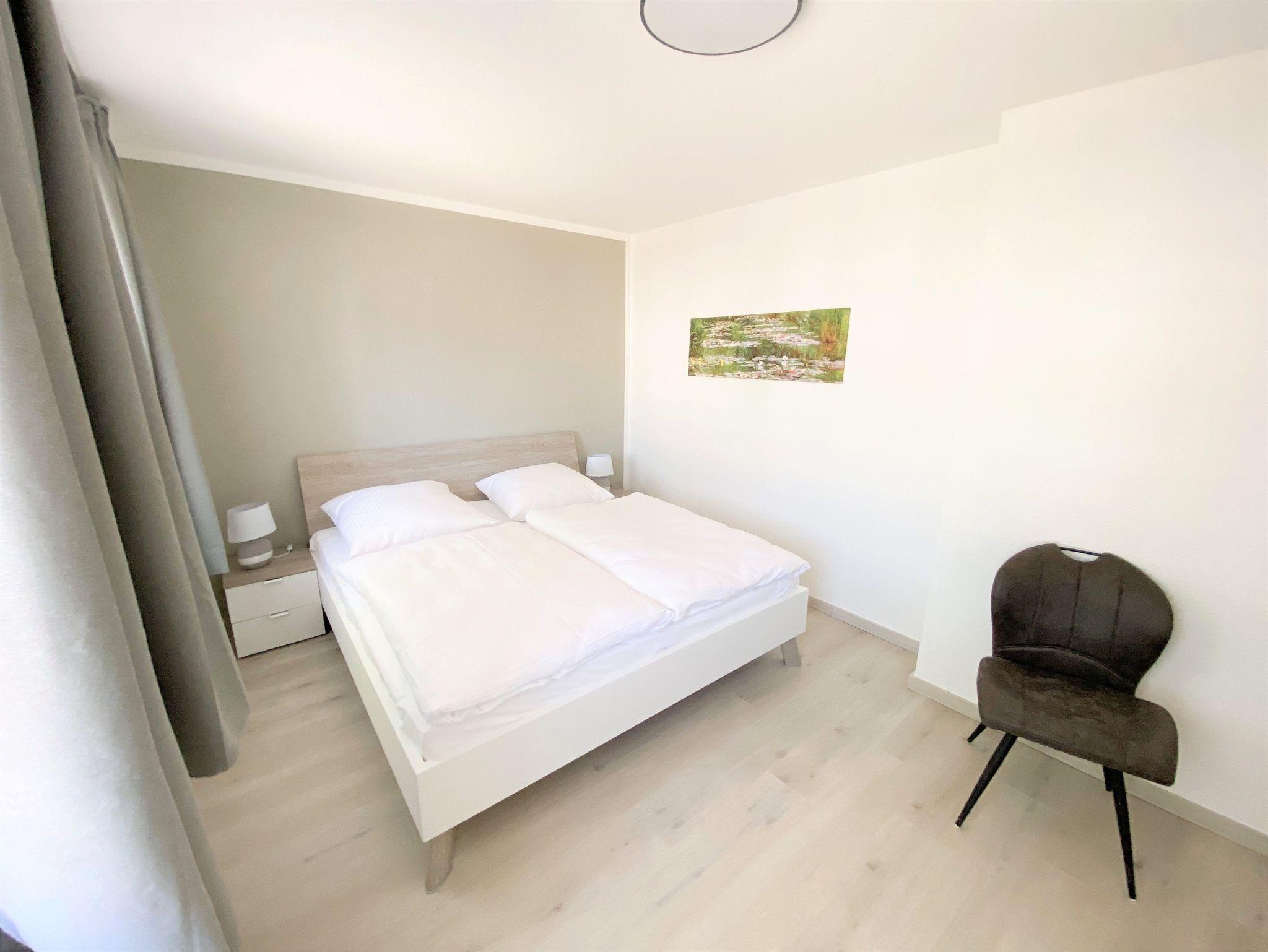 Das Schlafzimmer überzeugt mit einem bequemen Doppelbett. Verdunklungs-Vorhänge sorgen für einen ungestörten Schlaf - mit leisem Meeresrauschen.