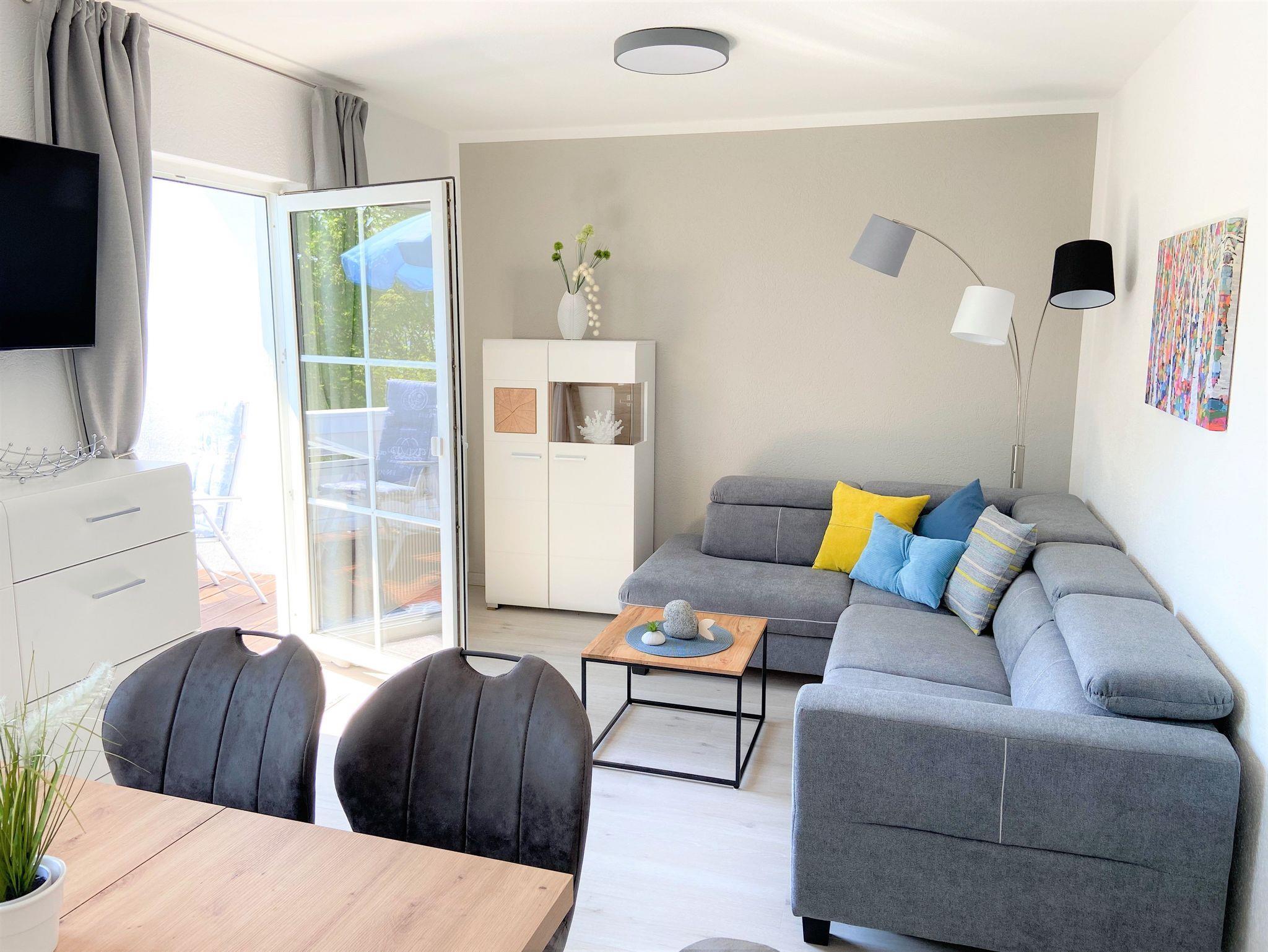 Die 2021 neu renovierte und völlig neu eingerichtete Ferienwohnung verfügt über einen großzügigen Wohn-Essbereich - mit Sicht auf den liebevoll gestalteten Garten und das Meer (durch die Uferbepflanzung).