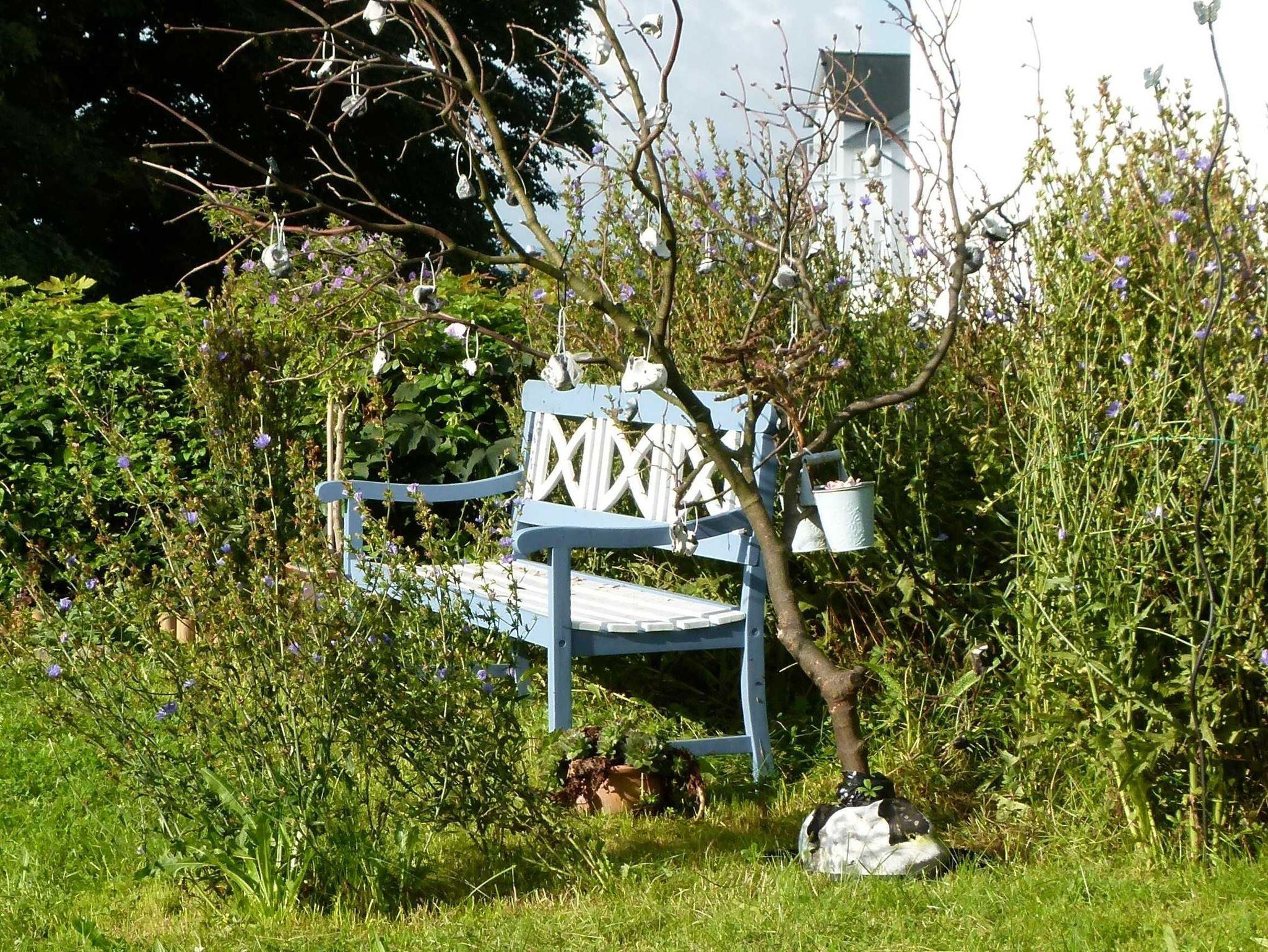 In unserem wirklich großen Garten warten - (z. B. nach einer Wanderung durch den nur wenige Minuten entfernten Nationalpark, oder einem Hafen-Spaziergang, oder....) die für die Ostsee typischen Strandkörbe auf Sie, ebenso wie eine romantische Liegebank, ein großer Grillplatz.