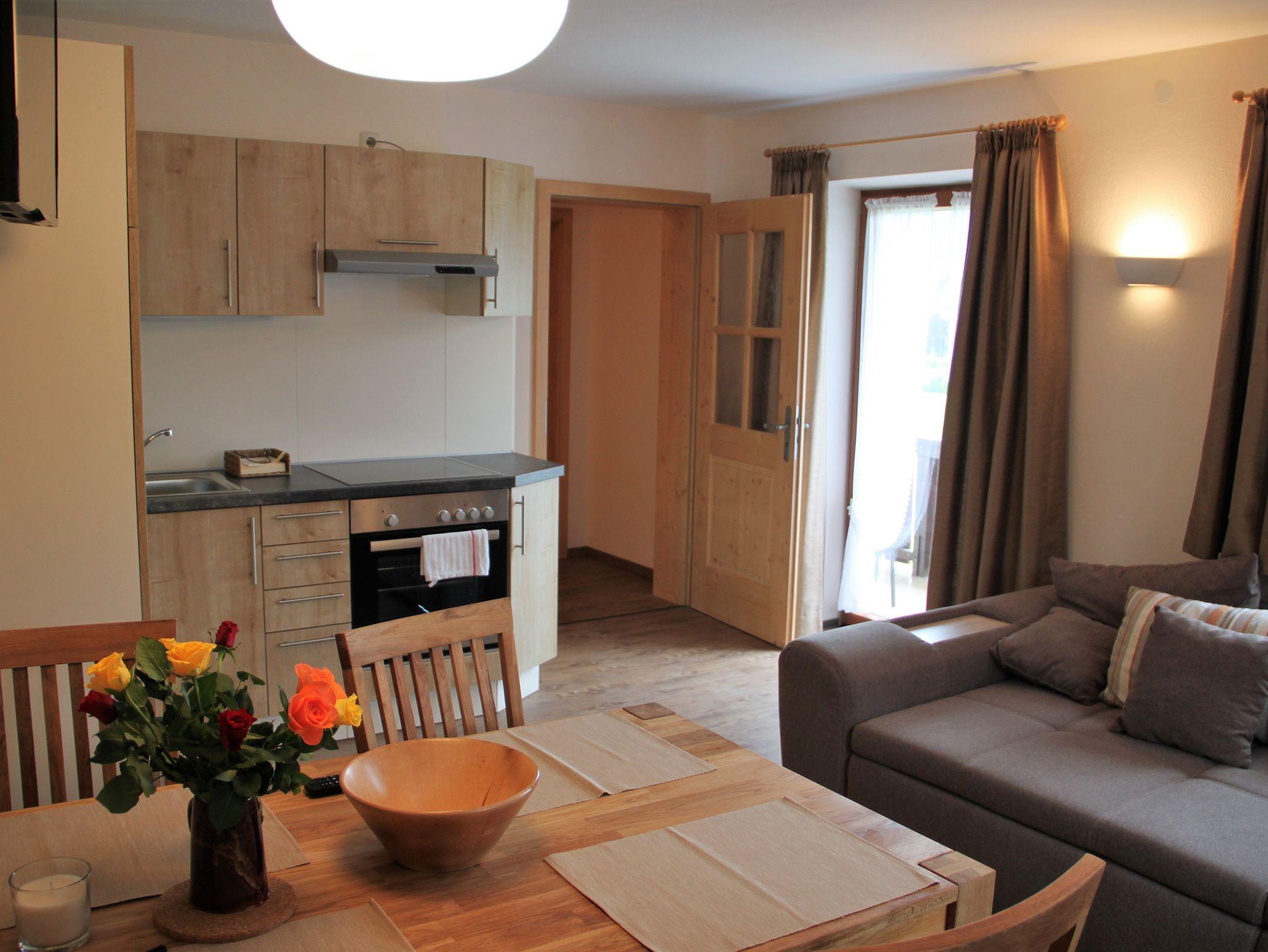 Unsere neu eingerichtete Ferienwohnung für bis zu 4 Personen hat eine Größe von 62 qm. Sie bietet 2 separate Schlafzimmer mit Doppelbetten, eine voll ausgestattete Wohnküche (Backofen, Geschirrspüler, Kaffeemaschine, Toaster, Eierkocher) mit Essgruppe, Sofa, Sat-TV und einer Mini-Stereoanlage sowie ein Bad mit Dusche/WC mit Fön. Von unserem großen Süd-West-Balkon lässt sich die traumhafte Bergwelt genießen.