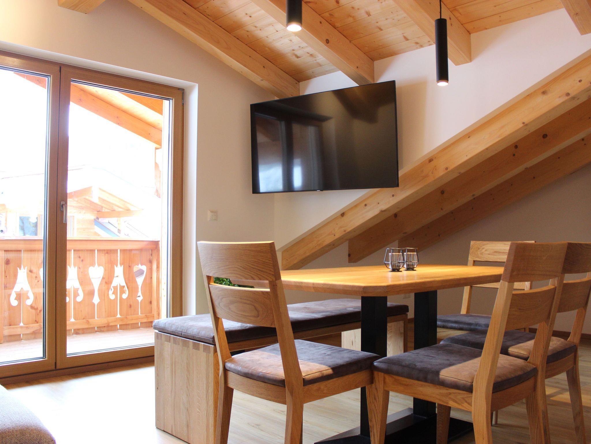 Der großzügig, kombinierte Wohn- Essraum mit integrierter Küche und Esstisch ist Zentrum der modern und gehoben ausgestatteten Ferienwohnung.