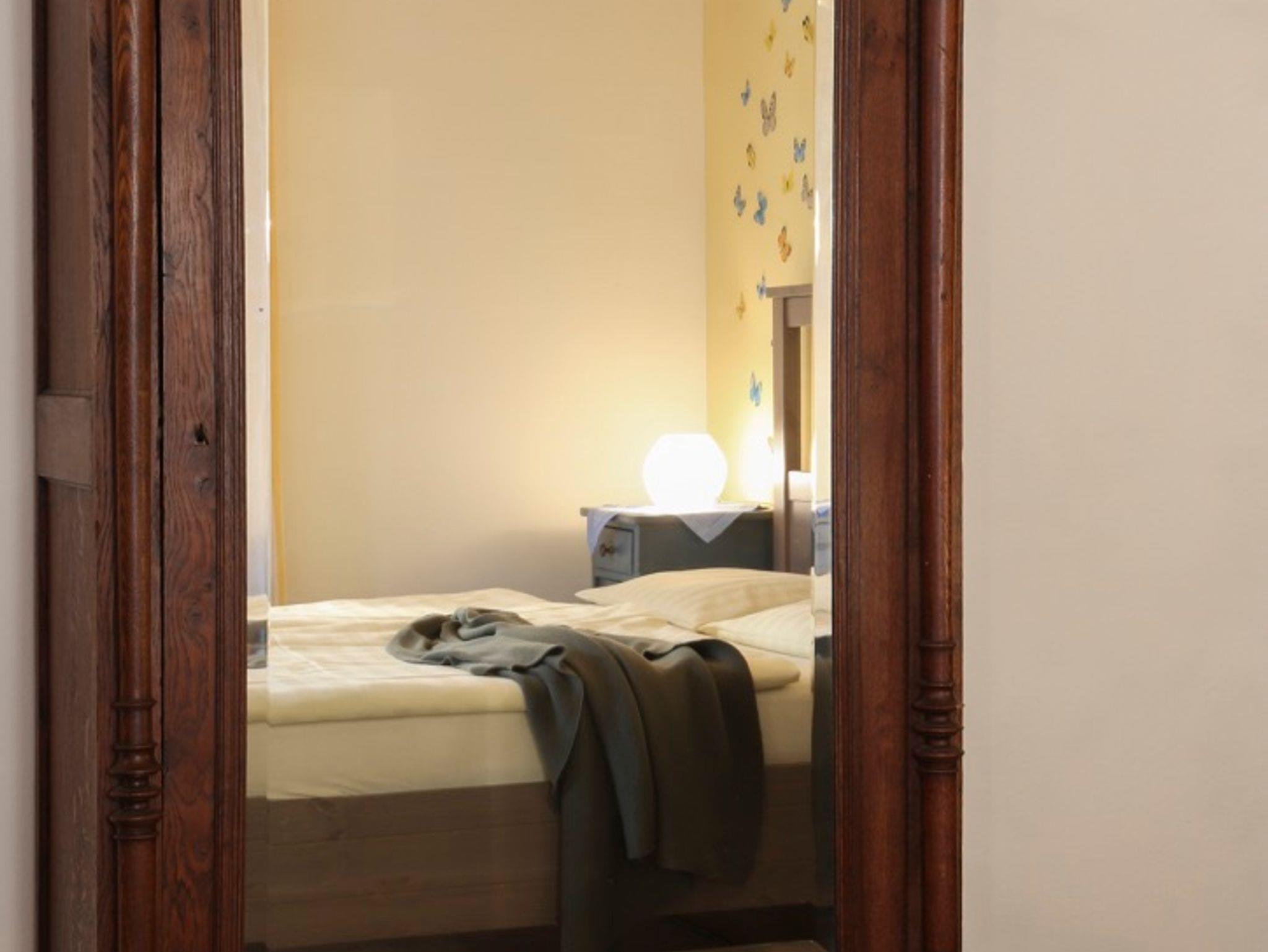 Das in einem Mix aus antiken und modernen Möbeln eingerichtete Doppelzimmer mit Dusche/WC wird durch eine bequeme Couch besonders gemütlich. Vom Balkon aus blickt man in Richtung Watzmann & Königssee.
