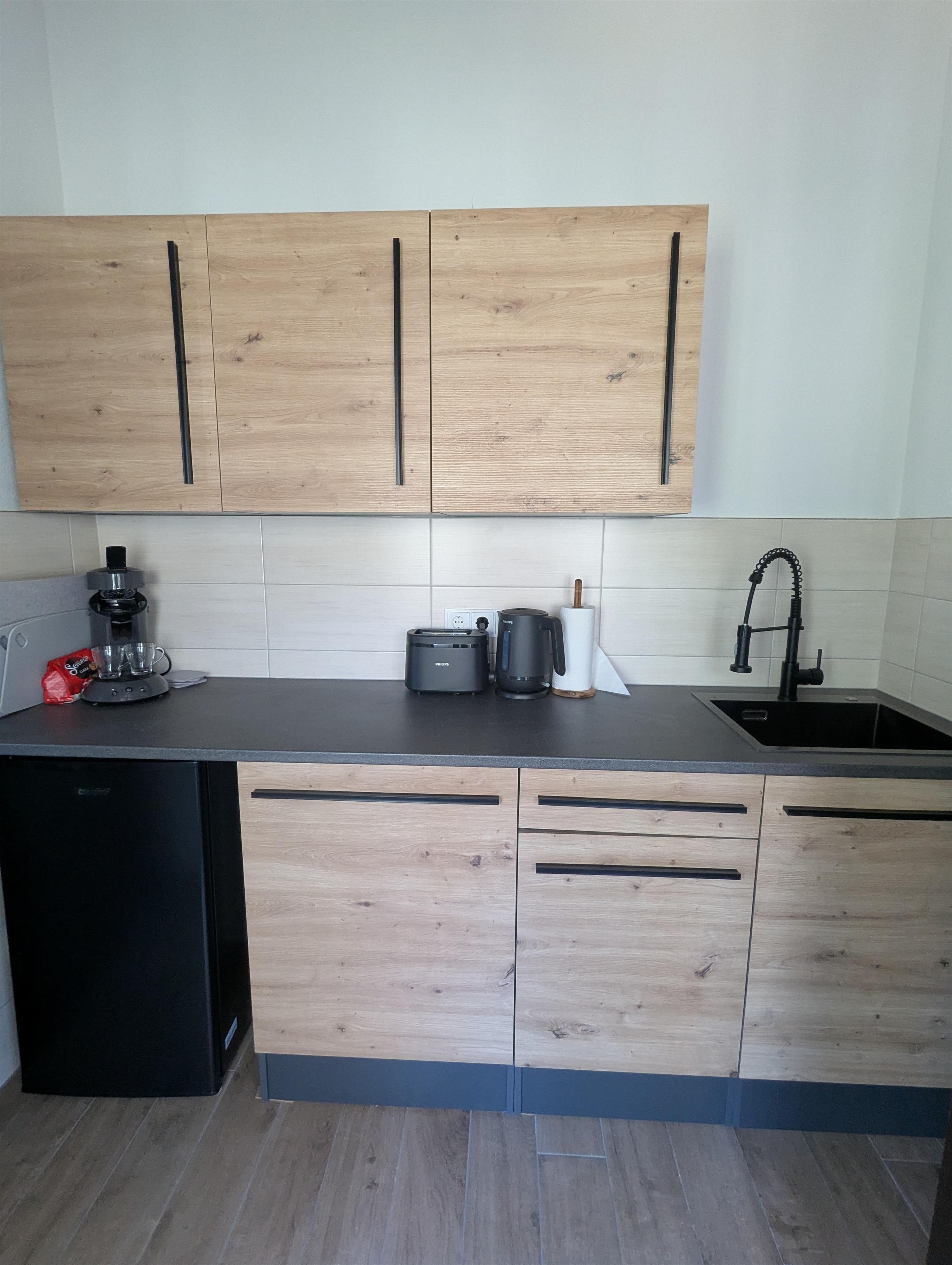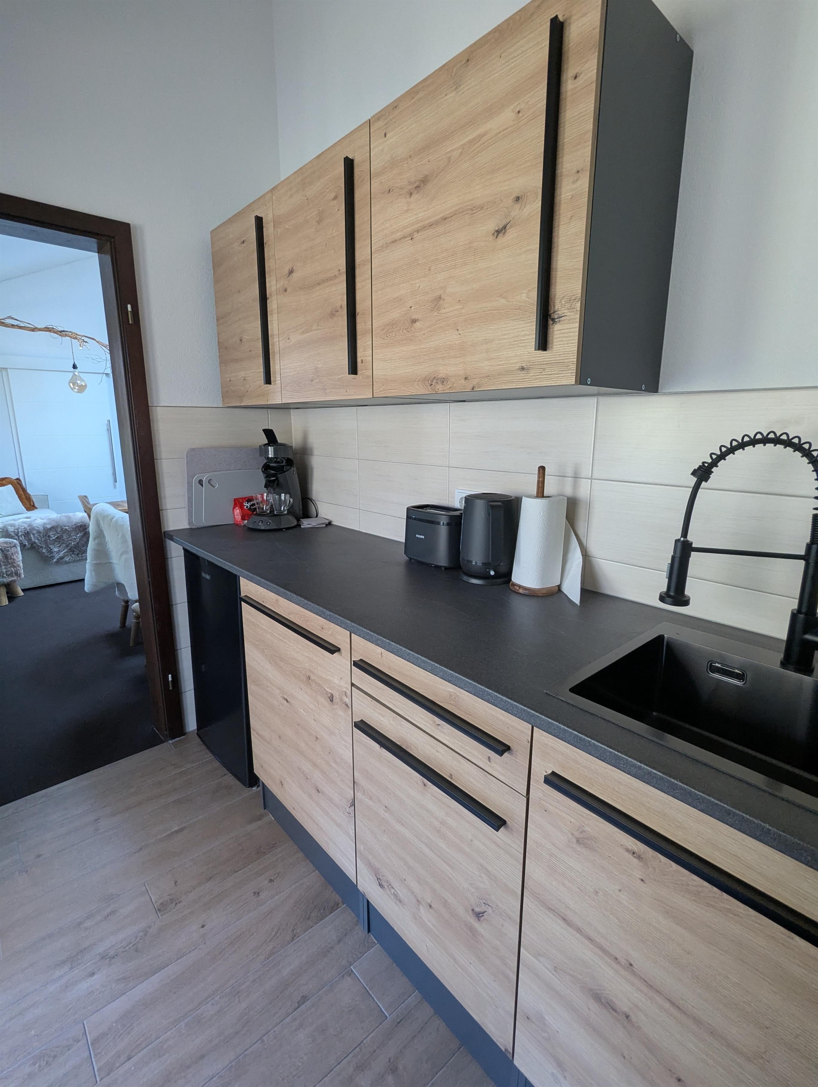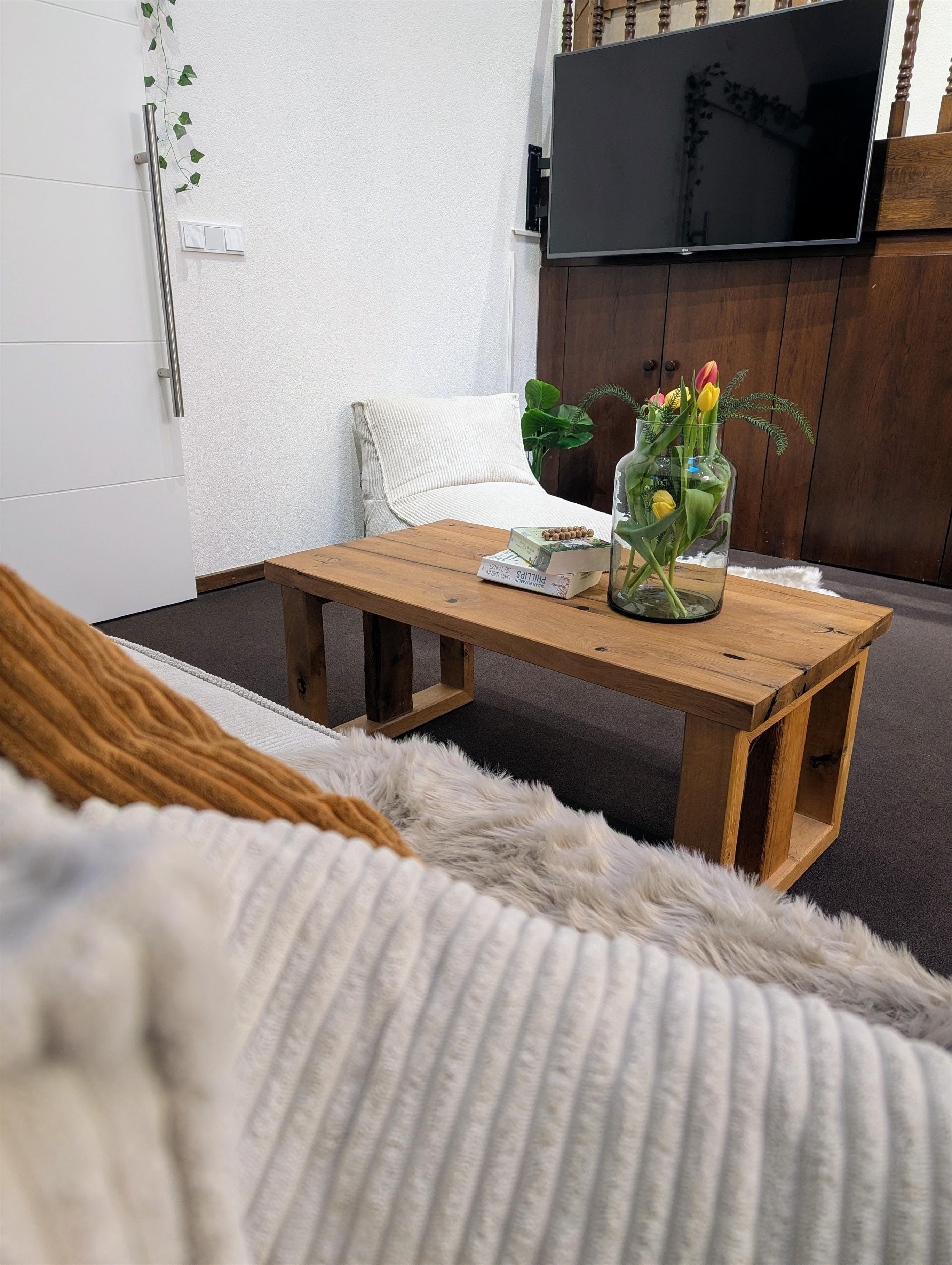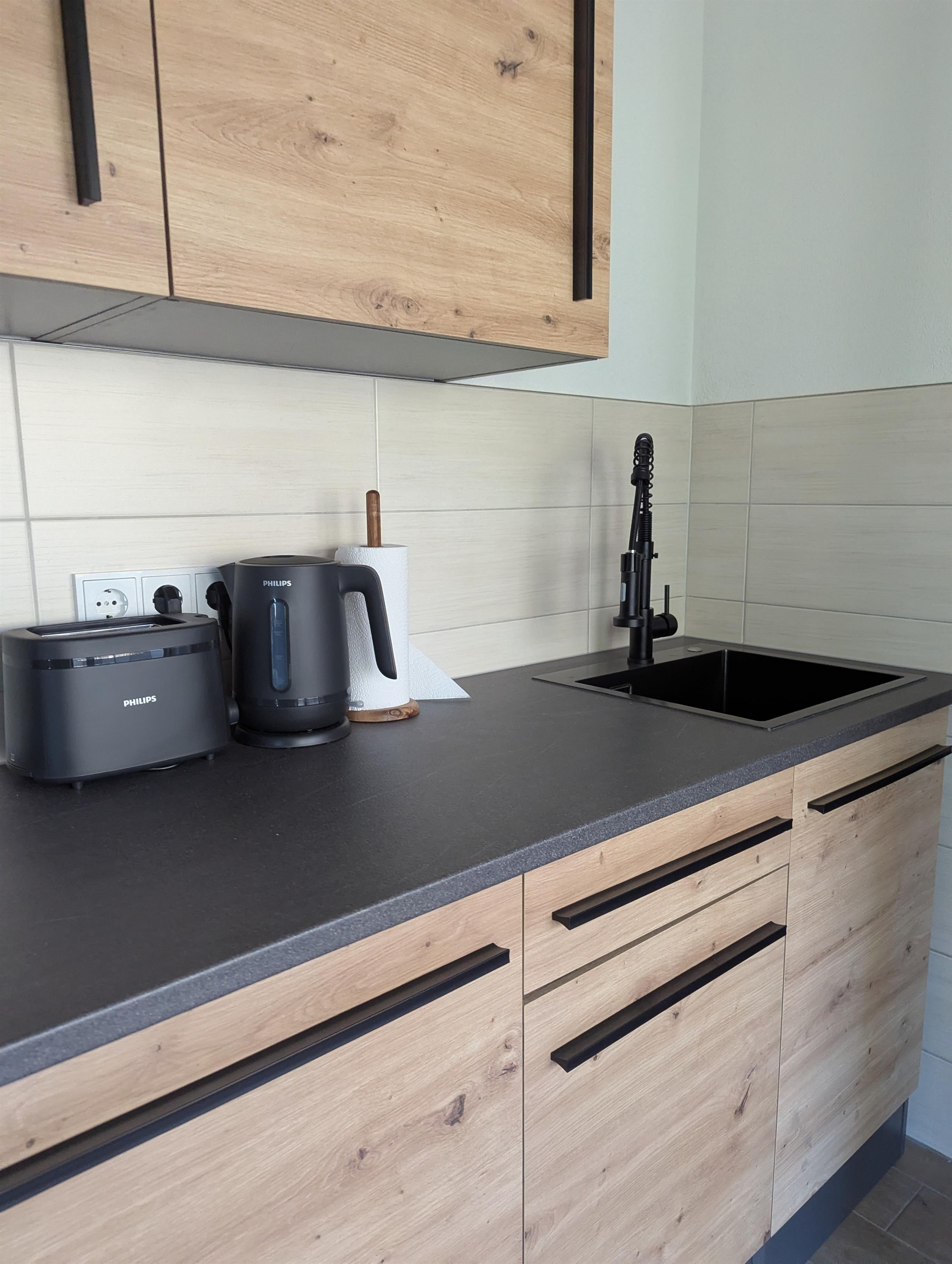 Die voll ausgestattete Küchenzeile bietet alles, was du brauchst: Herdplatten, Senseo-Kaffeemaschine, Toaster, Wasserkocher sowie Geschirr und Utensilien. Im gemütlichen Essbereich findet die ganze Familie Platz, um entspannt zusammen zu essen.