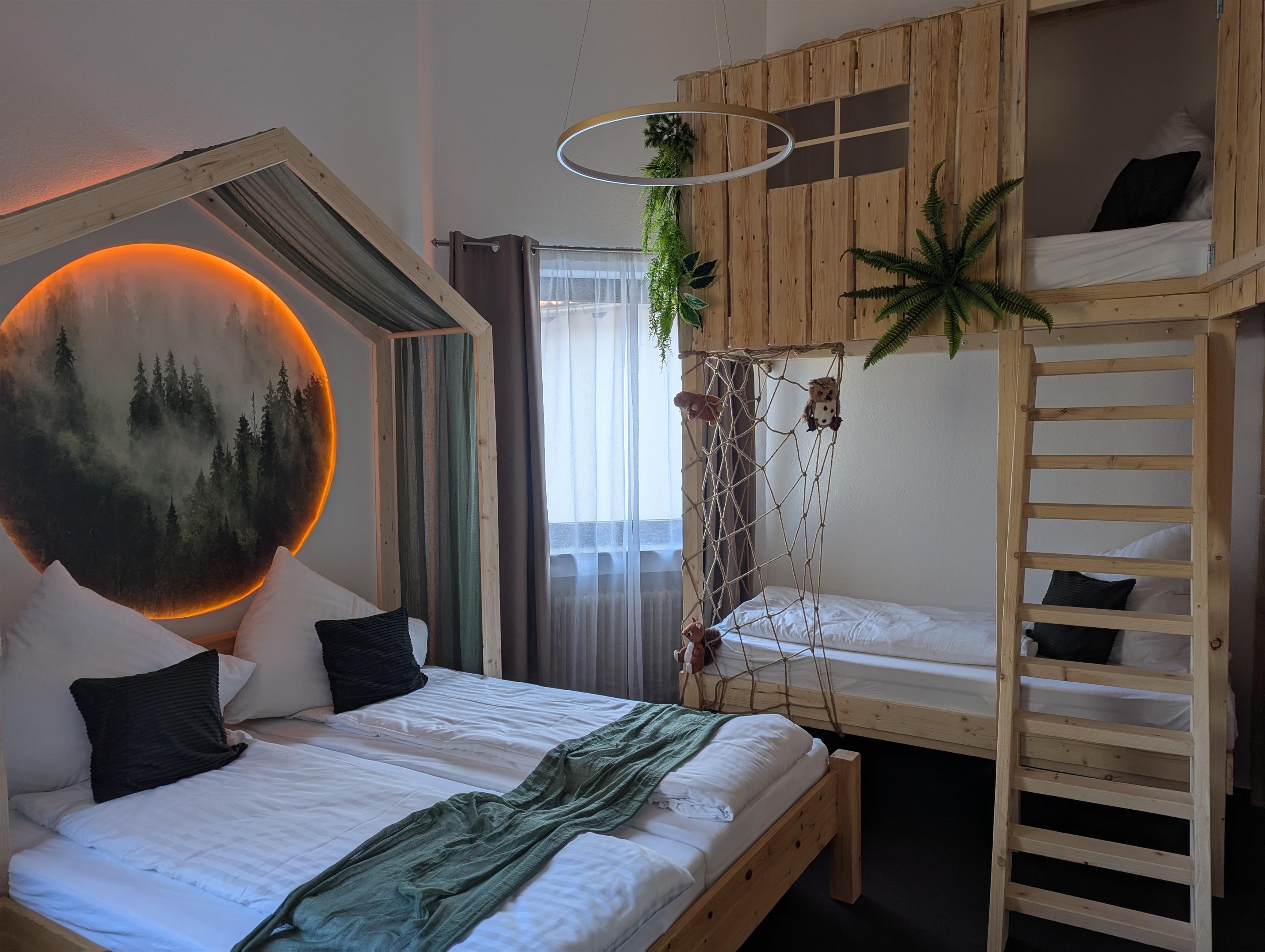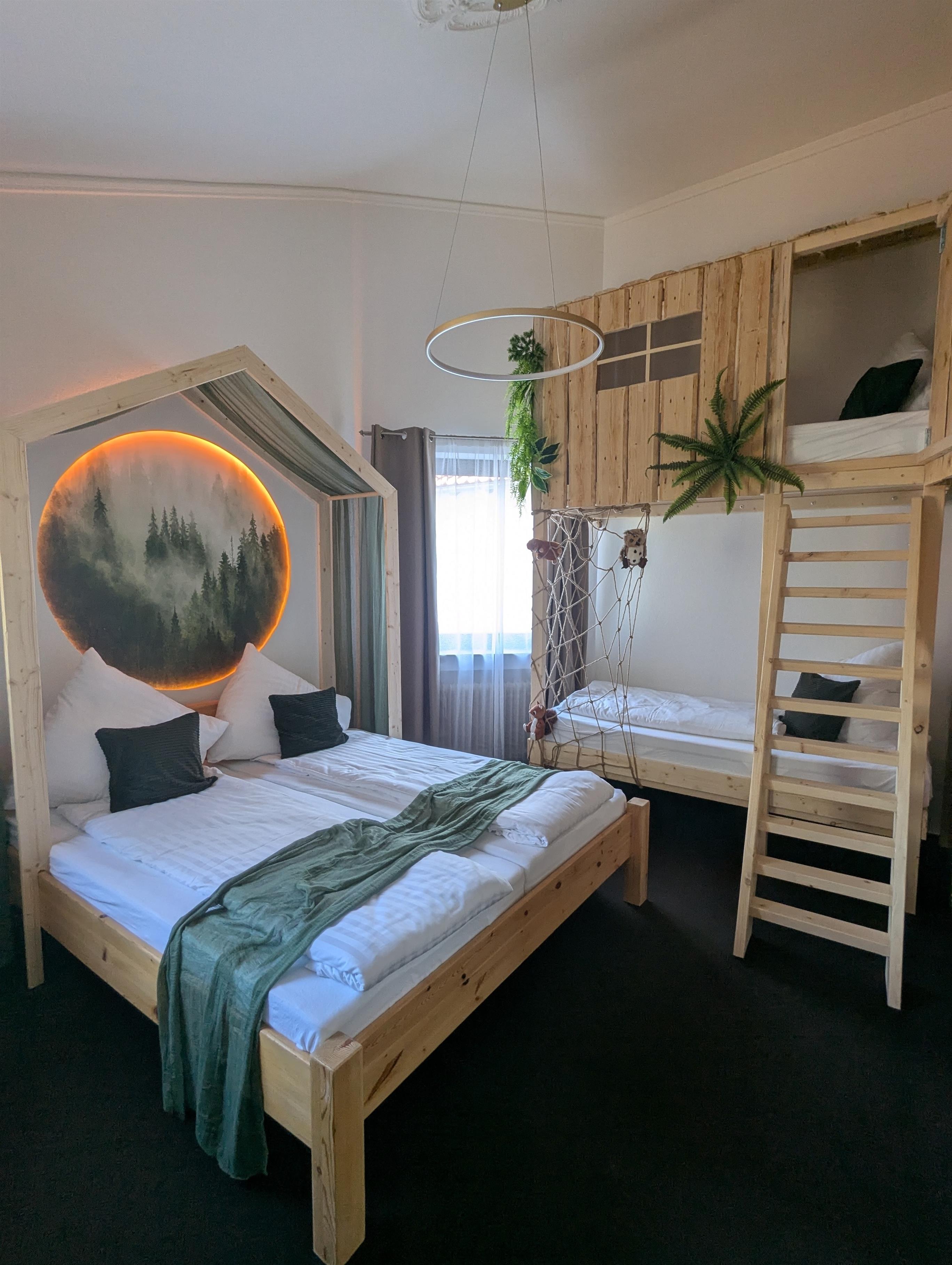 Die Baumhaussuite ist der perfekte Rückzugsort für Familien mit abenteuerlustigen Kindern. Das Highlight ist das Stockbett im Stil eines Baumhauses, das kleine Entdecker begeistert. Ein kleiner privater Balkon bietet entspannte Momente im Freien. Der Wohnbereich mit Schlafsofa, das Platz für zwei zusätzliche Gäste bietet, lädt zu gemütlichen Abenden ein. Für die Kleinen gibt es eine eigene Spielecke, eine Leseecke für ruhige Stunden und eine Auswahl an Gesellschaftsspielen für gemeinsame Erlebnisse.