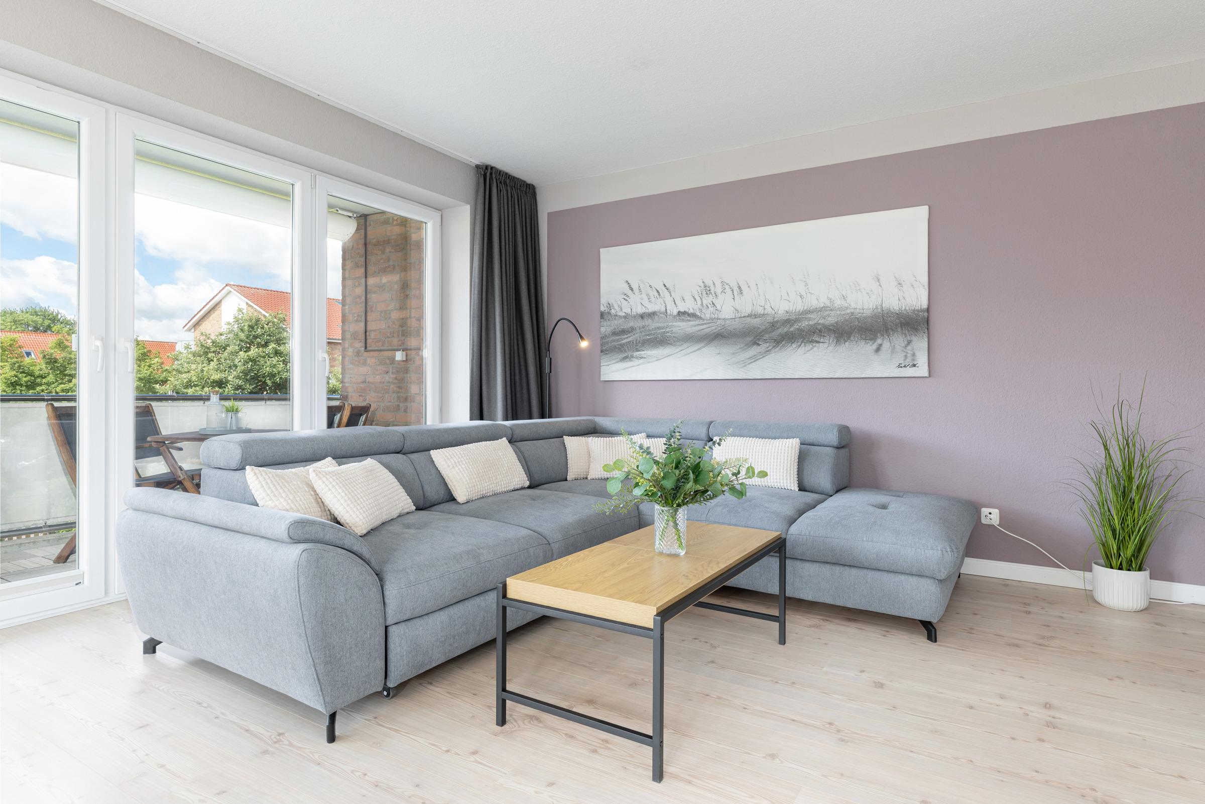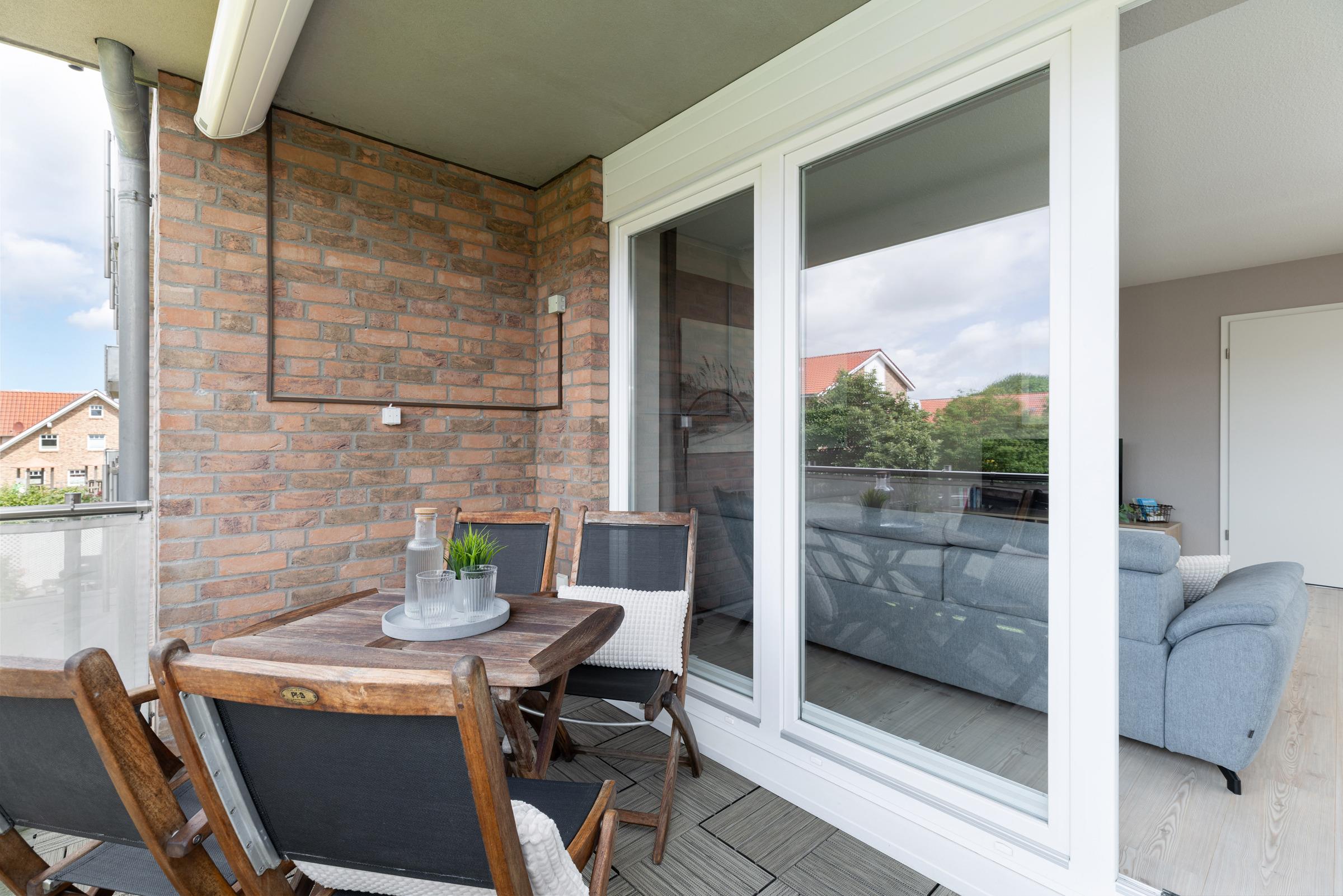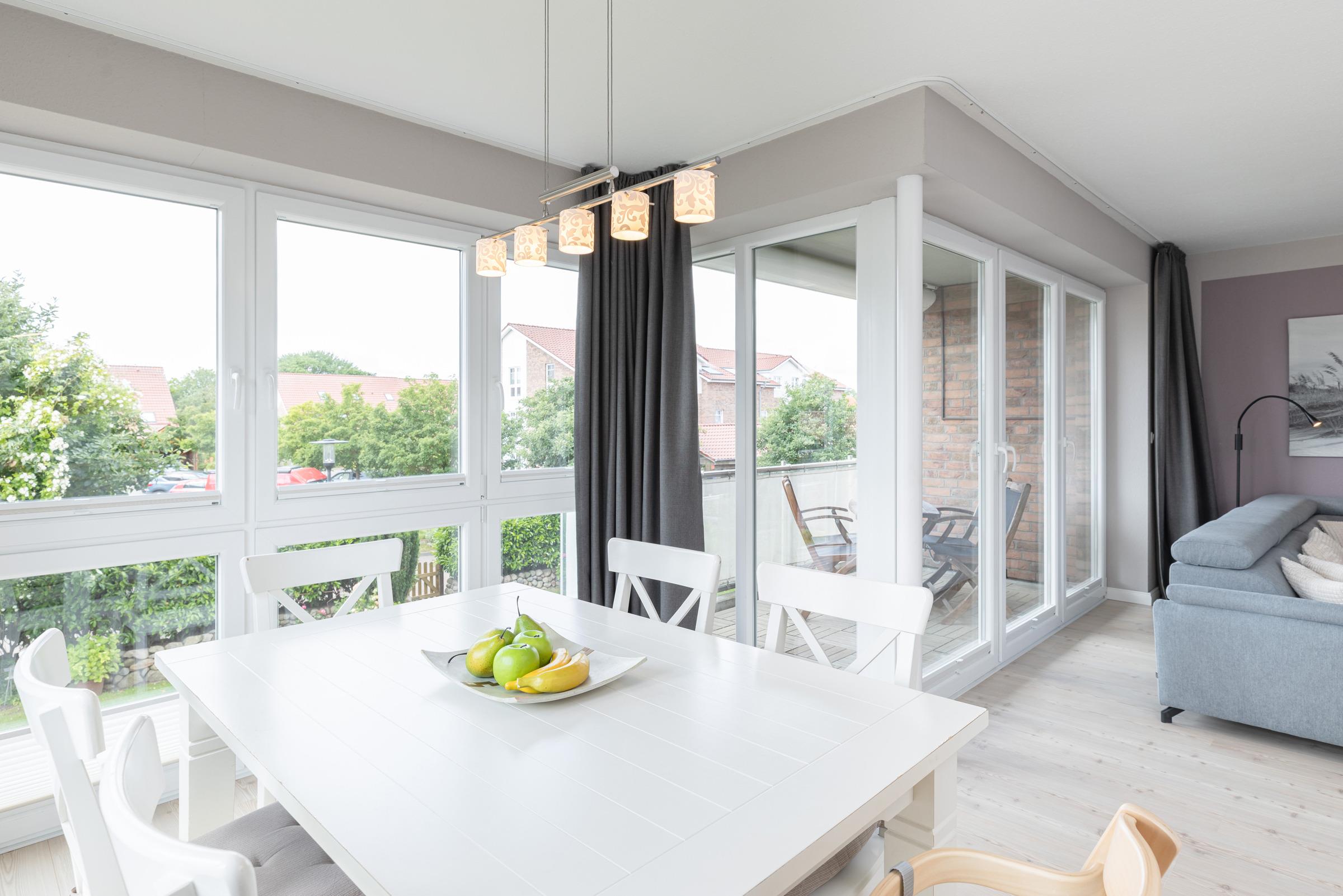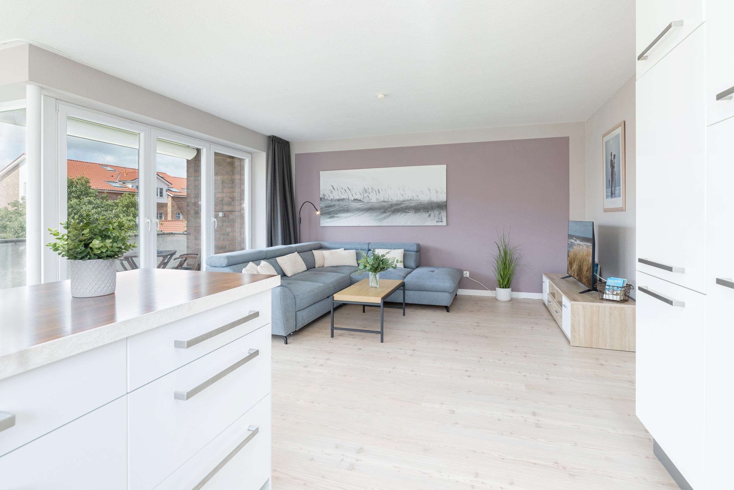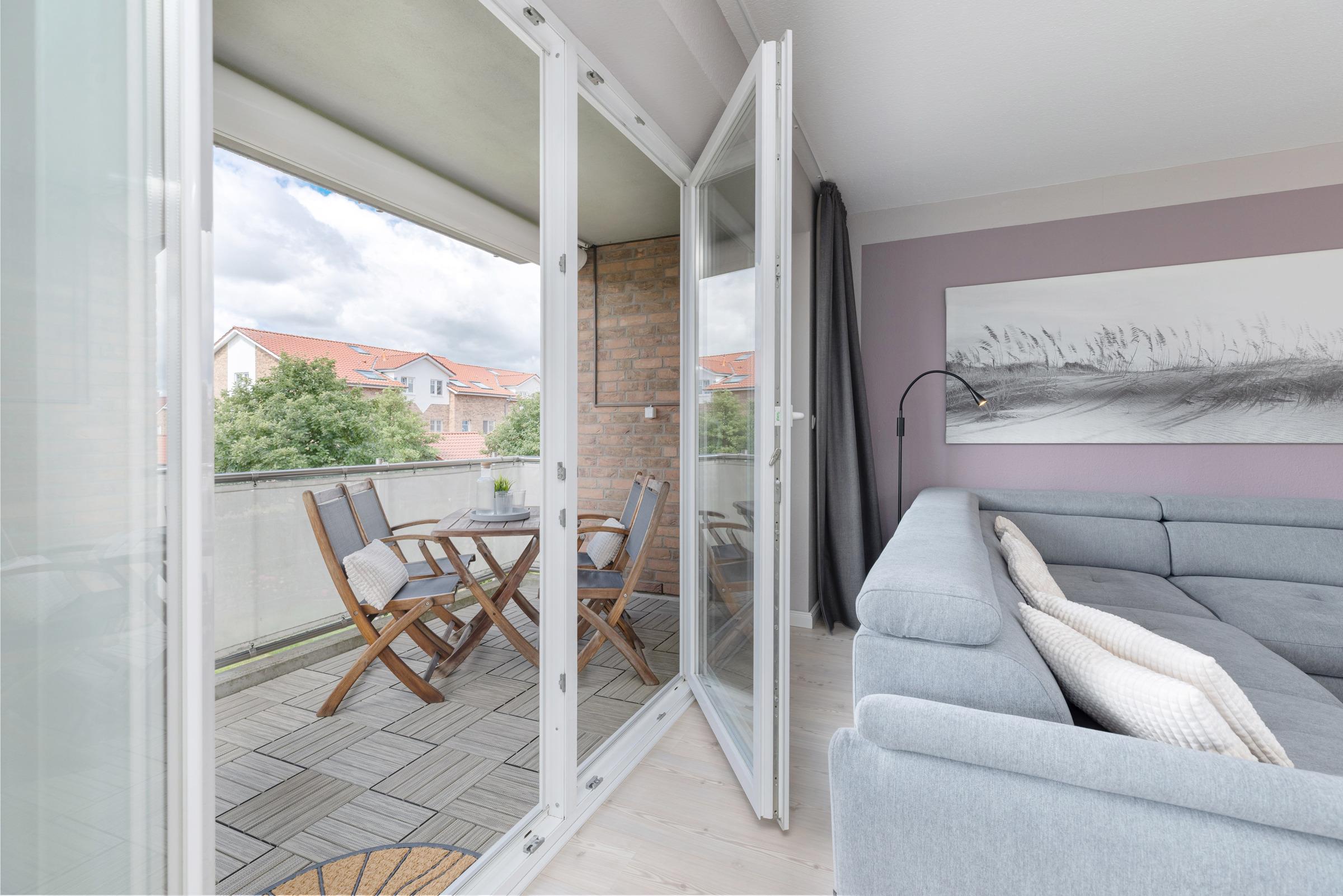 Der helle Wohnbereich ist modern möbliert und verfügt über eine gemütliche Sitzecke und TV. Große Fenster sorgen für ein angenehmes Raumgefühl. Vom Wohnbereich gelangen Sie auf den überdachten Süd-Balkon mit Gartenmöbeln und Markise – ideal, um die Sonne zu genießen oder den Abend entspannt ausklingen zu lassen.