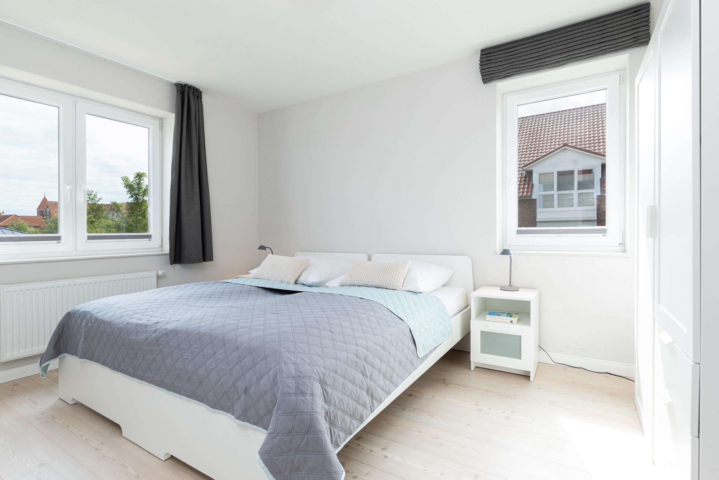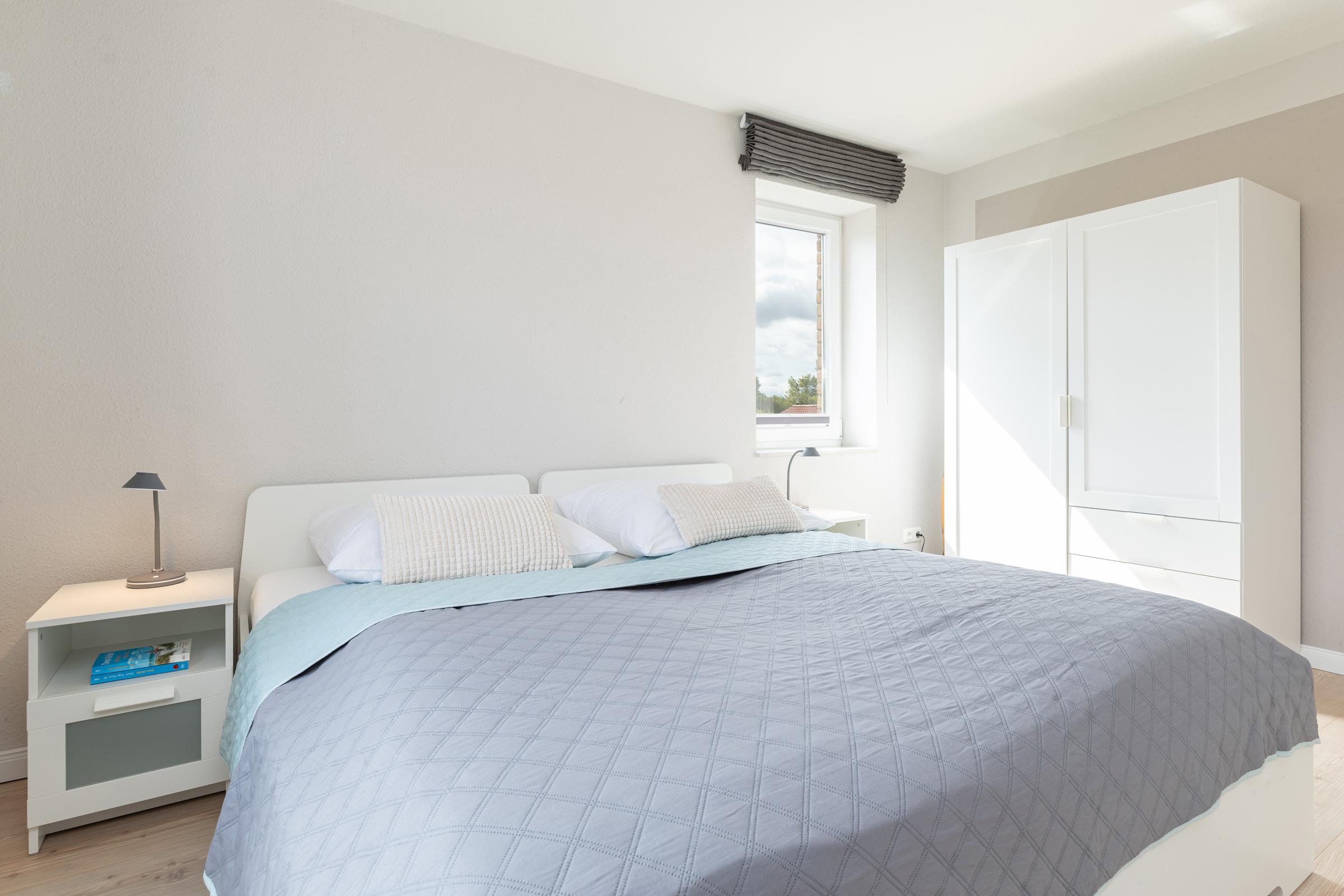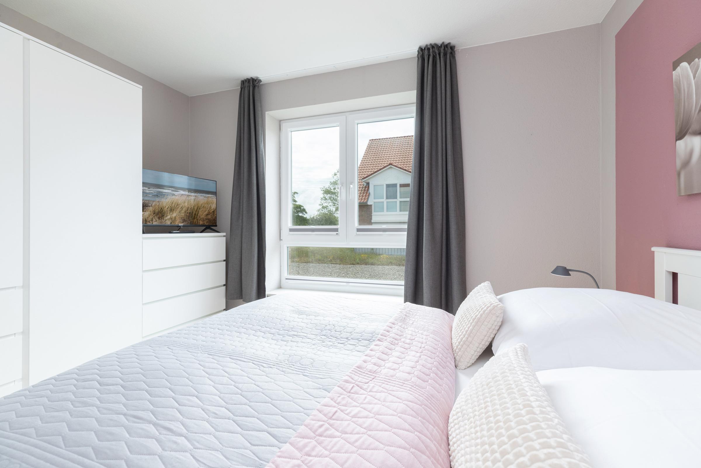 Schlafzimmer 1: 1 Doppelbett (2x 80x200 cm), Kleiderschrank, TV, Verdunkelung: Plissee und Vorhang, kein Platz für ein Babybett vorhanden
