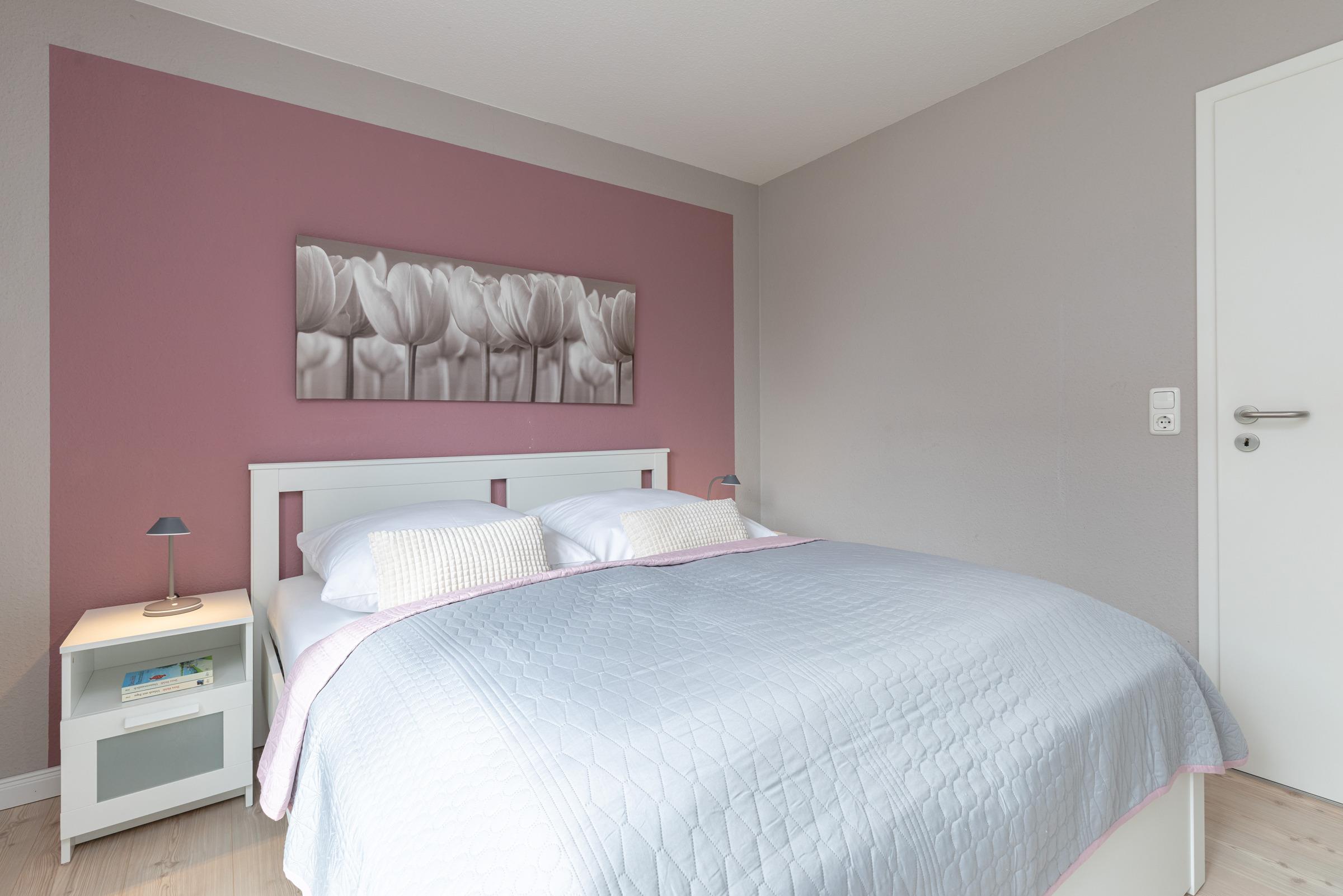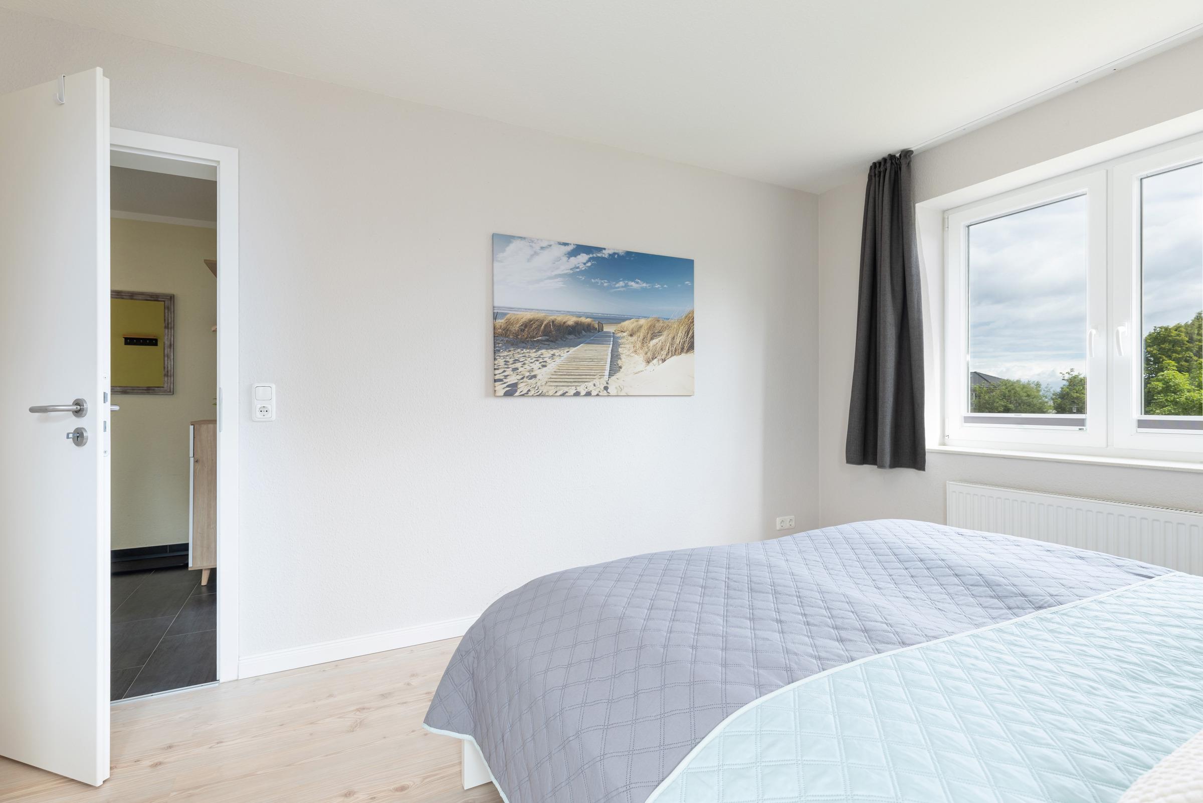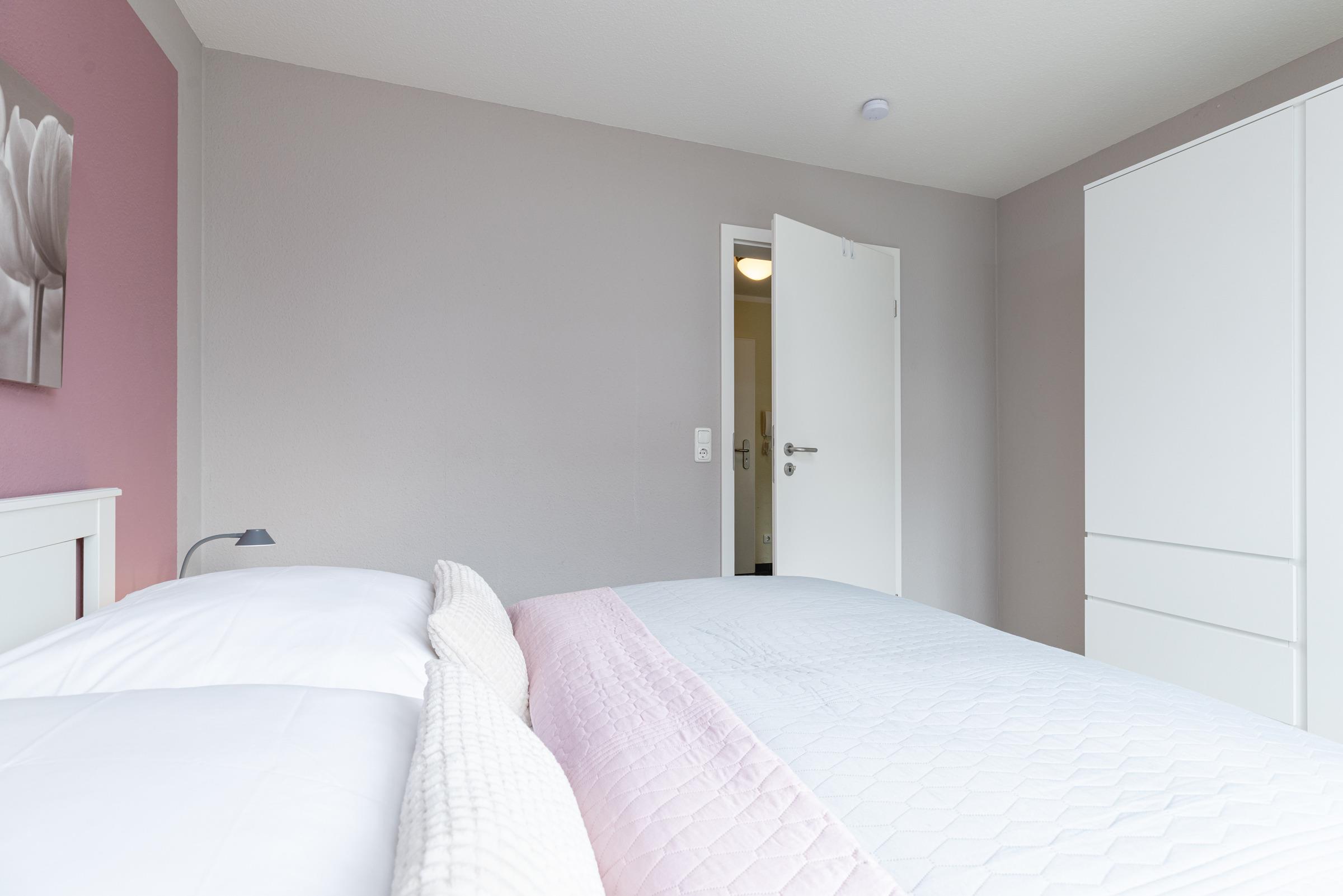 Schlafzimmer 1: 1 Doppelbett (2x 80x200 cm), Kleiderschrank, TV, Verdunkelung: Plissee und Vorhang, kein Platz für ein Babybett vorhanden
