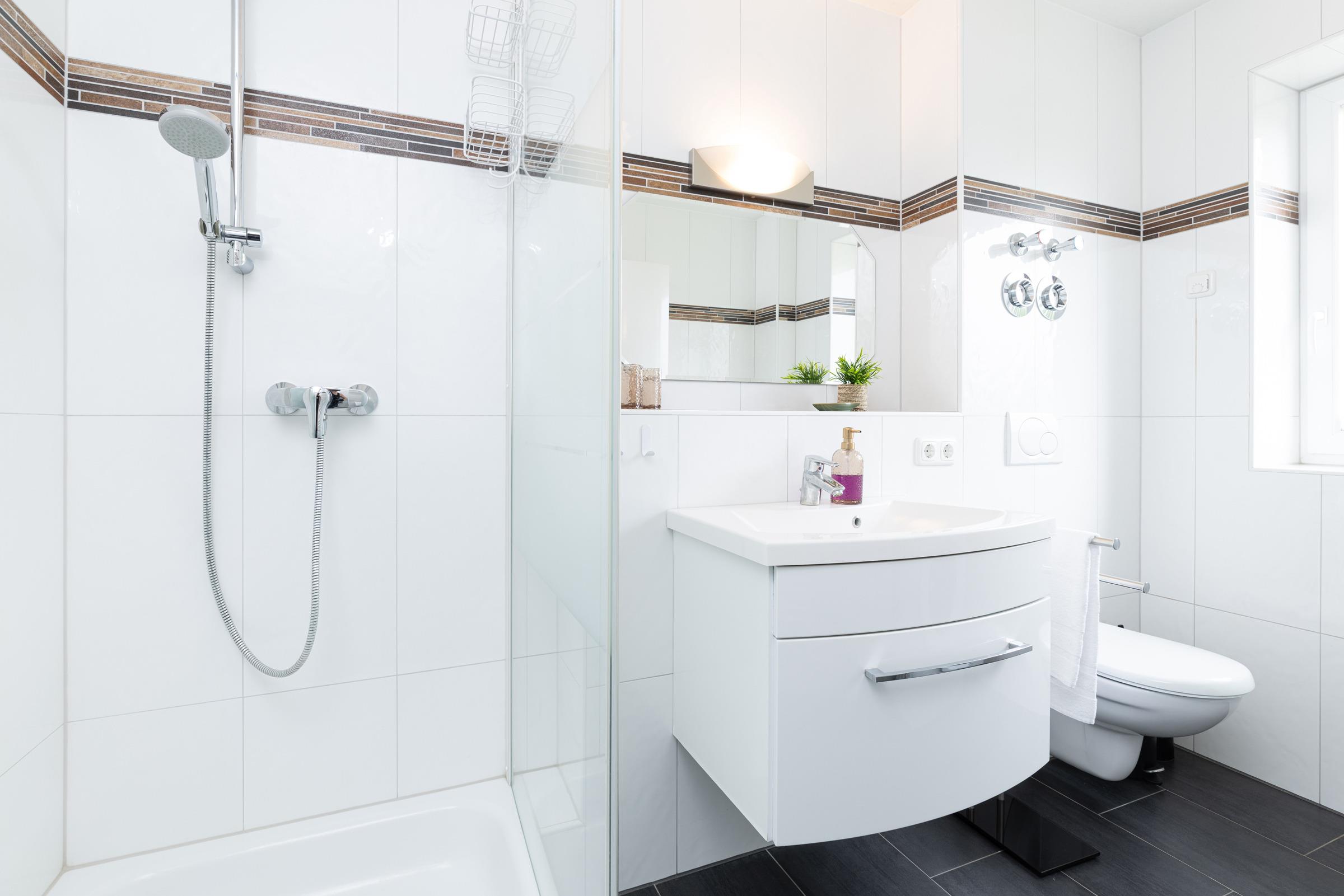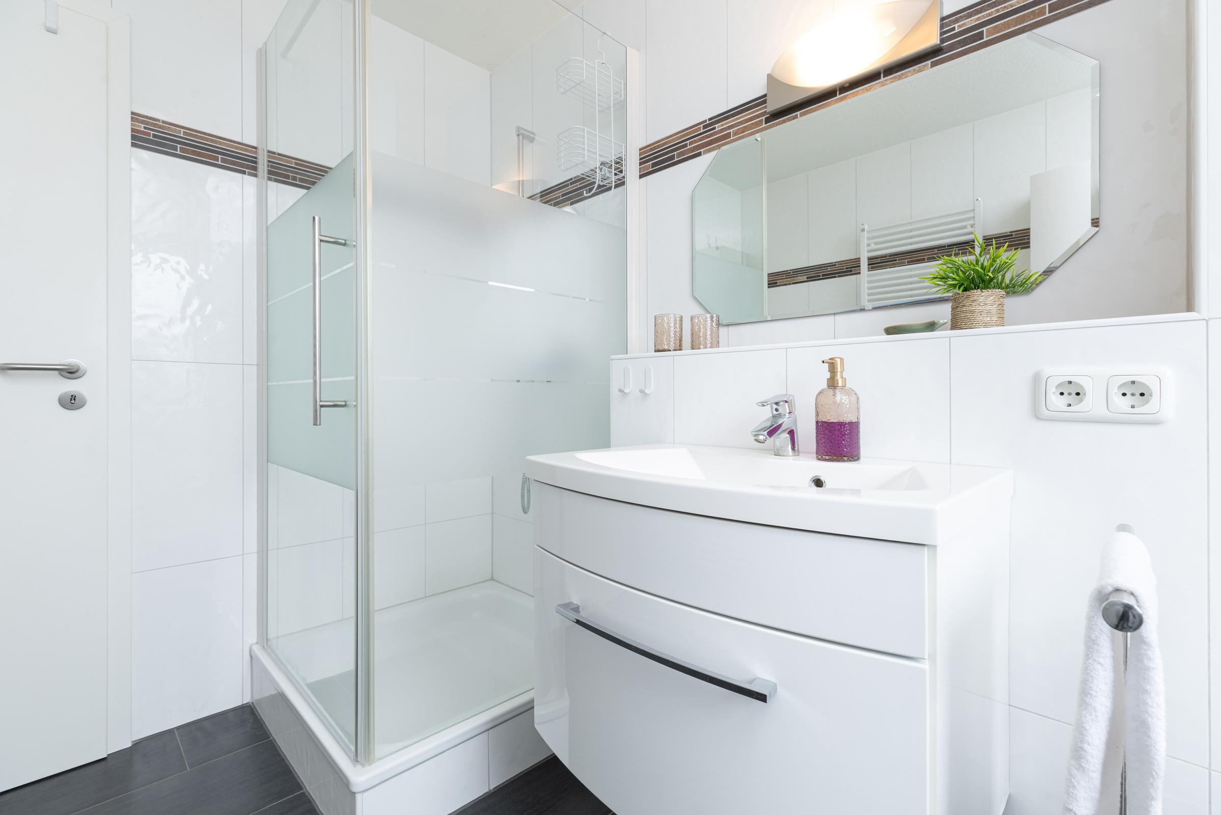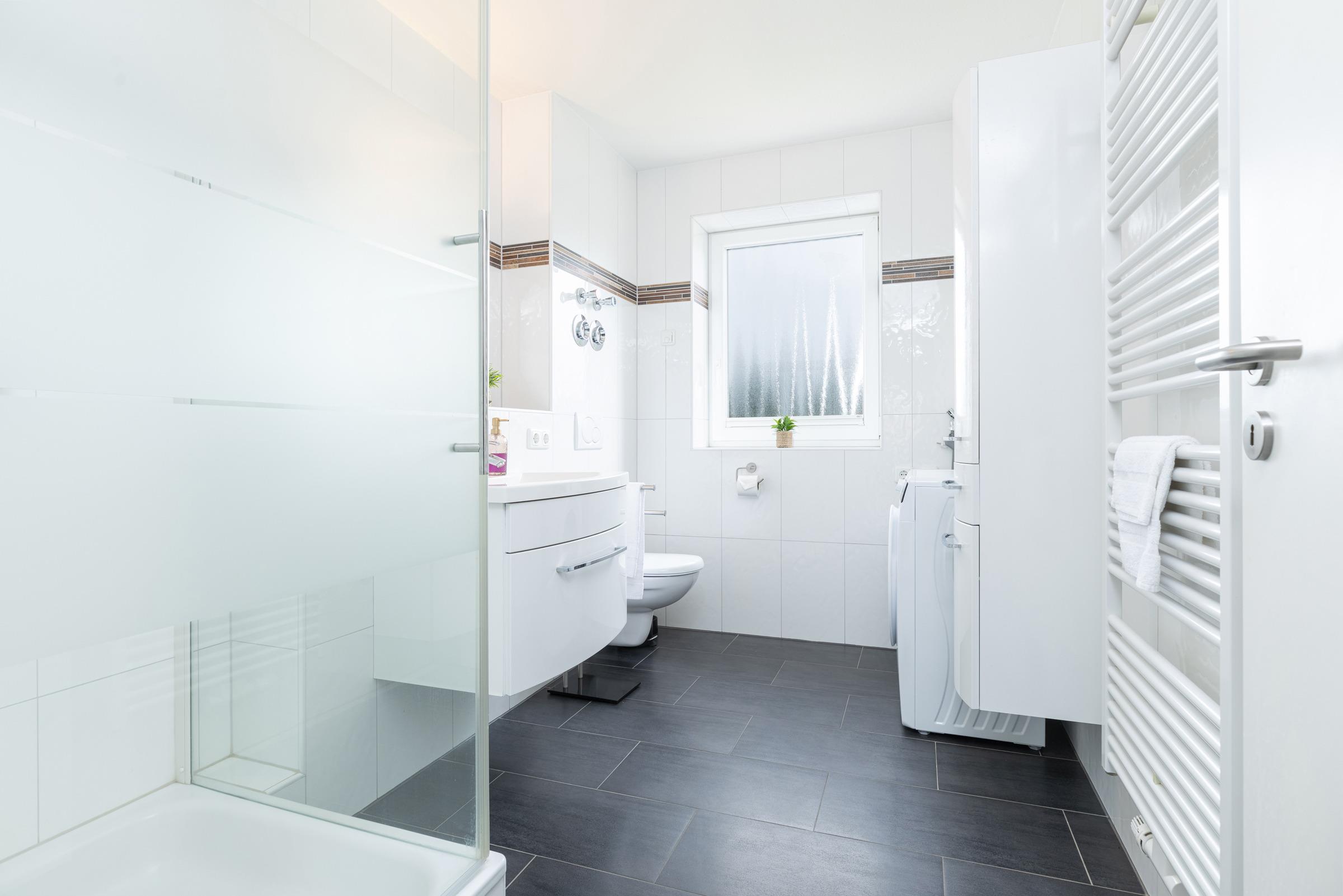 Zwei separate Schlafzimmer sorgen für erholsame Nächte – eines davon ist mit einem Doppelbett, das andere mit zwei Einzelbetten ausgestattet. Ein Kinderhochstuhl ist ebenfalls vorhanden. Im Bad finden Sie eine Dusche mit Wanne (Duschwanne), WC, Waschbecken, Haartrockner sowie eine Fußbodenheizung für zusätzlichen Komfort.